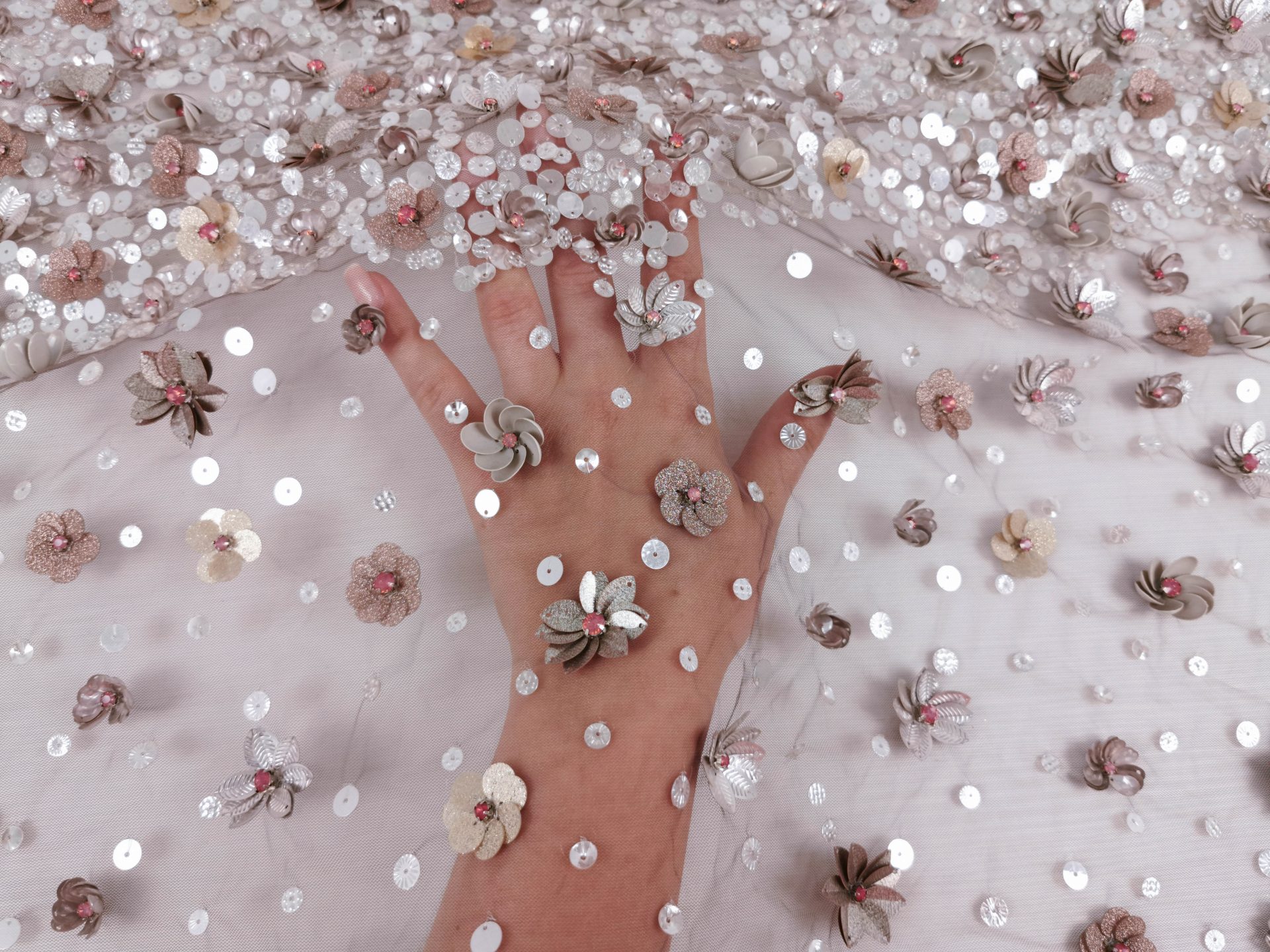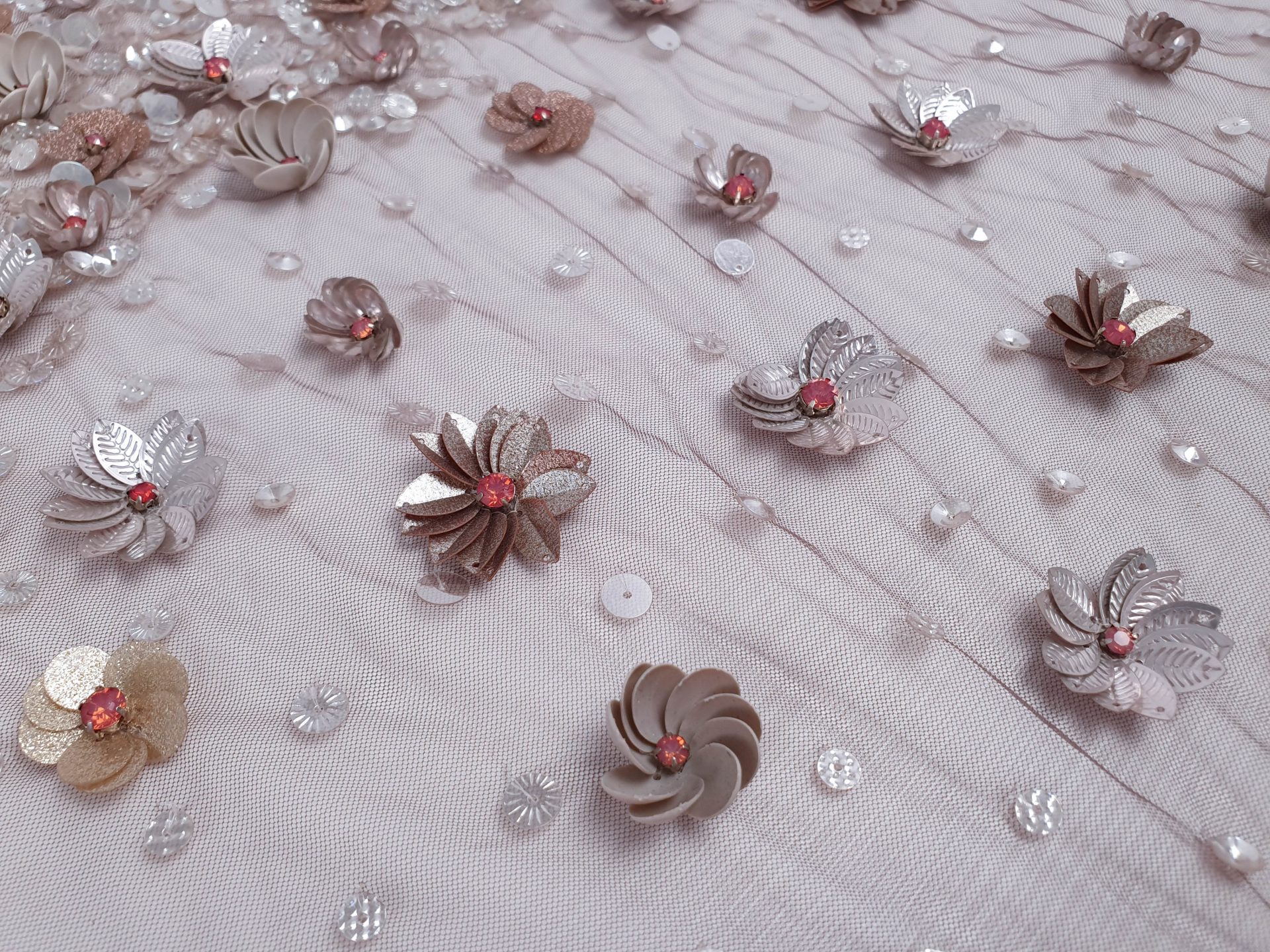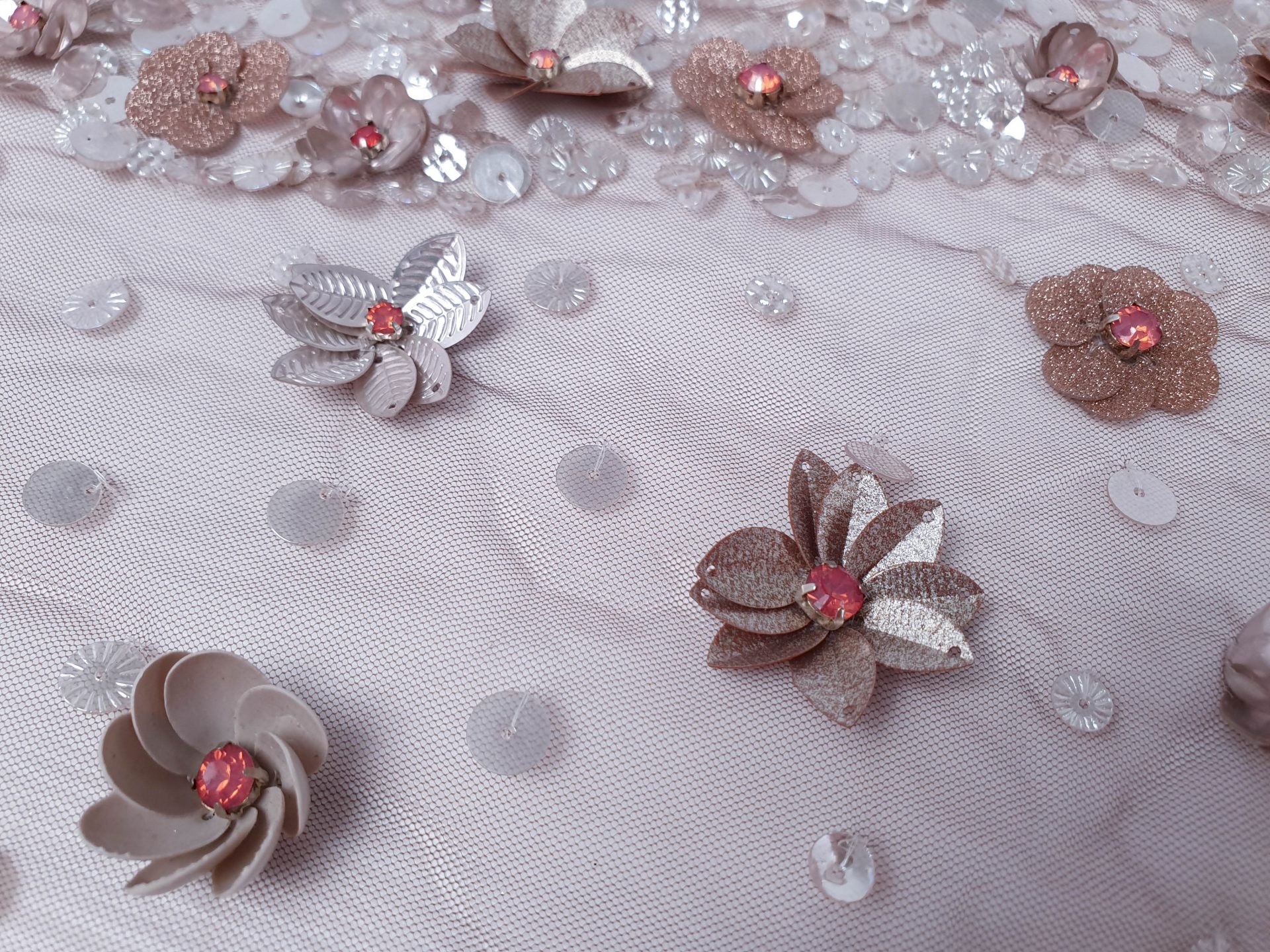 Culoare broderie: tonuri de gri argintiu, nude auriu, grej