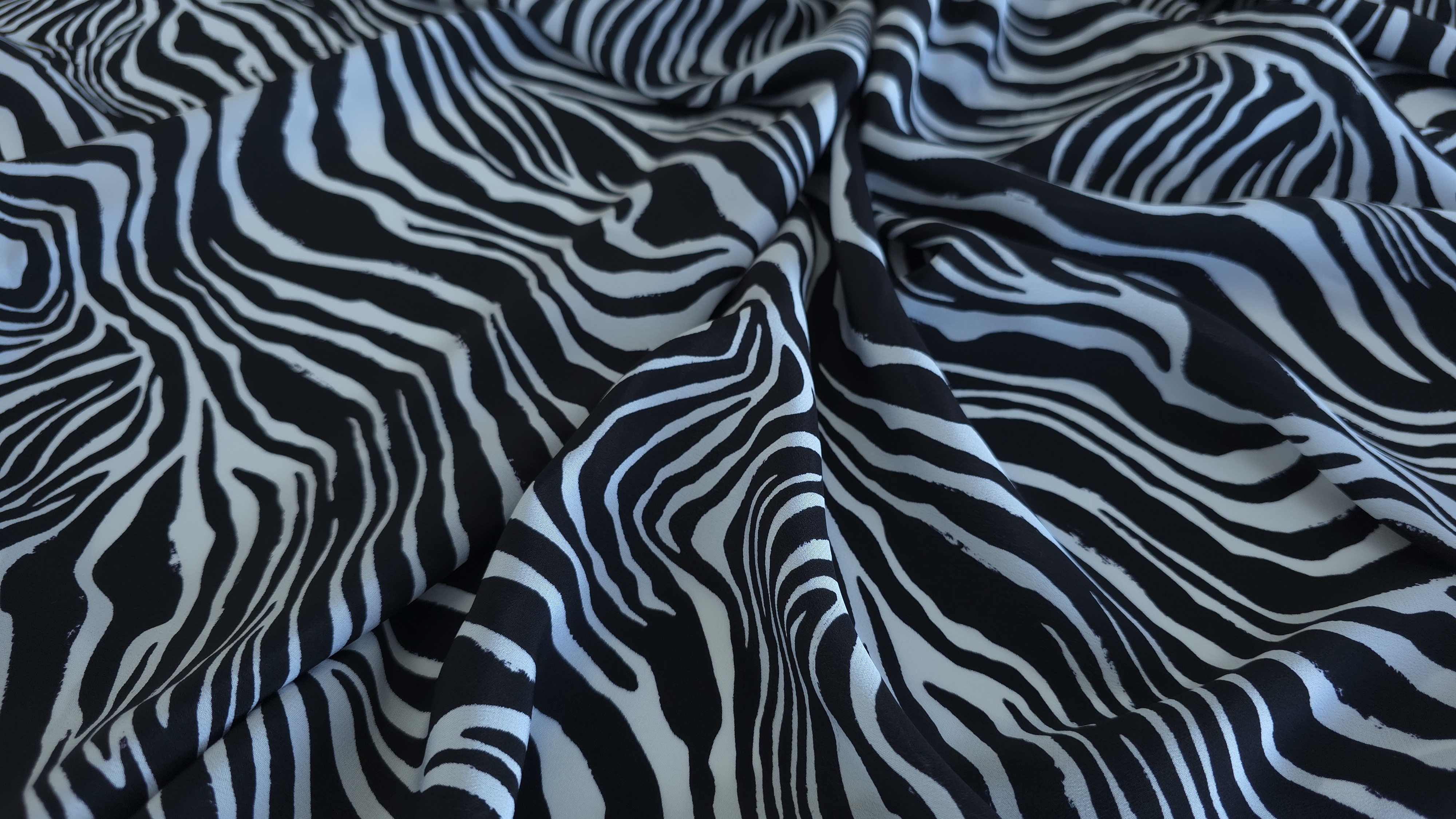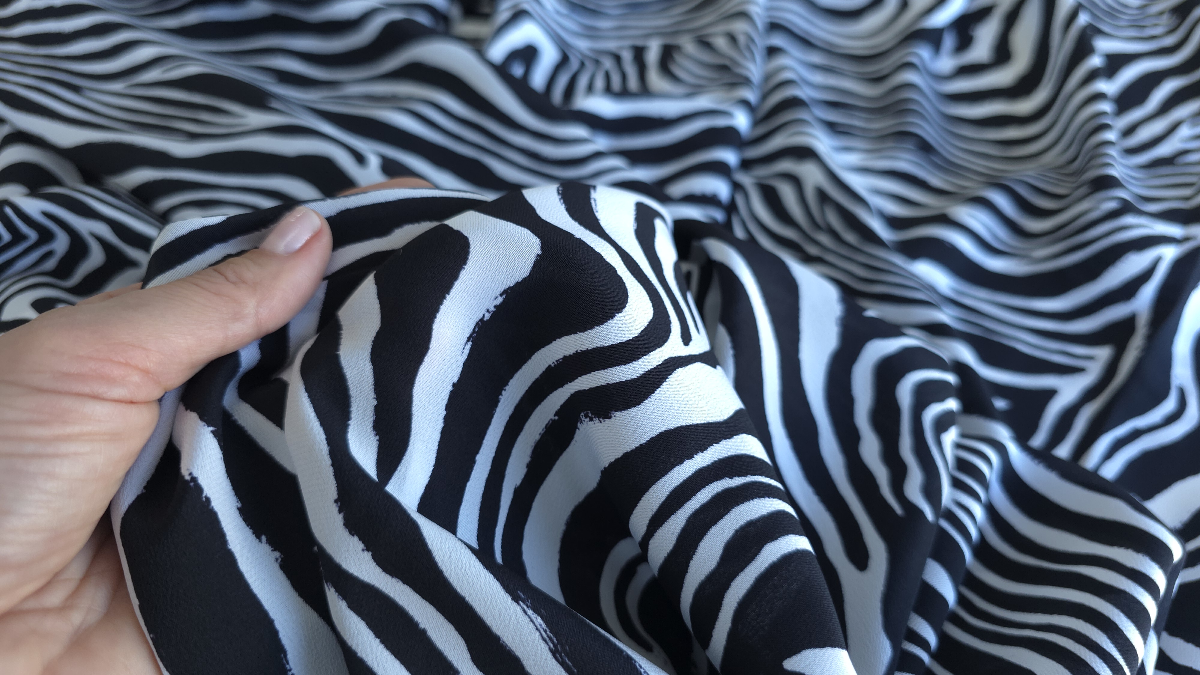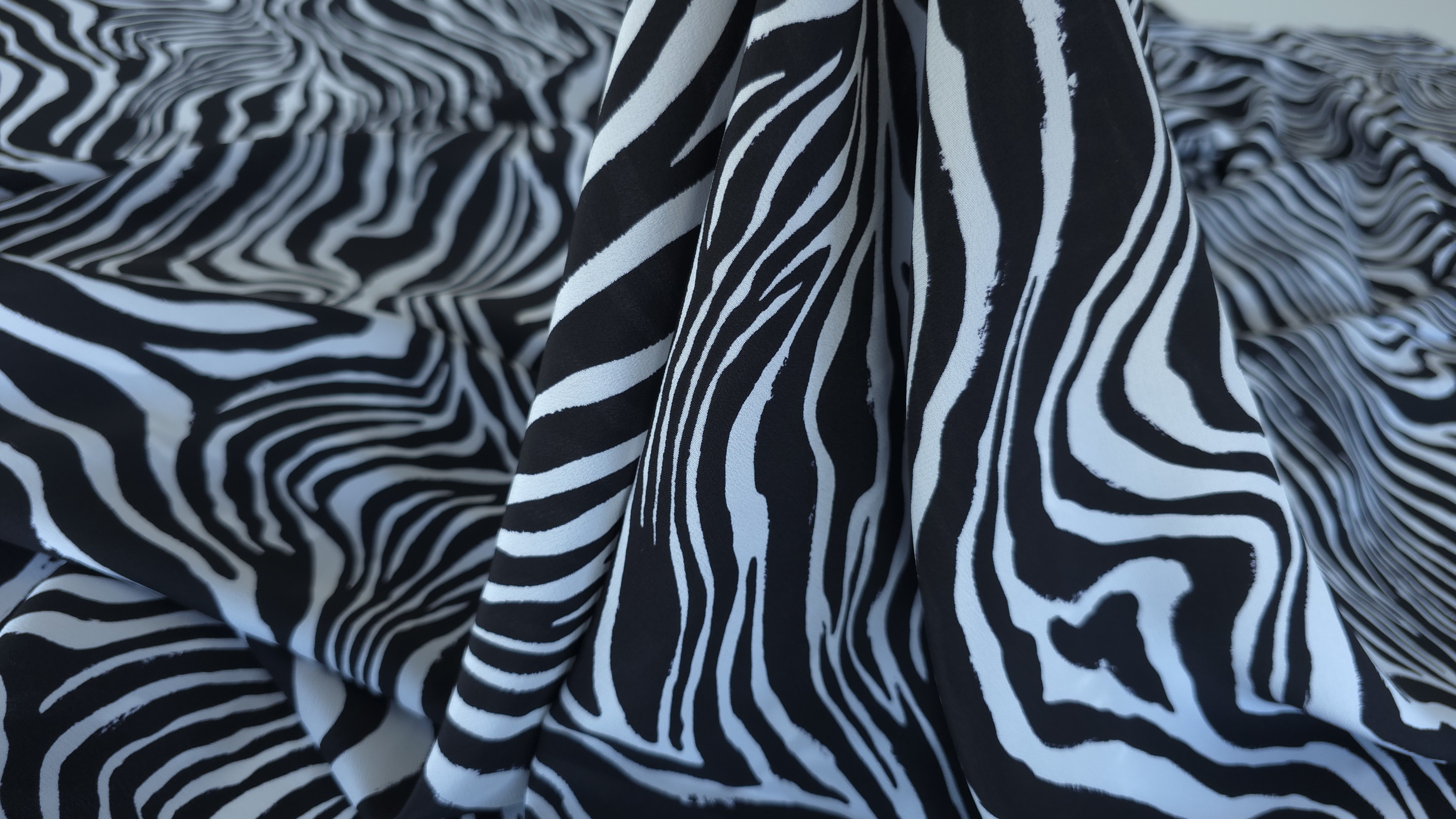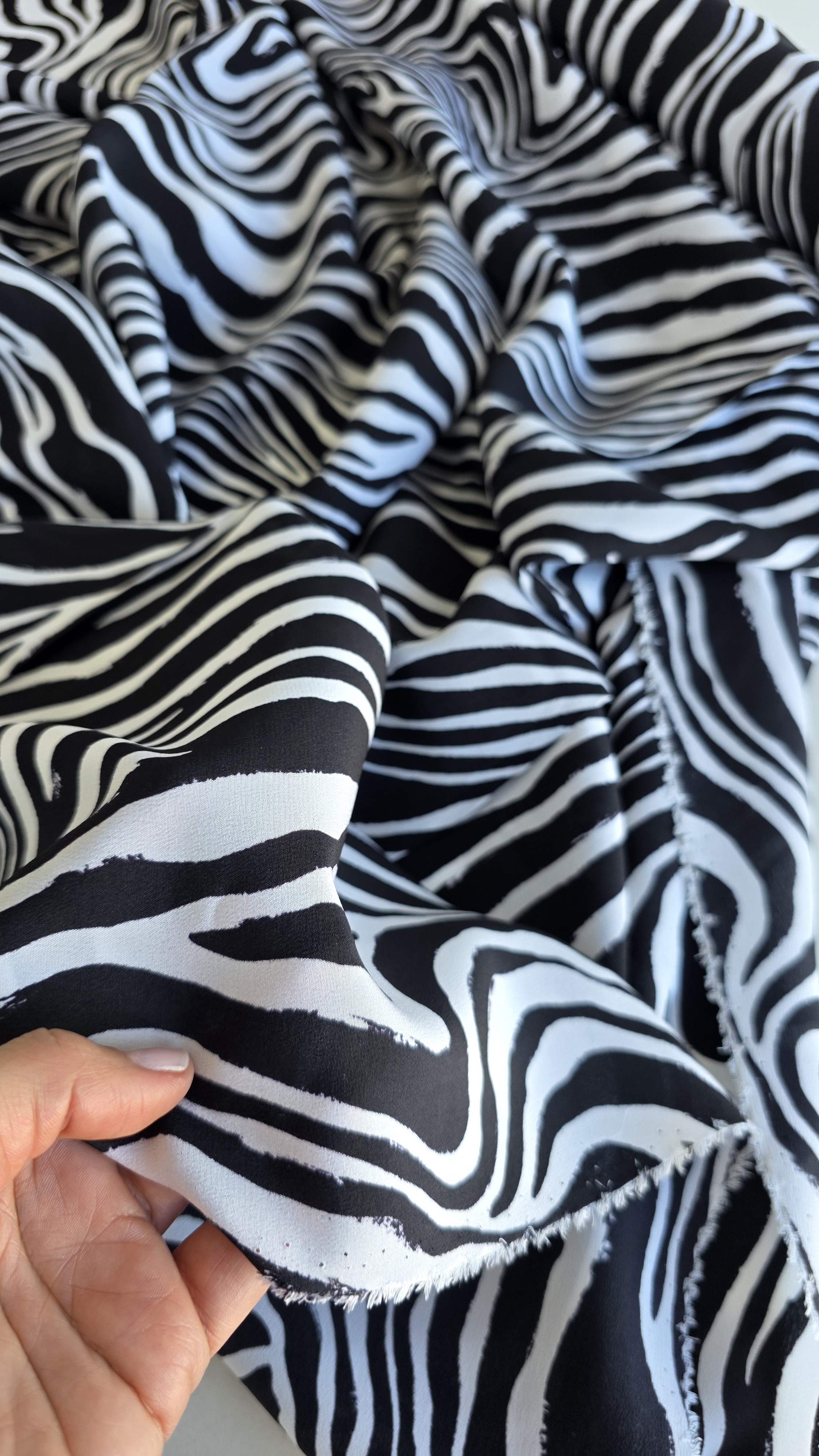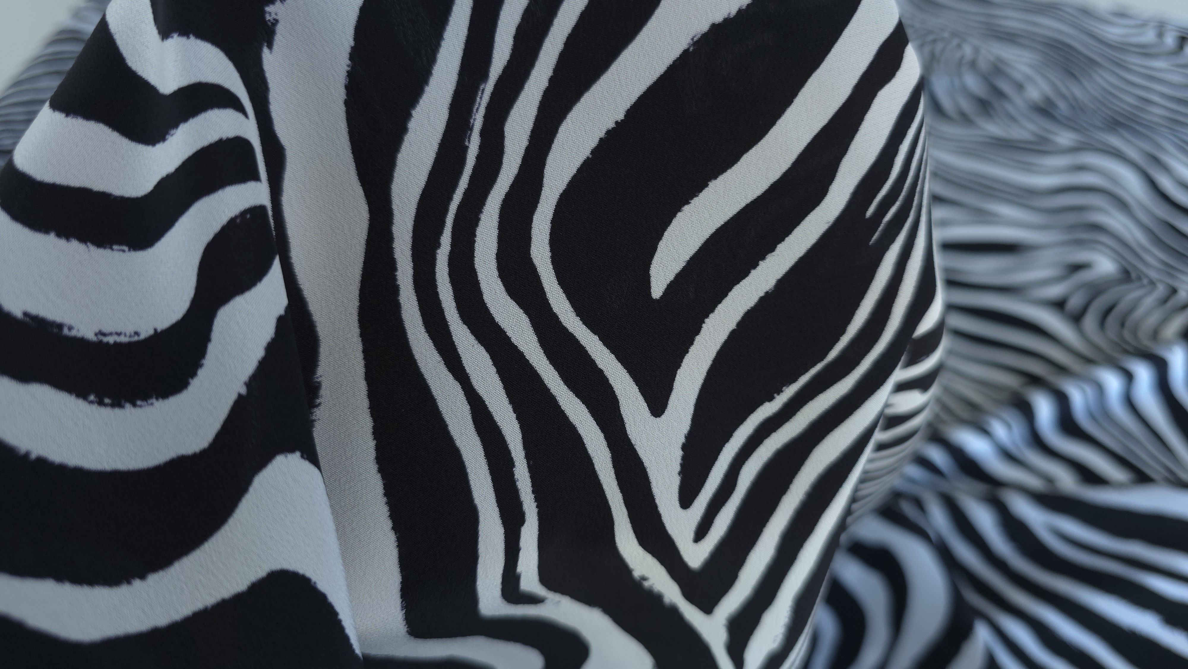 Crepe de Chine din matase naturala MK1848, cu imprimeu zebra, în contrast alb-negru. țăesătură fină, ușoară și plăcută la atingere, cu suprafață mată, cădere naturală si o ușoară traransparență. Mătasea oferă un confort termic excelent și o mișcare grațioasă, fiind ideală pentru rochii, bluze, fuste sau eșarfe fluide. Este o alegere versatilă, potrivită atât pentru ținute casual elegante, cât și pentru piese statement de zi sau de seară. Alăturați-vă comunității noastre online pe Facebook și Instagram. Vă așteptăm cu drag!
