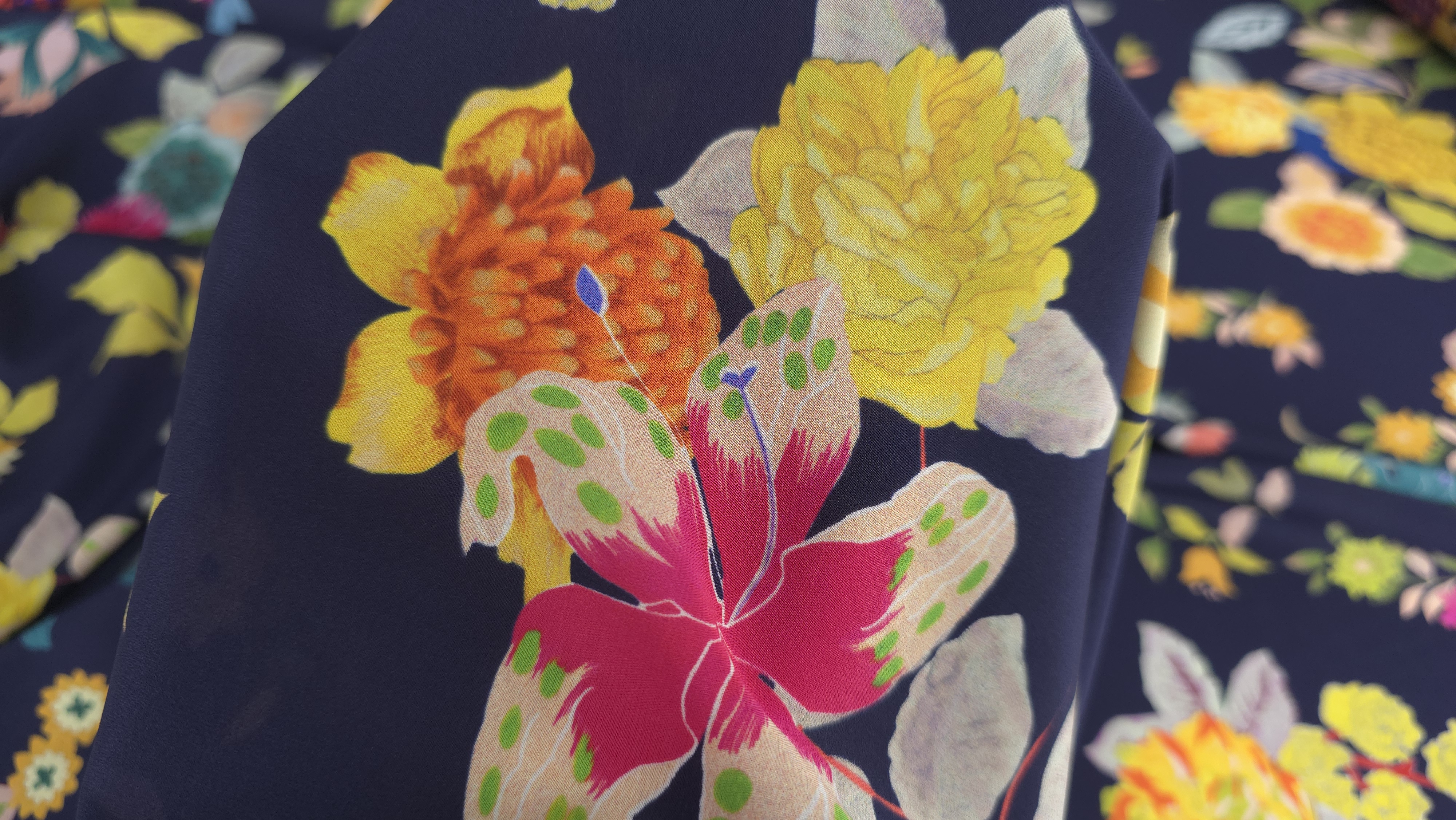 Matase naturala mata elastica ETR1834 fluidă și elegantă, realizată din mătase naturală mată cu elastan, relativ subțire și ușor transparentă. Materialul are o textură fină, asemănătoare crepului de Chine, dar cu un finisaj mai delicat și o flexibilitate subtilă datorită elastanului. Imprimeul floral spectaculos, aduce armonie între culoare, formă și fluiditate, transformând fiecare creație într-o piesă unică. Ideală pentru rochii vaporoase, bluze, fuste fluide sau topuri feminine. Alăturați-vă comunității noastre online pe Facebook și Instagram. Vă așteptăm cu drag!