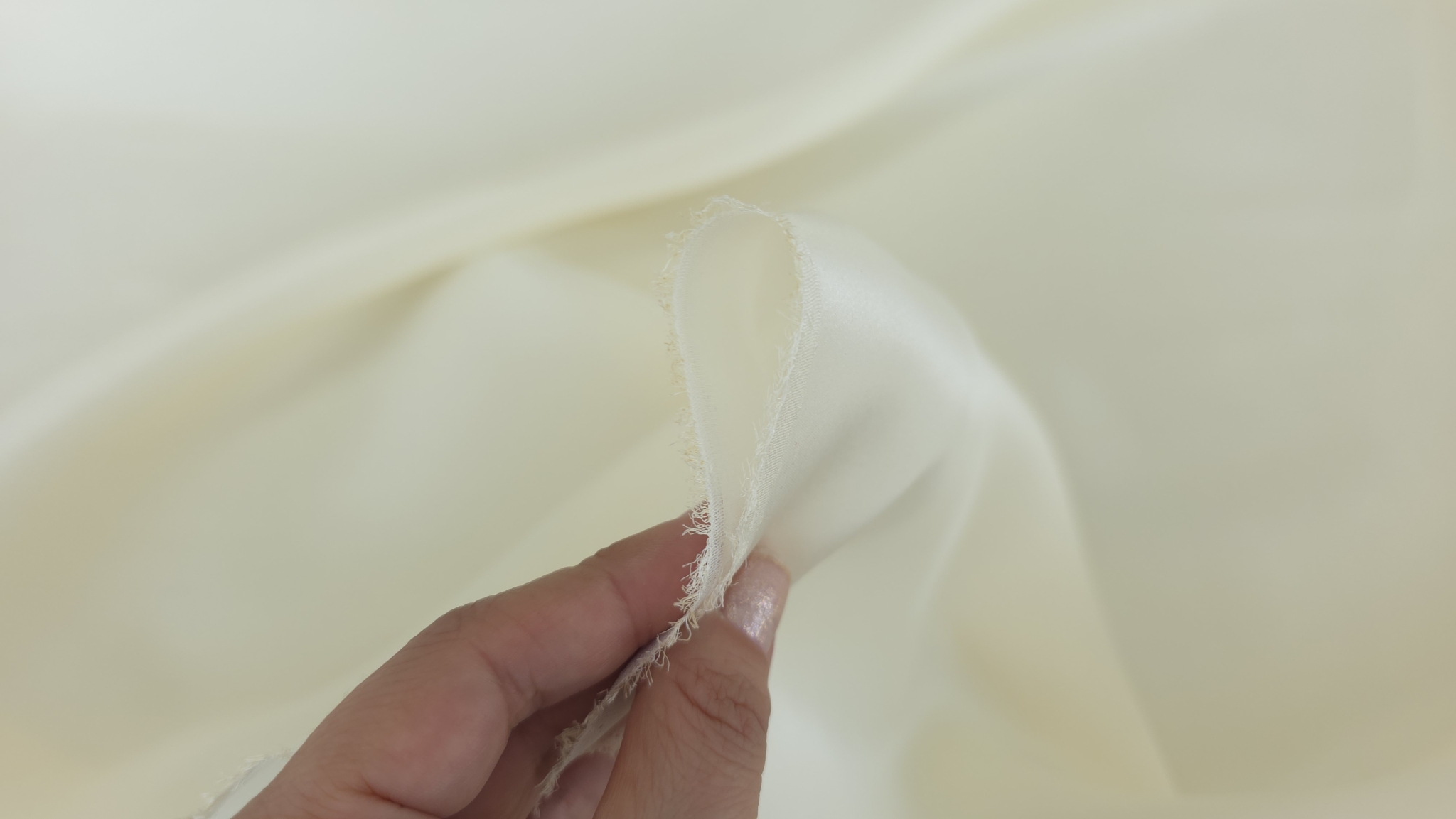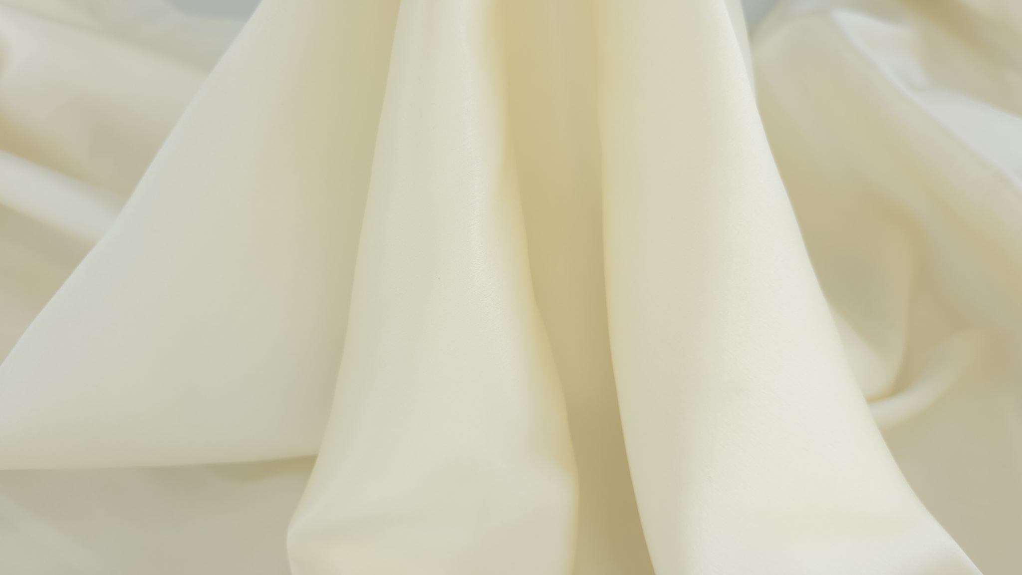 Charmeuse ivory unt din matase naturala 16 momi cu o paletă caldă, cremoasă, care se apropie de nuanța untului. Materialul prezintă două fețe distincte: una fin mată, cu o textură netedă și discretă. Cealaltă parte are luciu caracteristic țesăturii charmeuse.