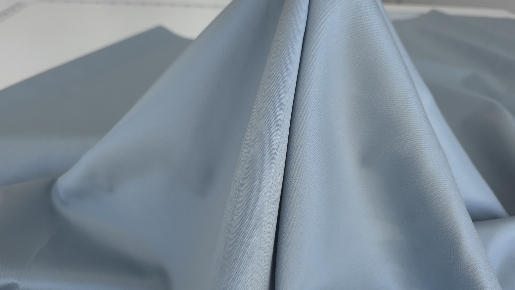 Mikado Silver Blue din mătase naturală este o țesătură cu structură fermă și suprafață uniformă, într-o nuanță elegantă de albastru deschis cu reflexii reci. Materialul este potrivit pentru realizarea pieselor vestimentare cu volum clar și croieli bine definite.