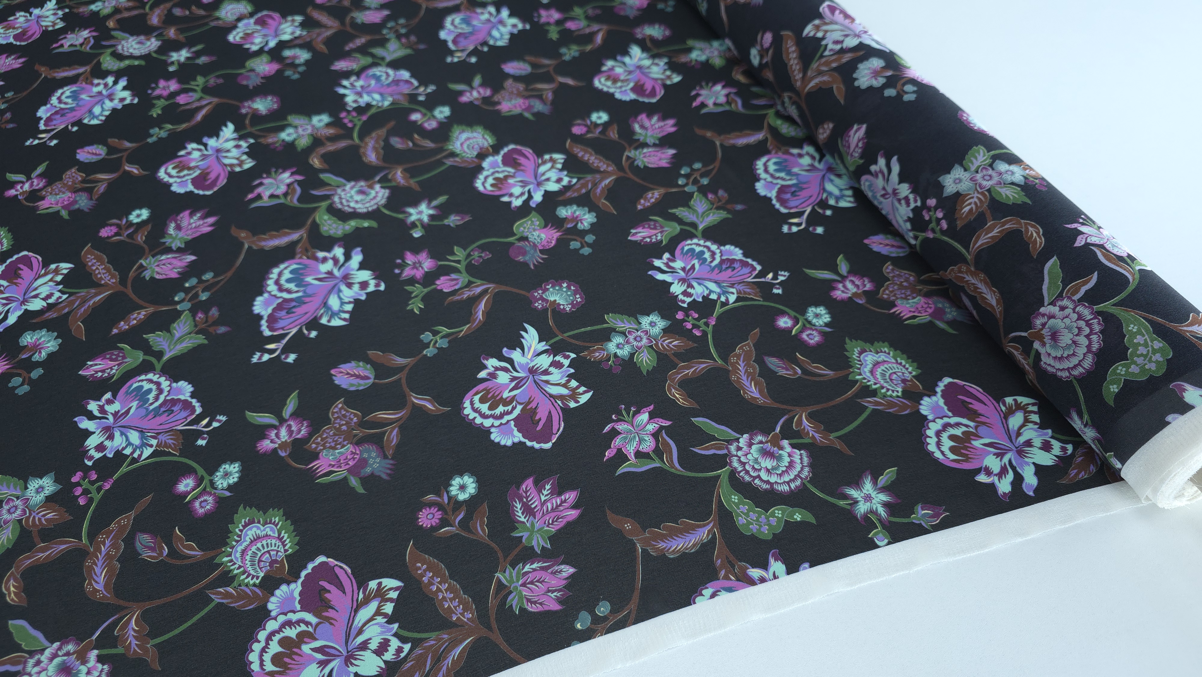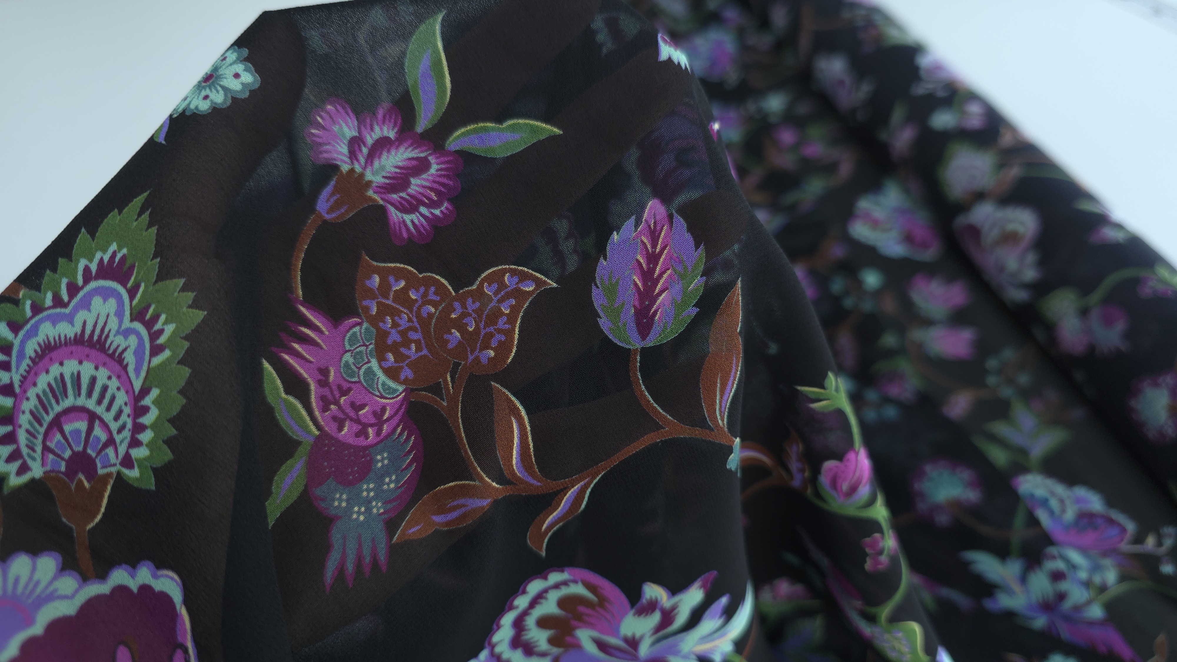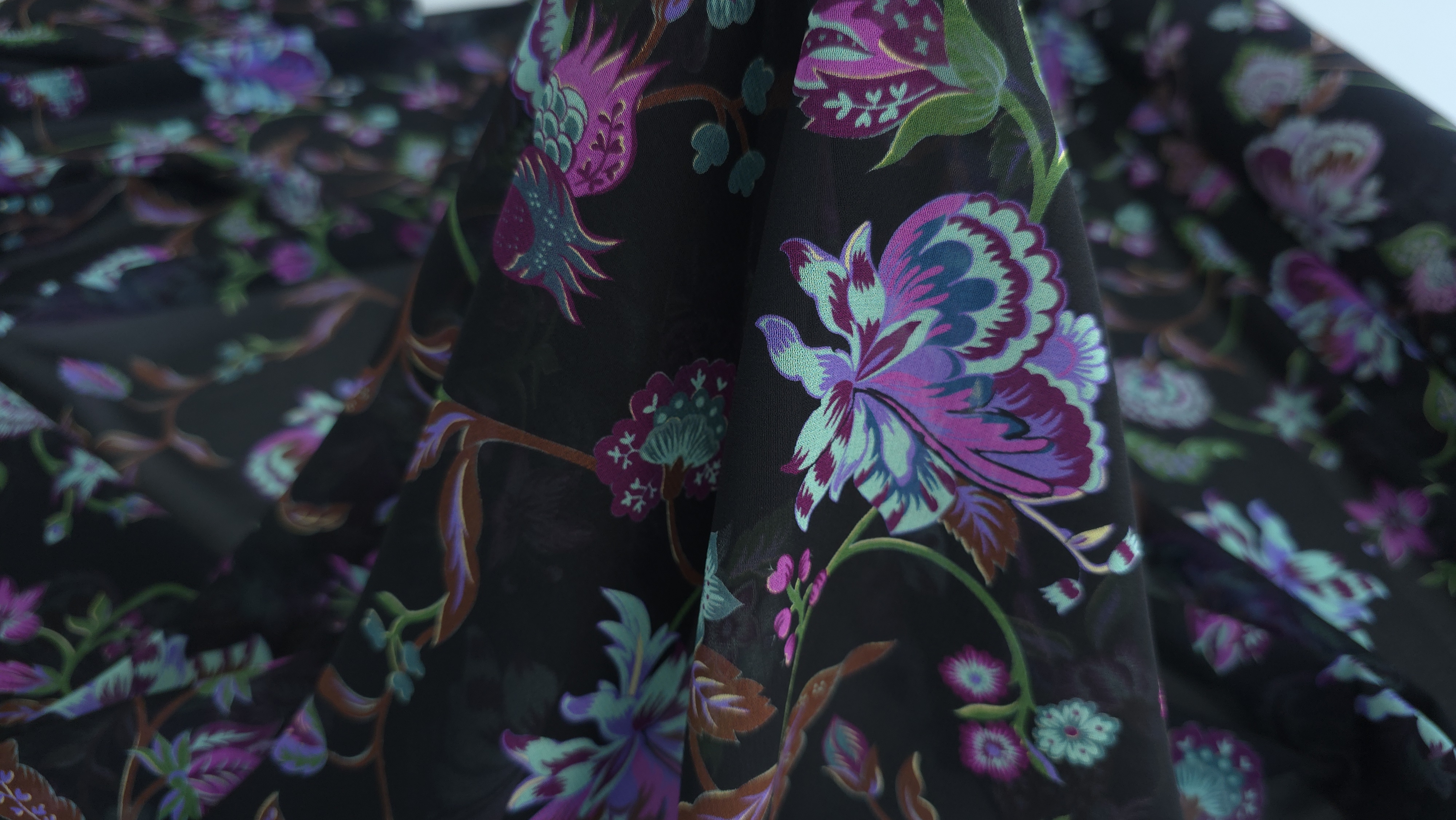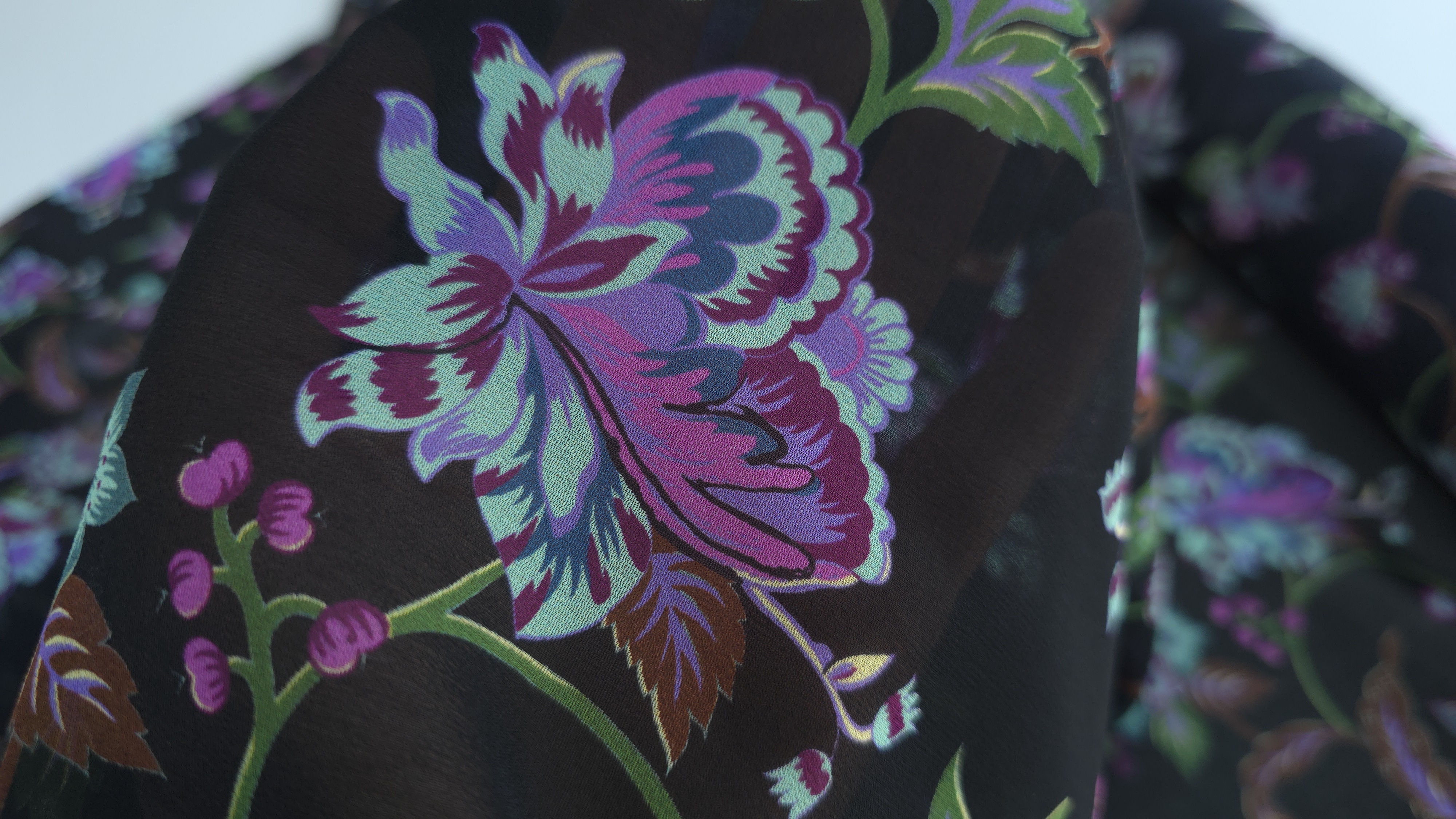 Voal Georgette matase naturala ETR1833, cu imprimeu floral inspirat de estetica brandului Etro, în nuanțe vibrante de fucsia, turcoaz și verde pe fond negru intens. Țesătura are o transparență clasică, o textură ușor creponată și o cădere fluidă, conferind lejeritate și mișcare elegantă fiecărei piese vestimentare. Este o alegere ideală pentru rochii vaporoase, bluze fine, fuste sau suprapuneri ușoare cu efect de transparență subtilă. Vă invităm să ne urmăriți și pe rețelele de socializare pentru a rămâne informați cu privire la ultimele noastre actualizări, oferte exclusive și surse de inspirație. Alăturați-vă comunității noastre online pe Facebook și Instagram. Vă așteptăm cu drag!