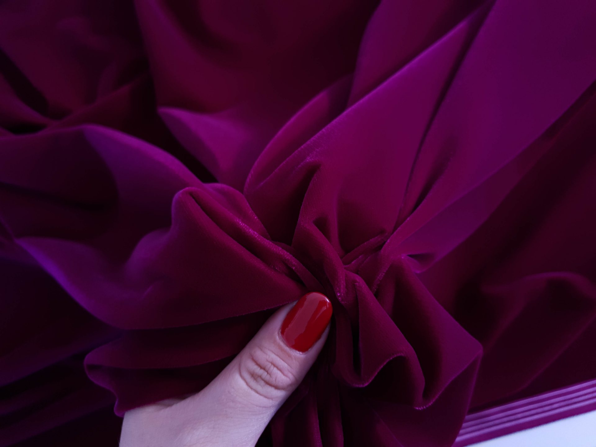 Catifea superioara mov magenta Korea, o țesătură premium cu luciu elegant și o atingere extrem de plăcută. Materialul are o densitate superioară și o suprafață fină, care captează lumina pentru a evidenția intensitatea culorii. Datorită conținutului de elastan, oferă confort, elasticitate ușoară și o cădere impecabilă, potrivită atât pentru croieli fluide, cât și pentru ținute structurate. Nuanța mov magenta transmite energie, feminitate și stil, fiind perfectă pentru rochii de seară, sacouri, fuste. Vă invităm să ne urmăriți și pe rețelele de socializare pentru a rămâne informați cu privire la ultimele noastre actualizări, oferte exclusive și surse de inspirație. Alăturați-vă comunității noastre online pe Facebook și Instagram. Vă așteptăm cu drag!