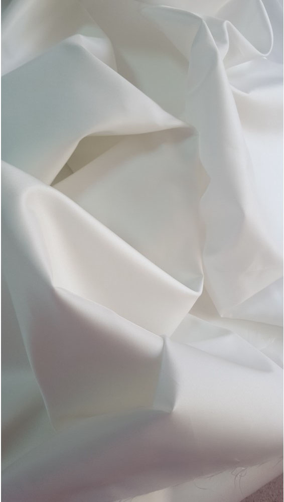 Construcția compactă, tip tafta, menține ferm forma volumelor și a faldurilor ample. Suprafața rămâne netedă, fără încrețituri moi la așezare. Această țesătură mikado ivory M1 perlat reprezintă baza ideală pentru corsete structurate. Materialul asigură o siluetă clară. Aceasta își păstrează integritatea pe tot parcursul purtării, fiind foarte stabilă.