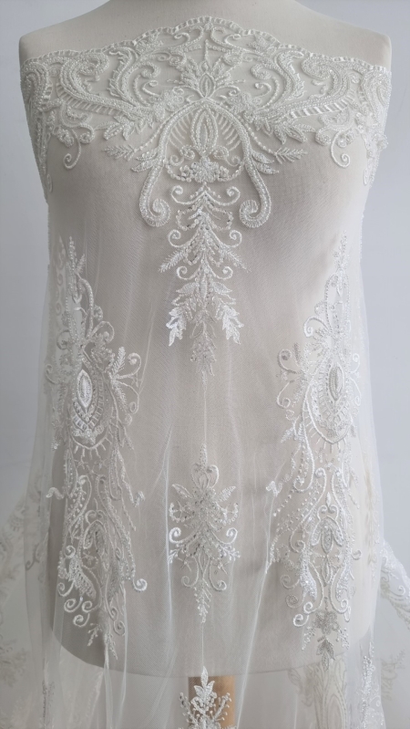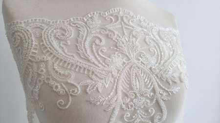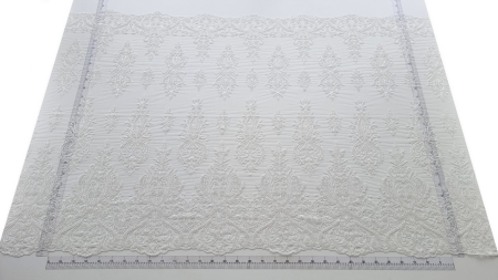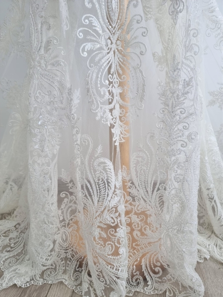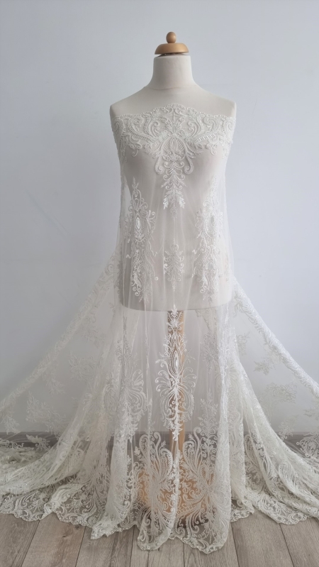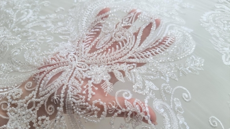 Broderie ivory accesorizata Paulina cu micropaiete transparente si ivory de diferite dimensiuni si margele tubulare cusute pe tulle ivory, usor elastic.