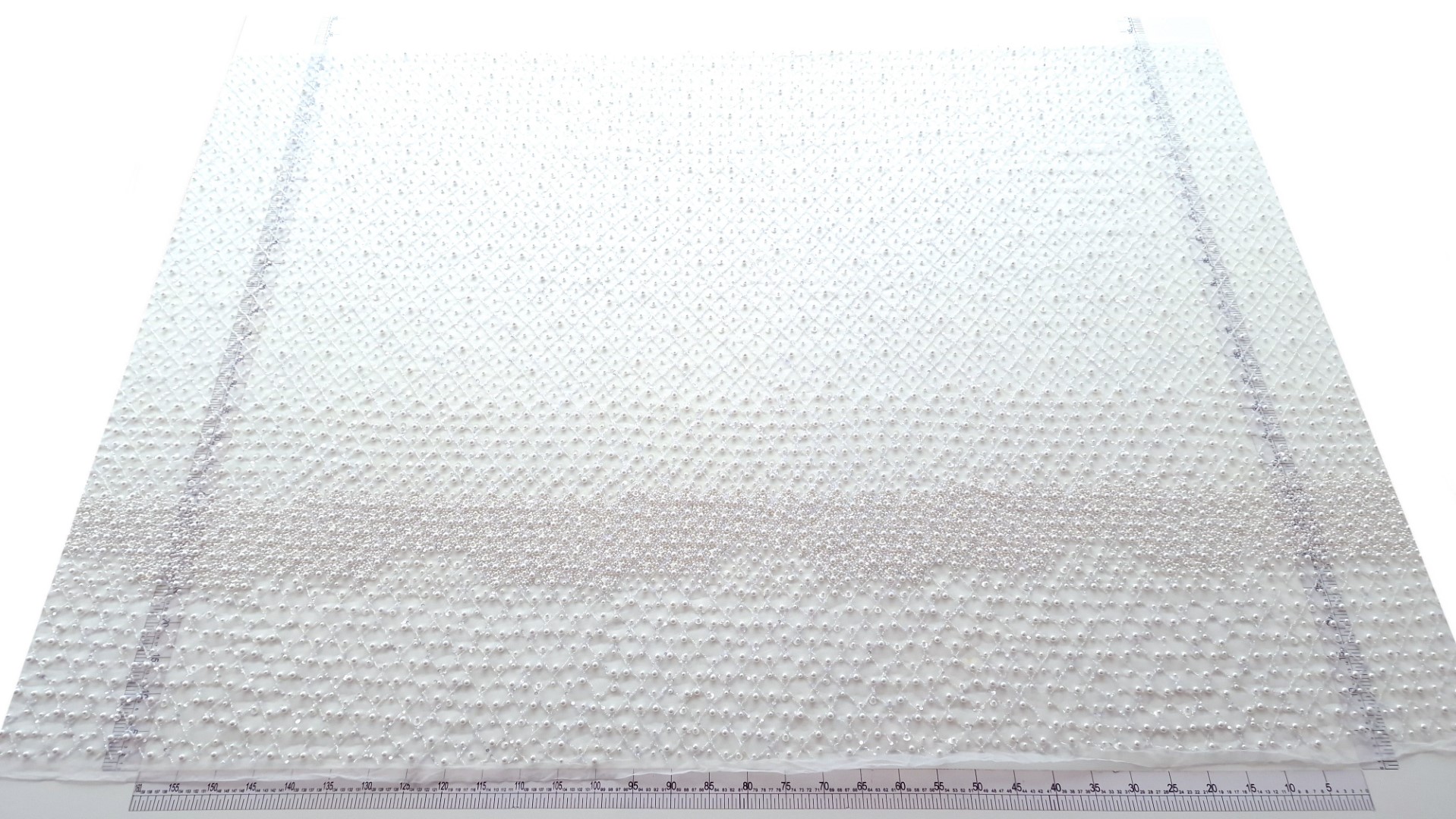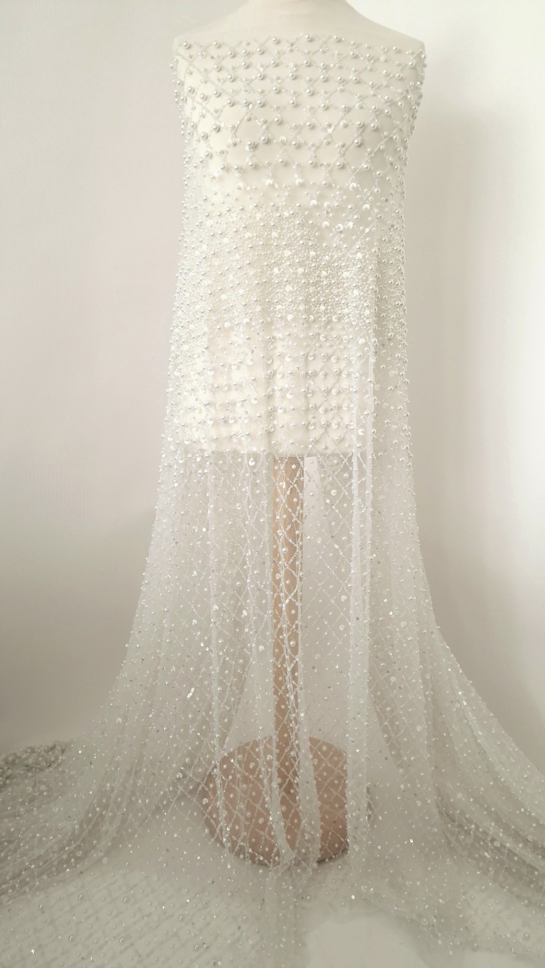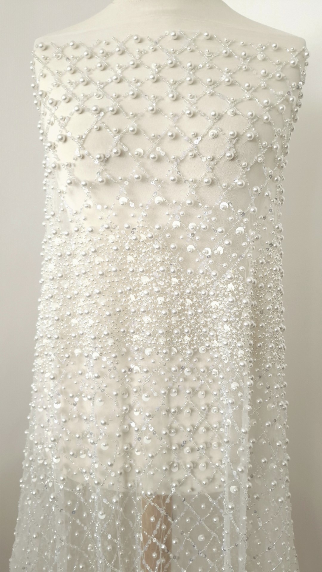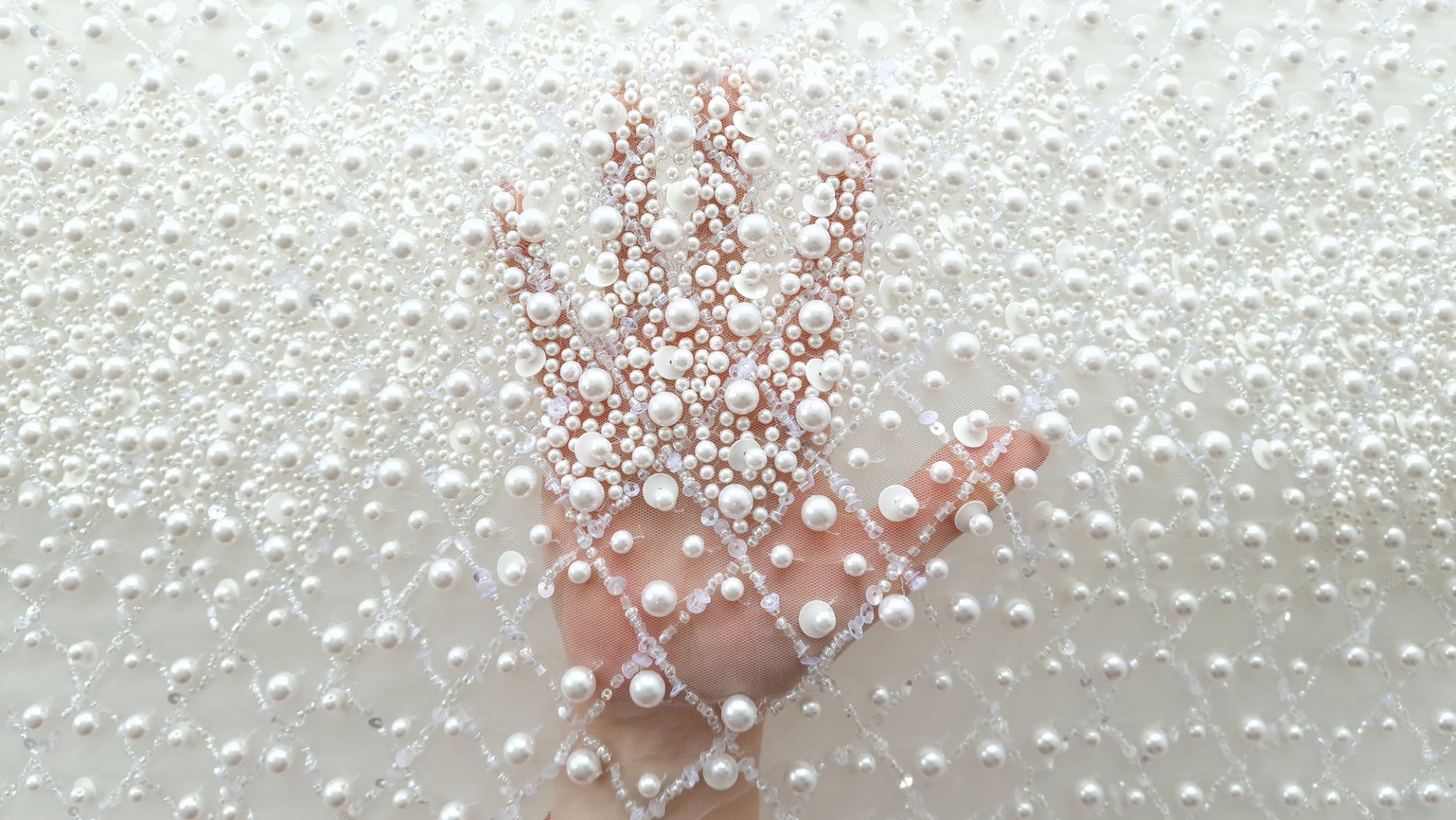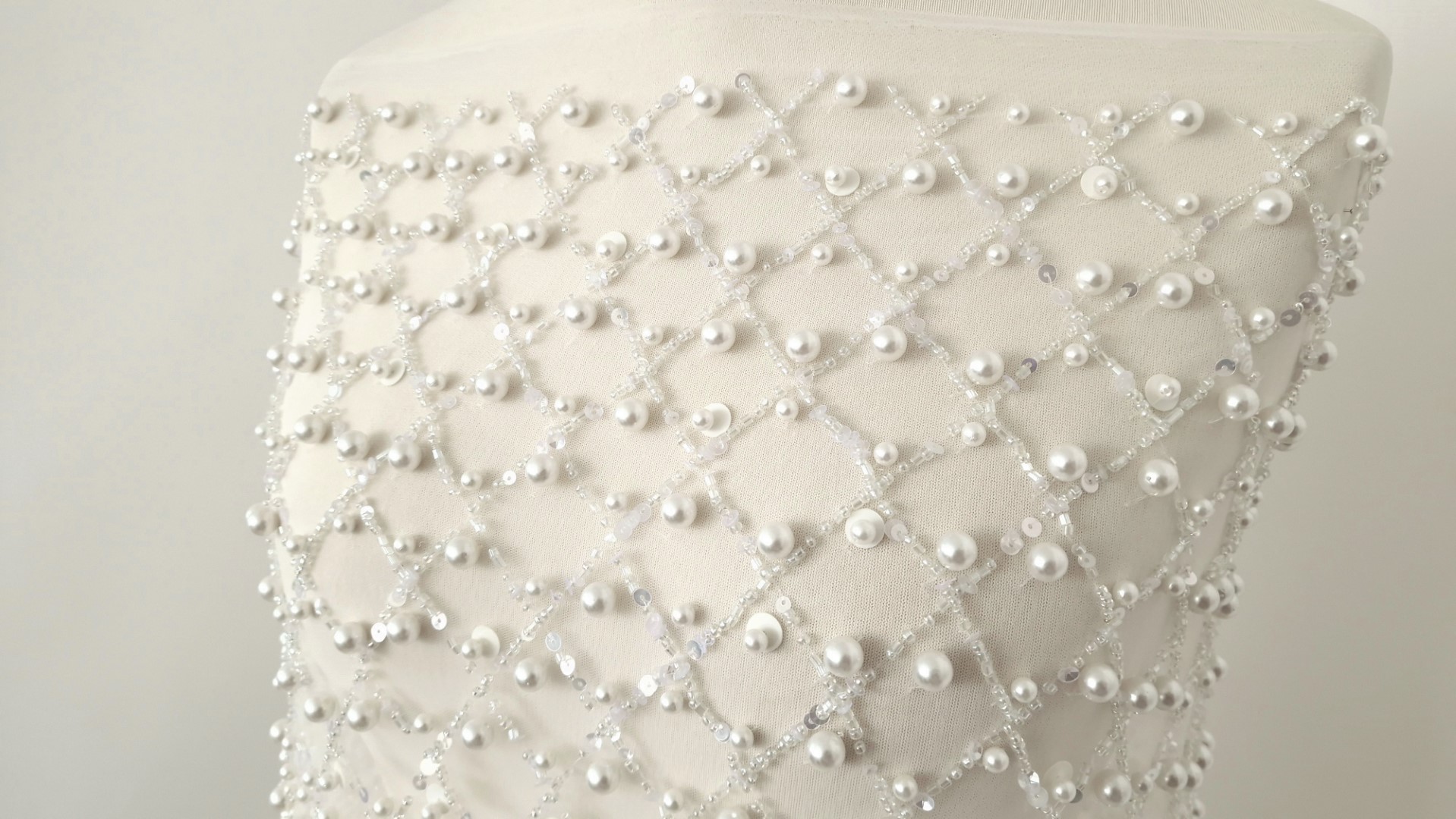 Prezent in majoritatea colectiilor de gala haute couture a celor mai renumiti designeri internationali, tulle-ul brodat manual cu perle de inalta calitate a devenit unul dintre cele mai ravnite materiale ce scoate din anonimat orice creatie vestimentara menita sa capteze toate privirile. Baza folosita este un tulle fin, dar rezistent si putin elastic. Aplicatiile sunt formate din perle intregi de diferite marimi, micropaiete si margele ivory, cusute manual cu fir transparent si rezistent termic. Atentia cu care au fost cusute individual face ca in momentul taierii materialului, perlele sa nu se desprinda de pe tulle chiar daca se afla la doar 1-2 mm de marginea taiata, conferind usurinta in procesul de lucru. Caracterul exclusivist este dat de faptul ca fiind lucrate manual, aceste creatii minunate sunt disponibile in cantitati mici.