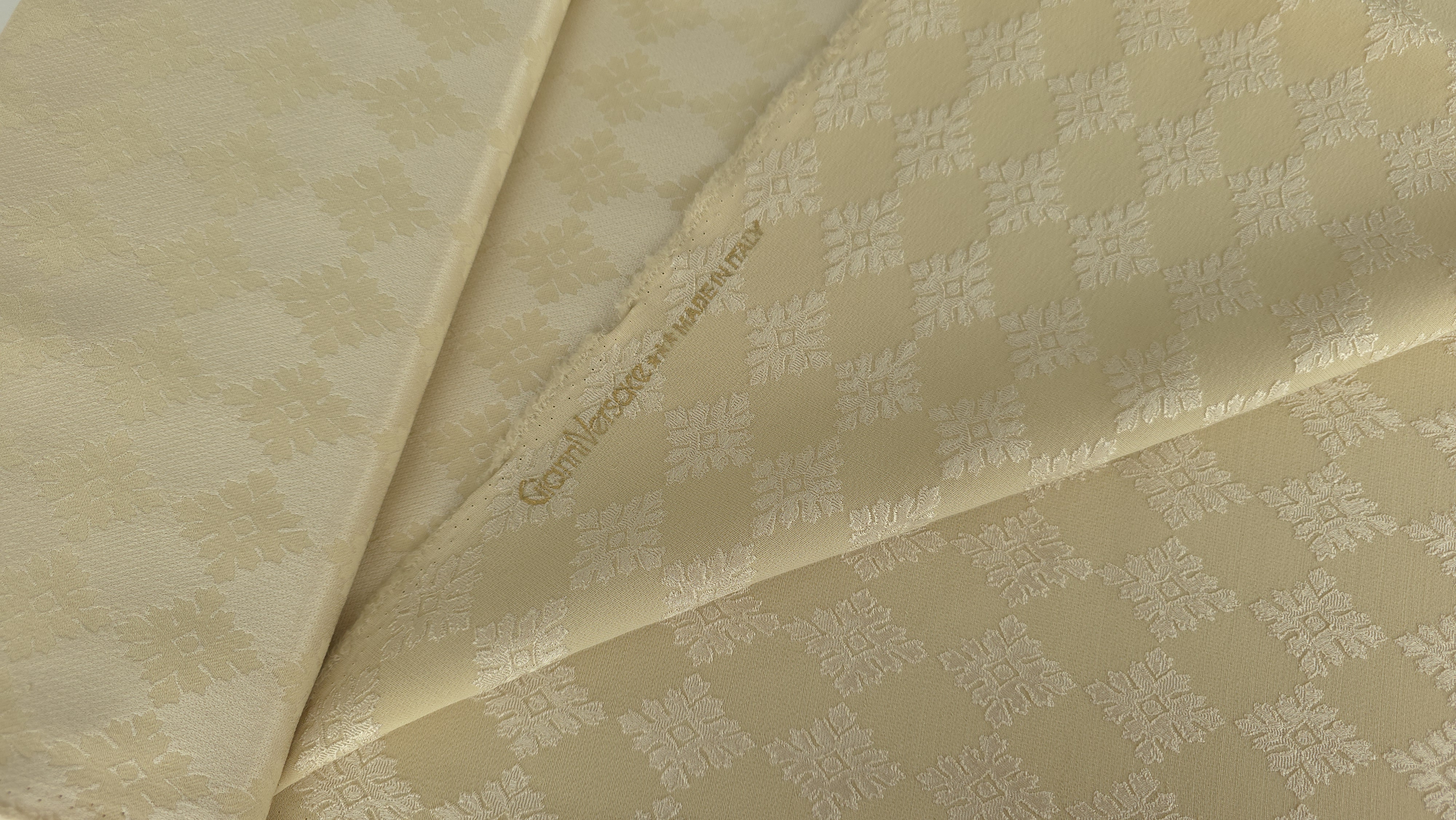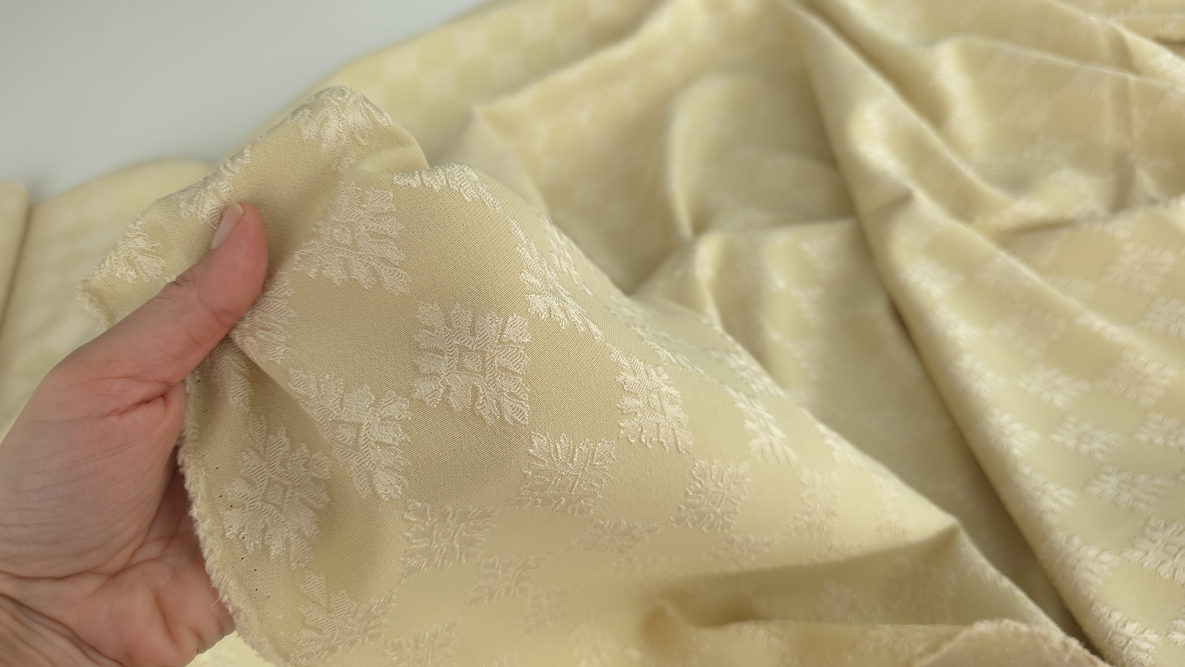 Brocard vanilla cu mătase naturală și lână, o țesătură structurată, elegantă, cu model jacquard în relief, ideală pentru rochii, sacouri, fuste, seturi elegante și piese statement.