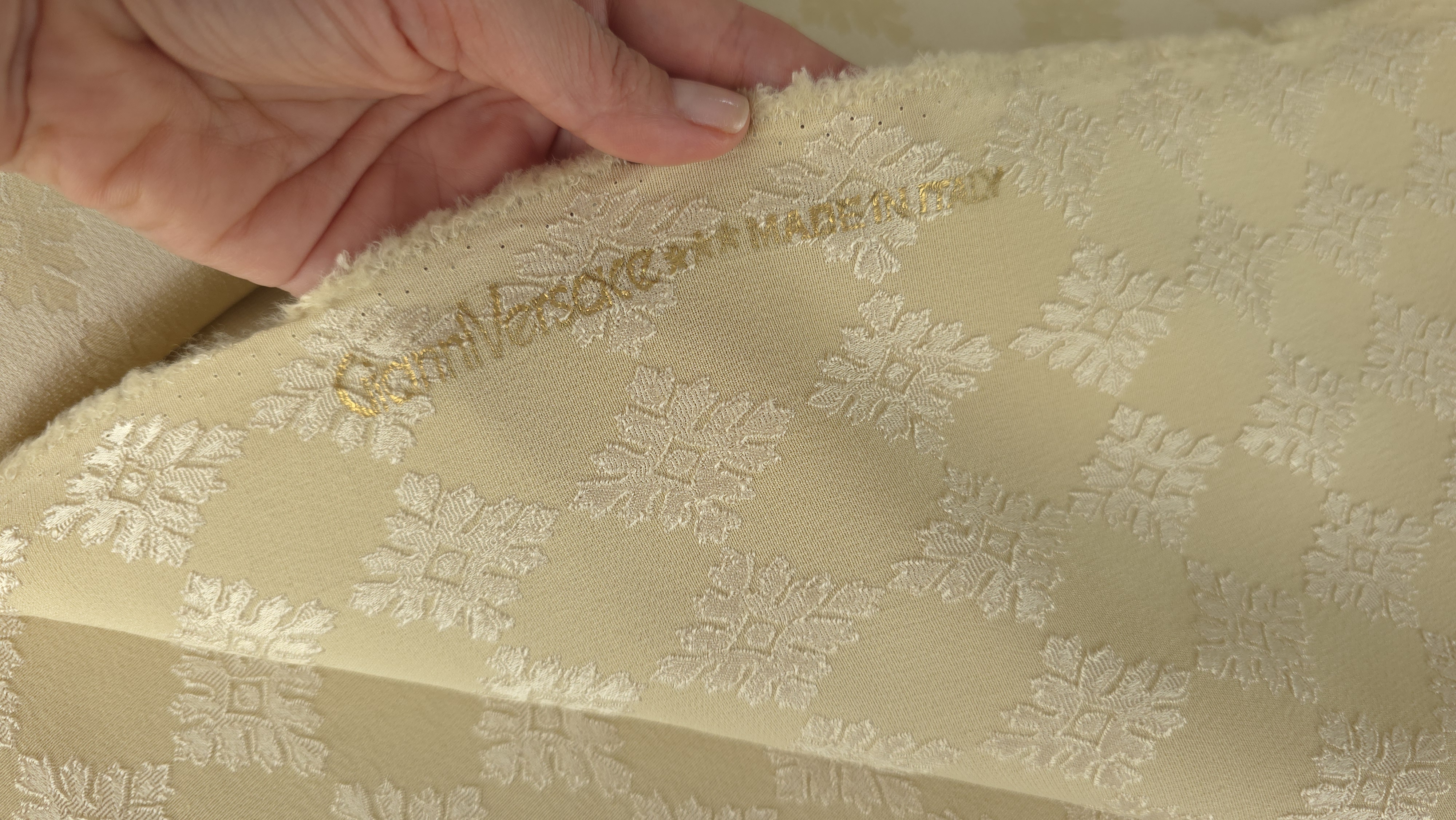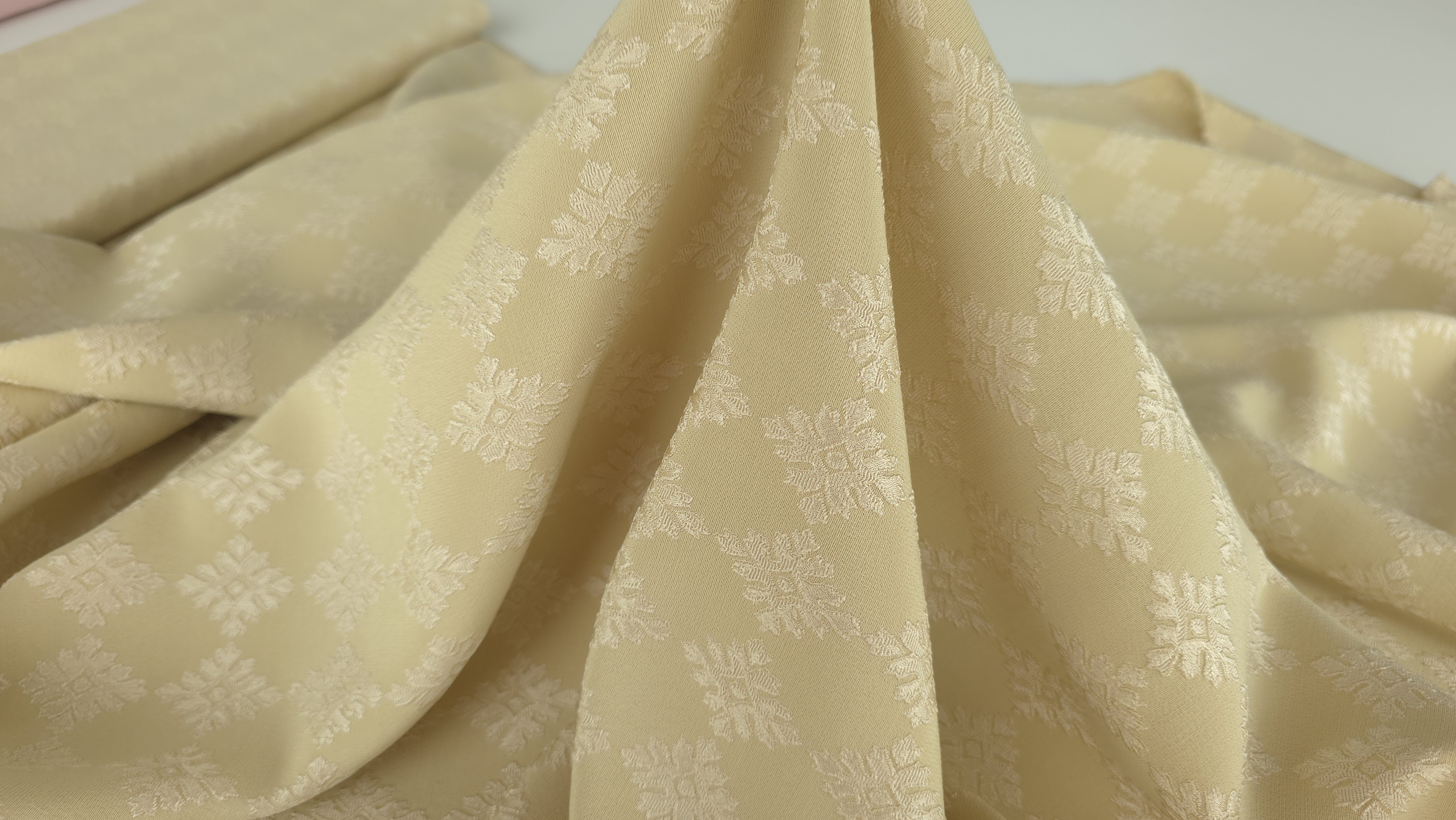 Modelul jacquard este clar definit, cu o alternanță de motive geometrice ce se repetă uniform. Culoarea vanilla este caldă și luminoasă, potrivită pentru ținute elegante de zi și de seară. Materialul reflectă frumos lumina și evidențiază textura brocartului.