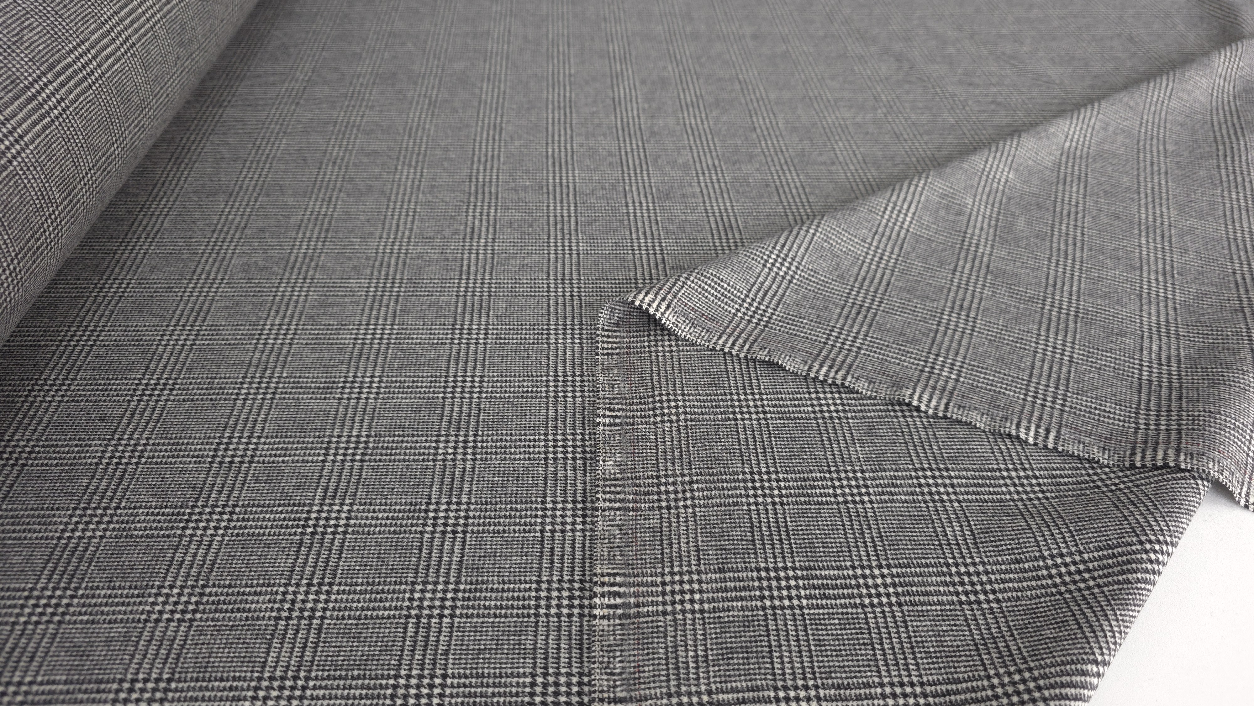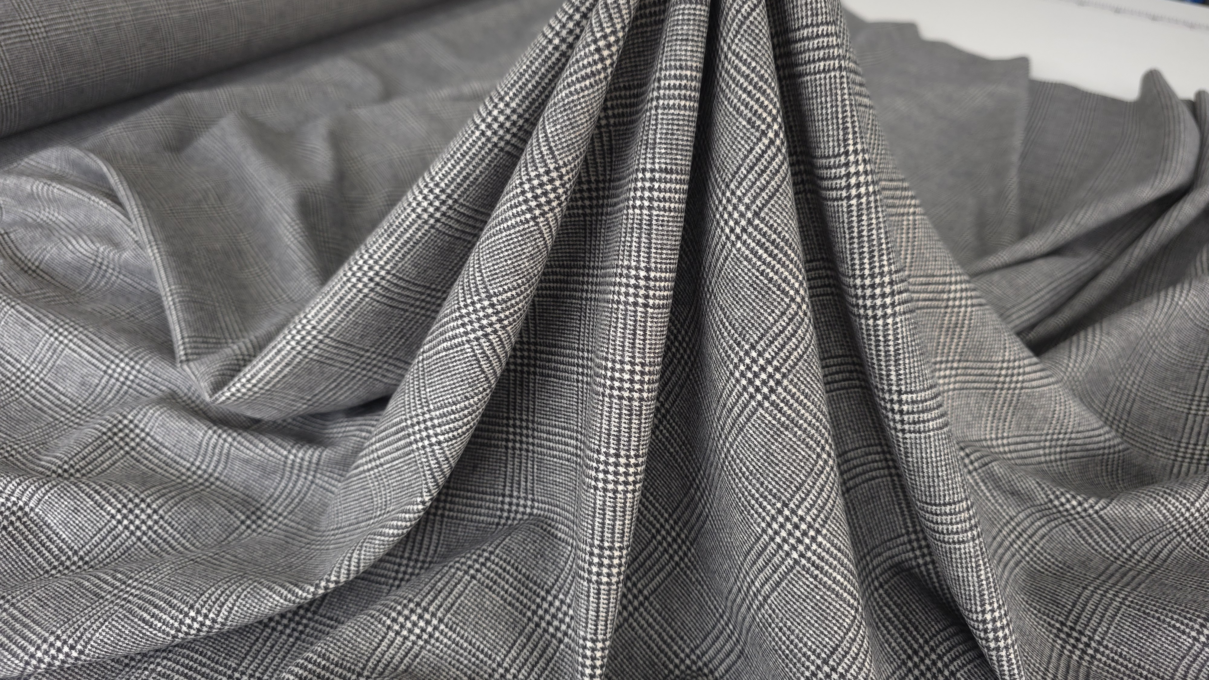 Această stofă gri în dungi cu fire negre și ivory oferă o combinație rafinată între tradițional și modern. Tonurile gri sunt bine echilibrate. Firele negre și ivory creează un ritm vizual discret. Modelul este elegant și versatil. Permite croieli curate și siluete precise.
