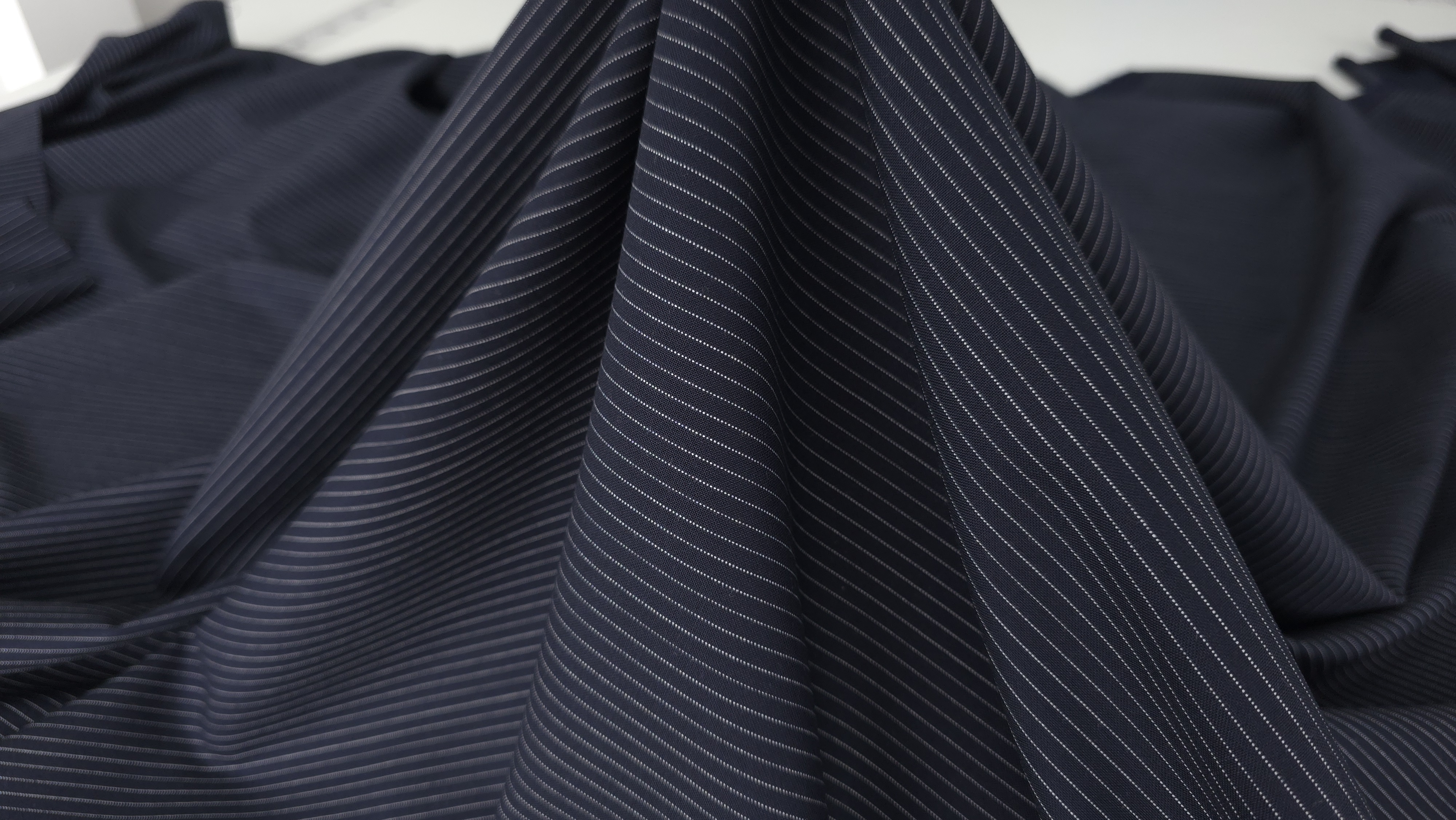Această stofă subțire din lână 100% bleumarin închis este ideală pentru costume elegante și piese office moderne. Structura fină și densă oferă materialului o textură netedă, foarte confortabilă la purtare. Modelul pinstripe subțire adaugă un aspect rafinat, profesional și alungește optic silueta.