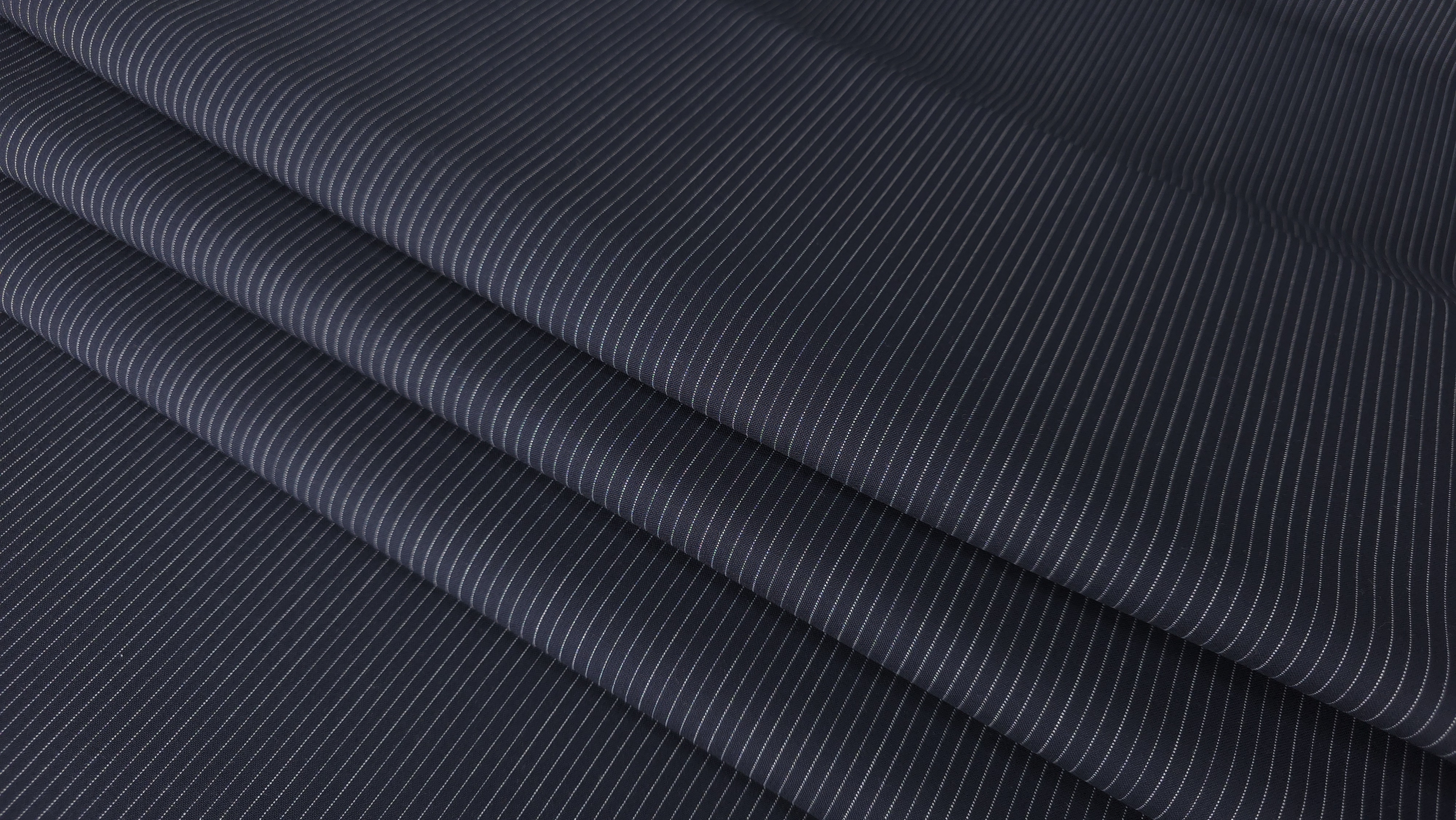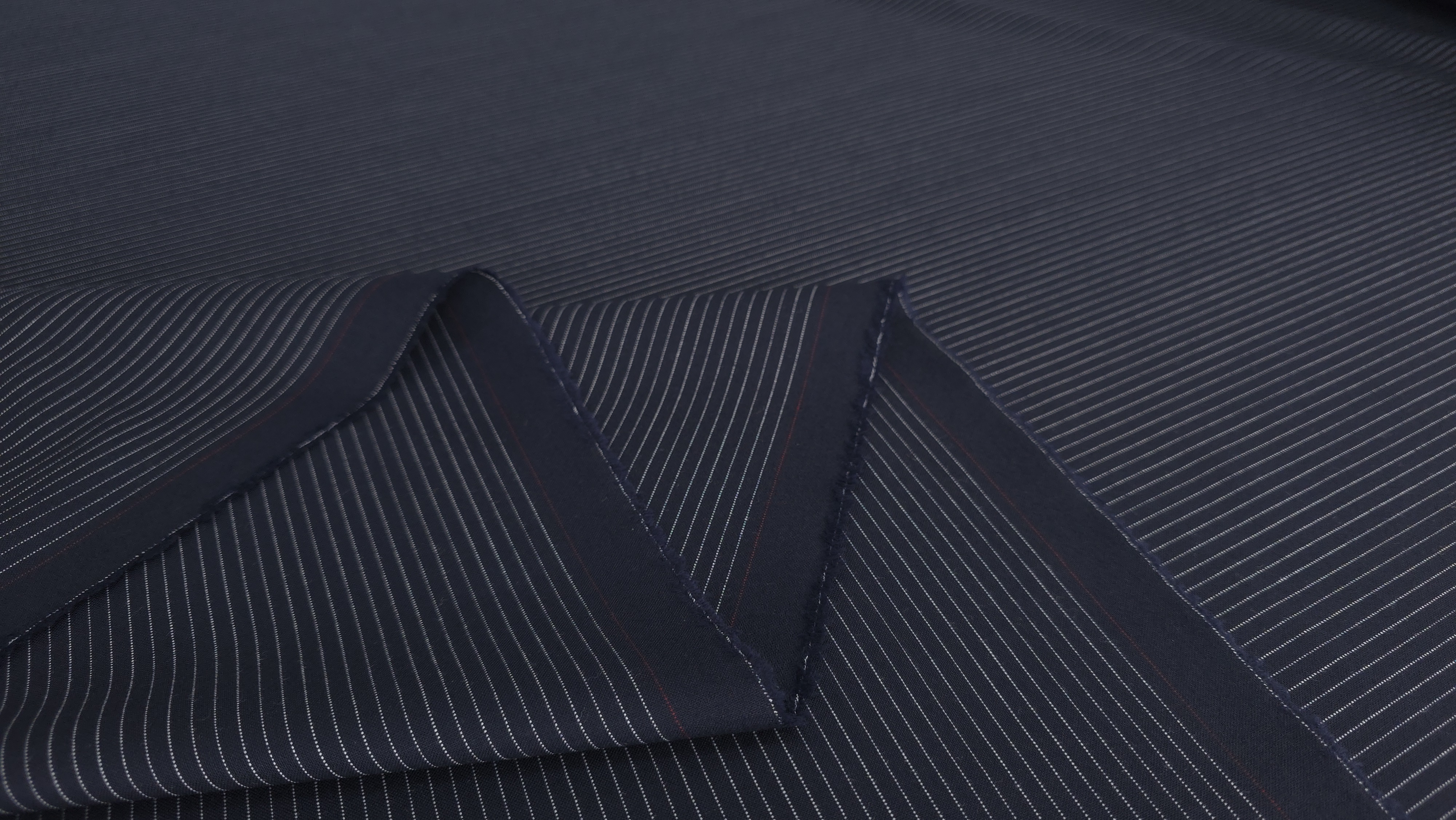 Culoarea bleumarin închis oferă versatilitate și poate fi integrată ușor în garderobe clasice sau contemporane. Pinstripe-ul discret conferă țesăturii o identitate vizuală specifică costumelor business, dar poate fi folosit și în proiecte de design modern. Aspectul este uniform, cu reflexii fine în lumină.
