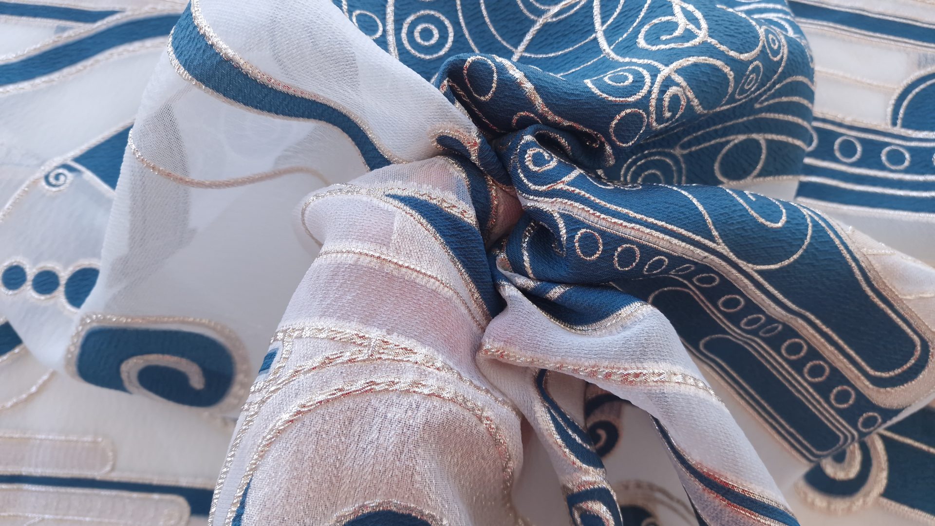Cu o textura reliefata si insertii de fir metalizat, aceasta organza este o tesatura versatila, putand fi folosita pentru realizarea tinutelor de dama precum: rochii, camasi, fuste.
