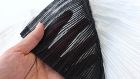 Organza plisata neagra din matase naturala 8 momi fabricată în Italia, cu un grad de plisare de 100% (pentru fiecare metru plisat sunt folosiți 2 metri de material întins). Atât țesătura, cât și pliseul sunt de înaltă calitate, executate cu precizie pentru un efect vizual spectaculos. Textura delicată, transparentă și cu ținută ușor rigidă o face ideală pentru rochii de seară, fuste ample sau detalii spectaculoase în designul vestimentar. Plisarea fină adaugă volum, păstrând totodată eleganța naturală a mătăsii. Vă invităm să ne urmăriți și pe rețelele de socializare pentru a rămâne informați cu privire la ultimele noastre actualizări, oferte exclusive și surse de inspirație. Alăturați-vă comunității noastre online pe Facebook și Instagram. Vă așteptăm cu drag!