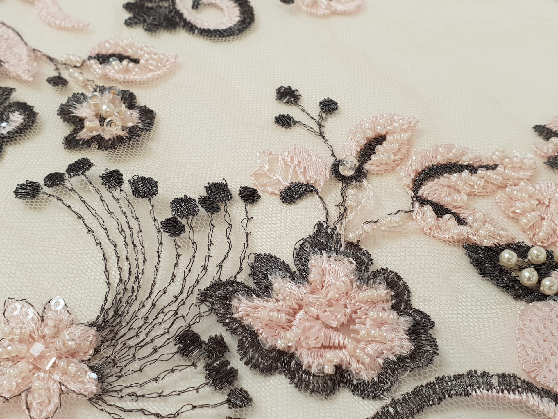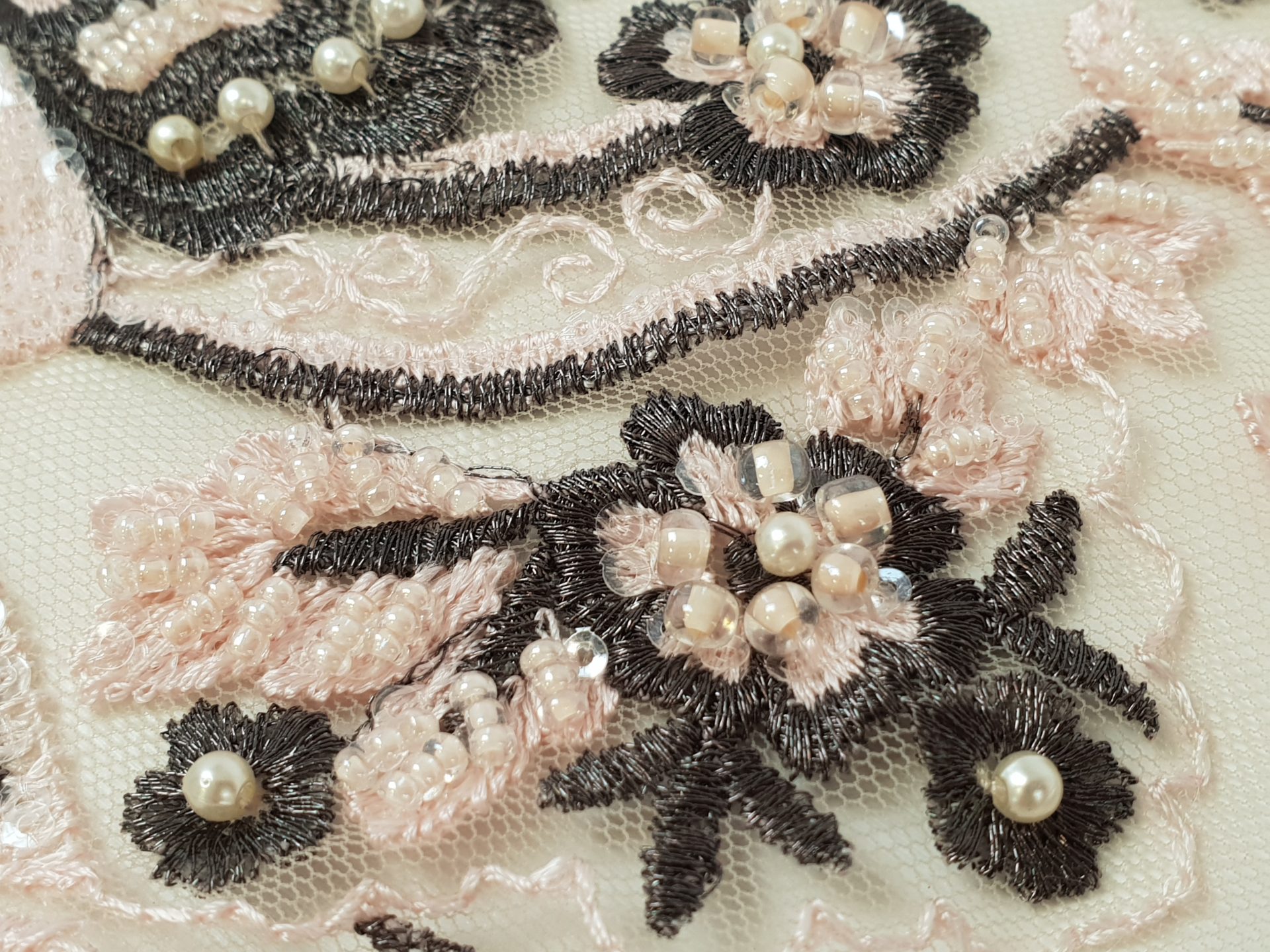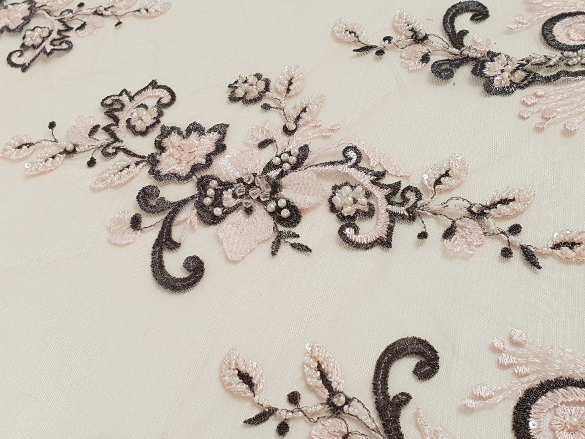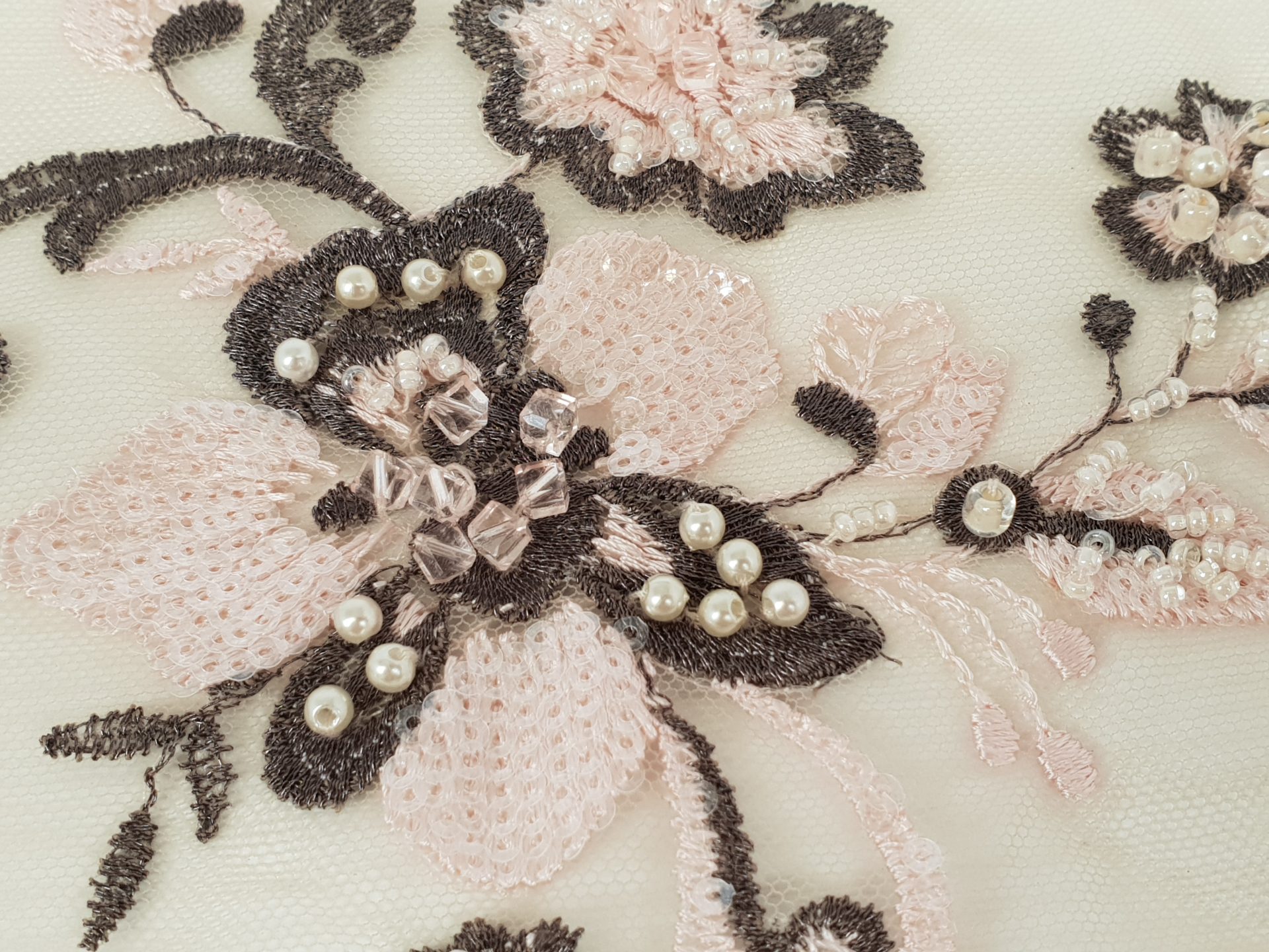 Broderie accesorizata cu motive florale in tonuri de roz pal si gri inchis, cu paiete transparente si margele de diferite forme.