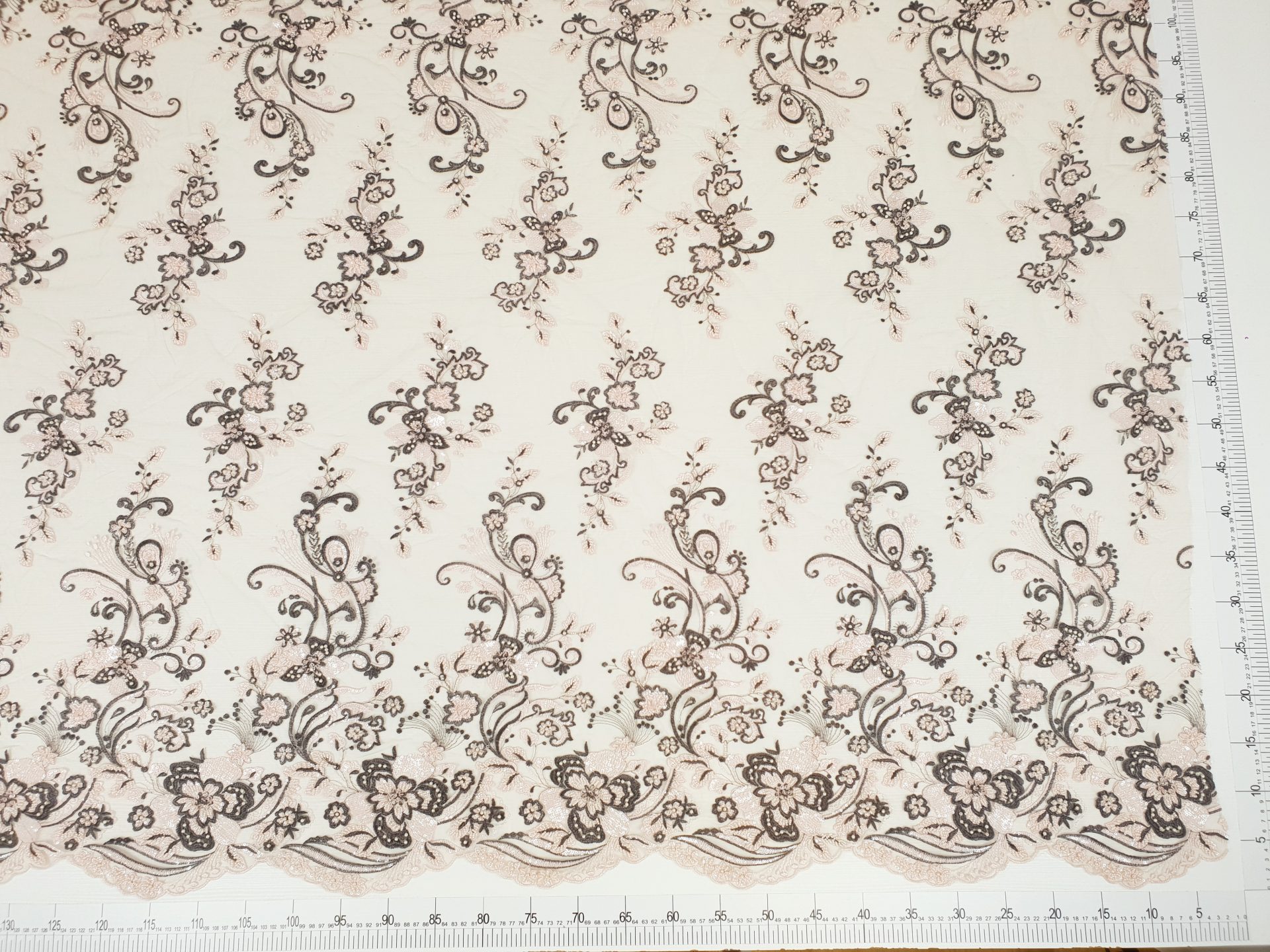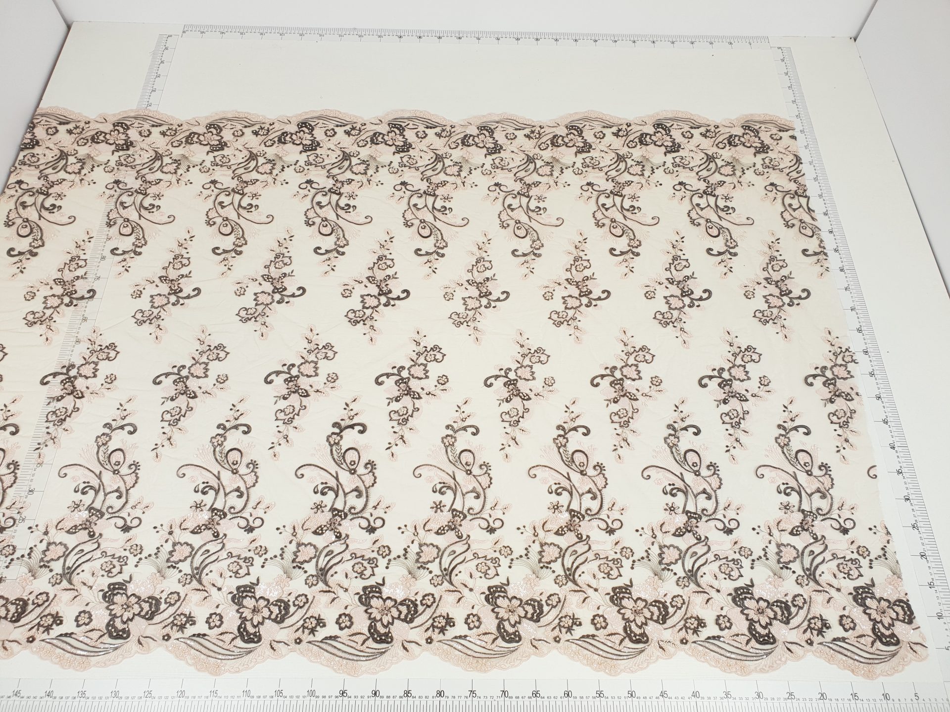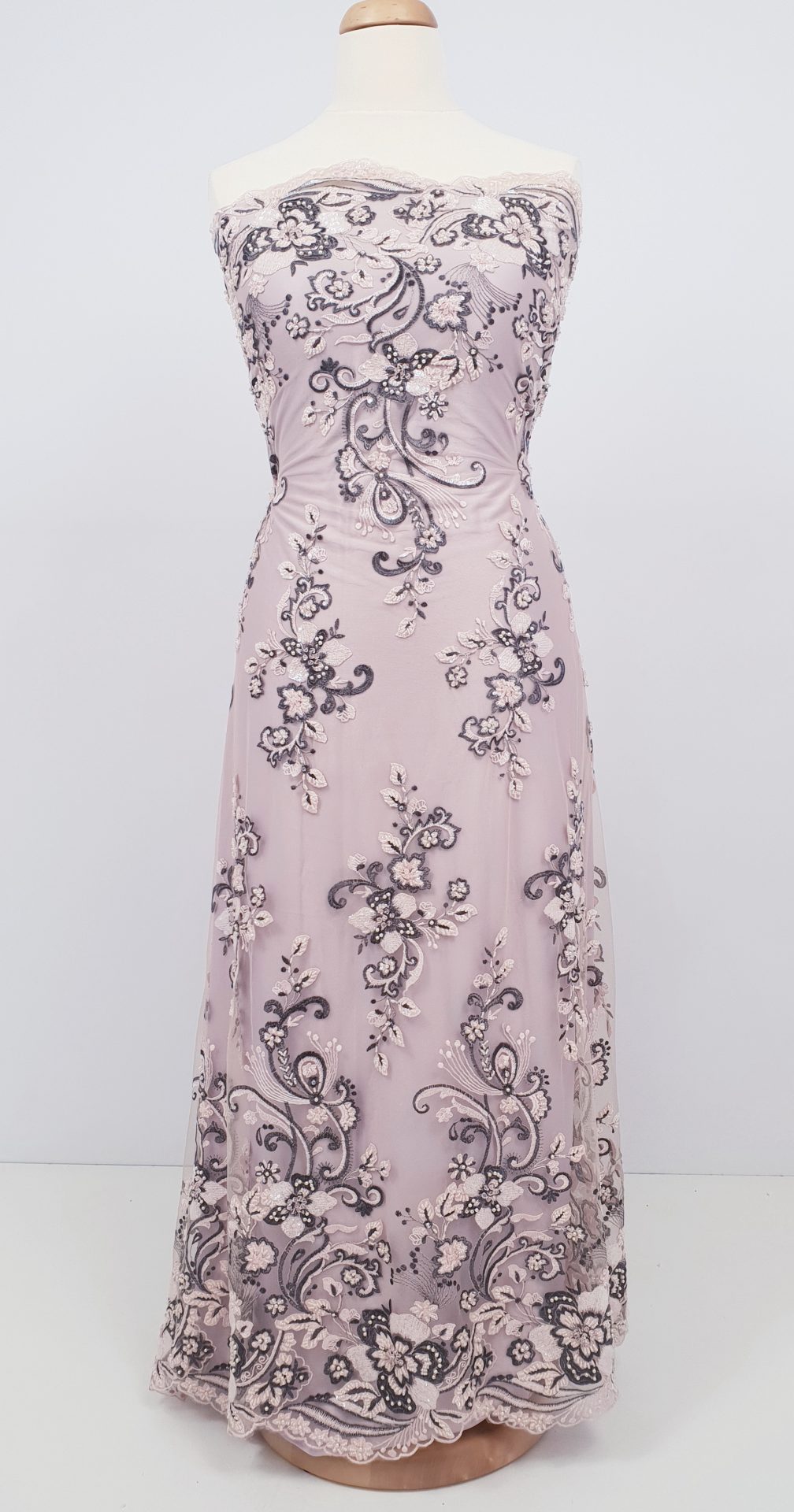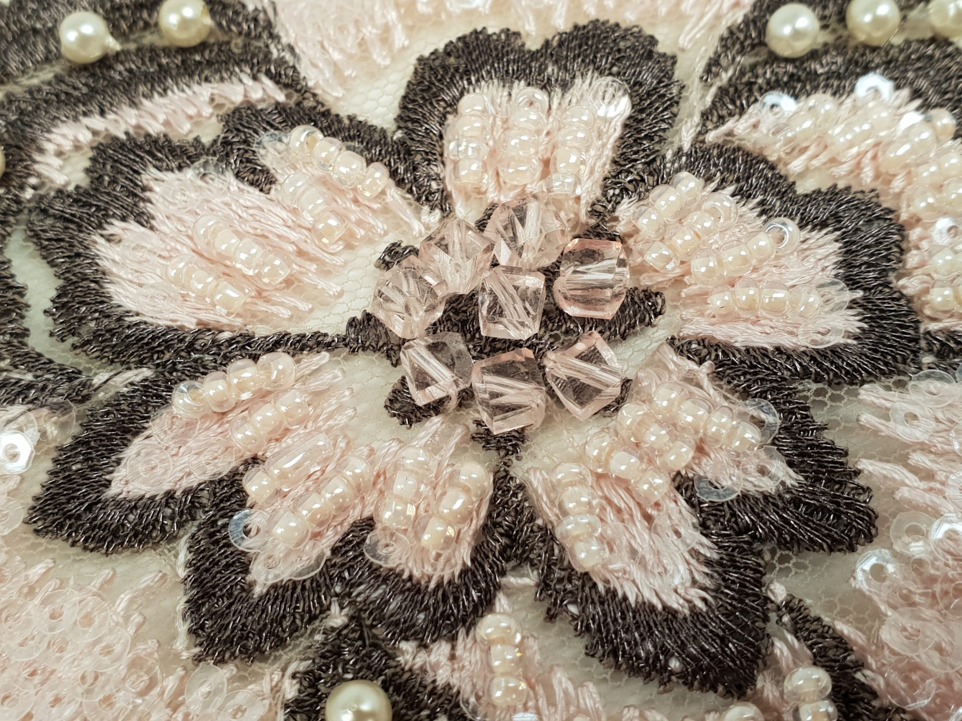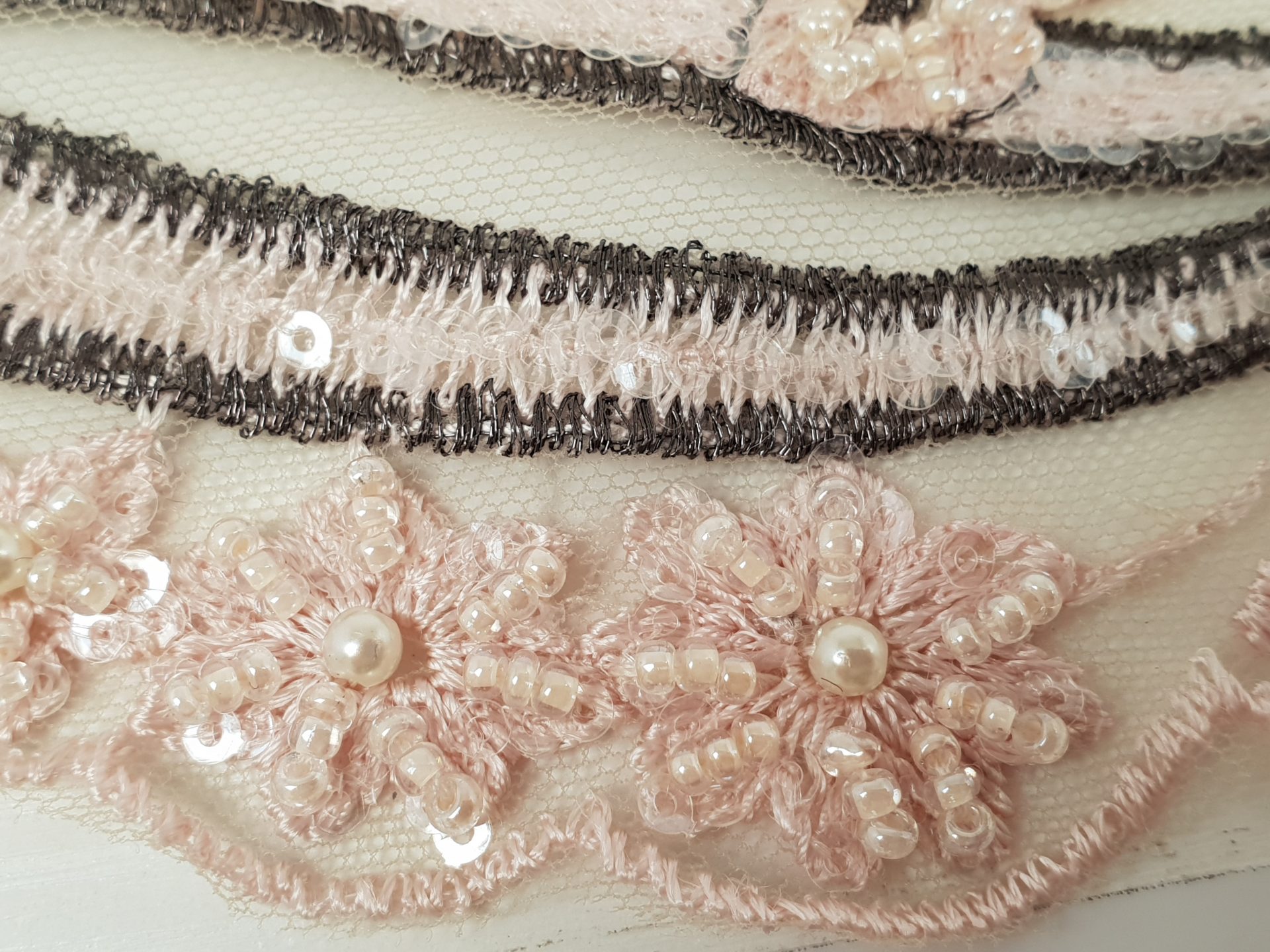 Broderie accesorizata cu motive florale in tonuri de roz pal si gri inchis, cu paiete transparente si margele de diferite forme.