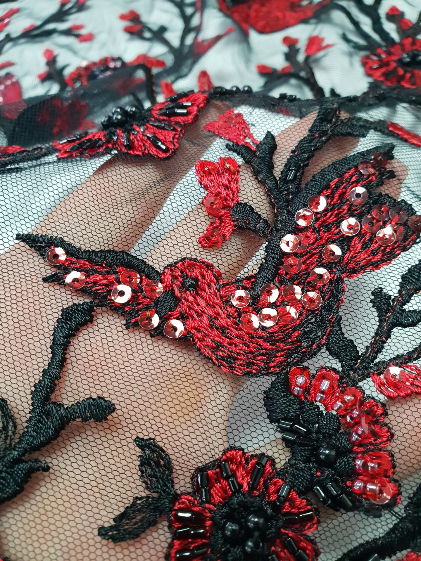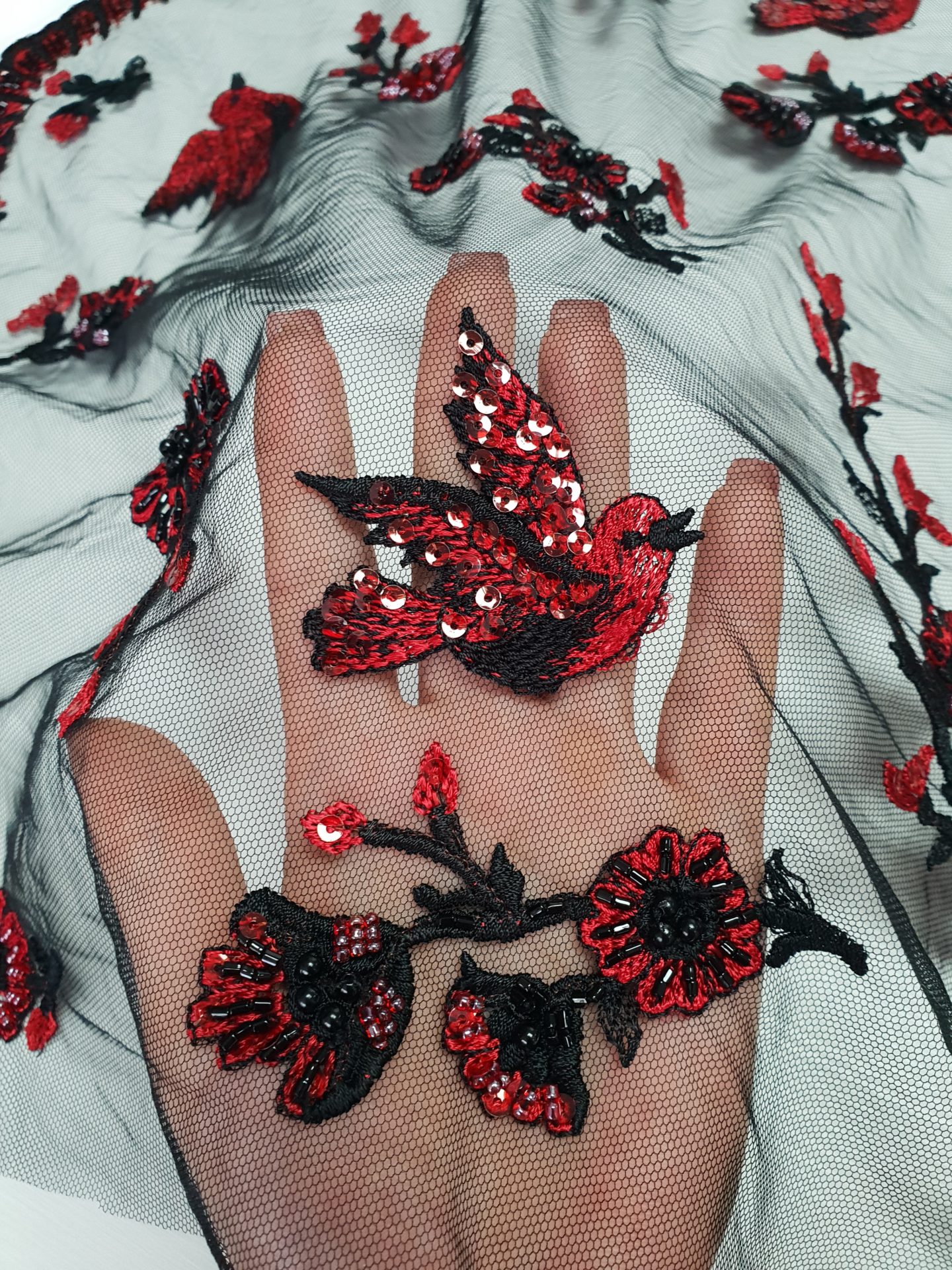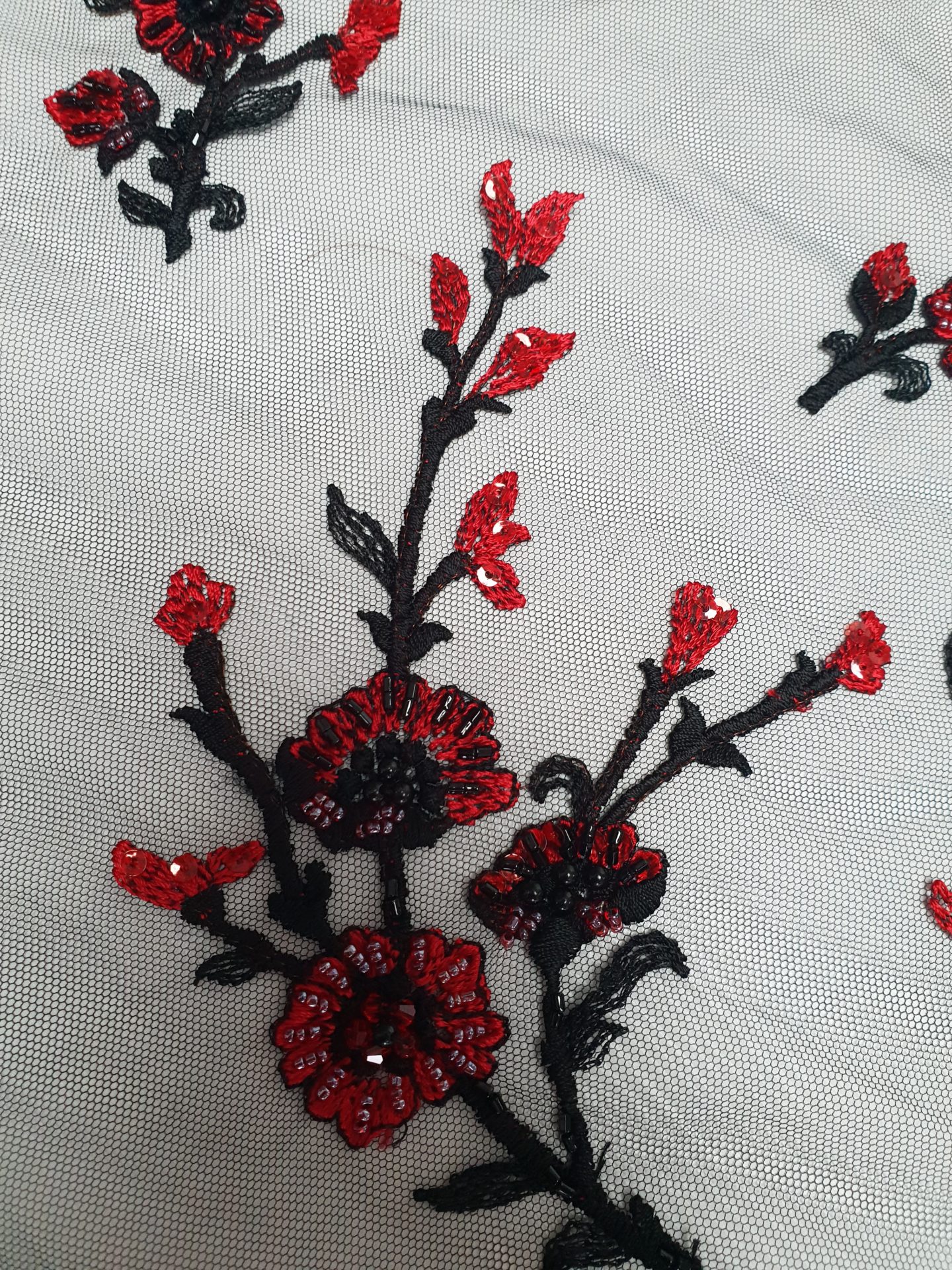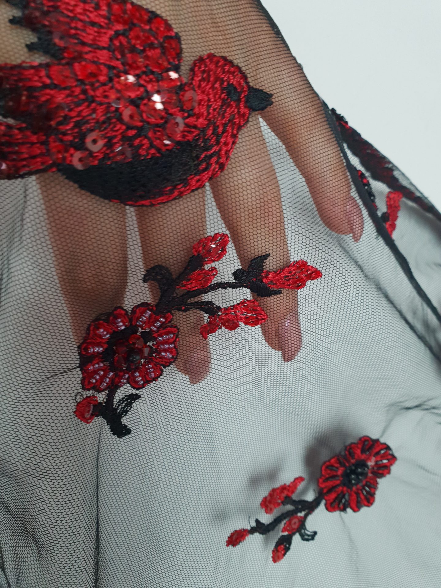 Caracteristici Broderie accesorizata – rosu & negru: