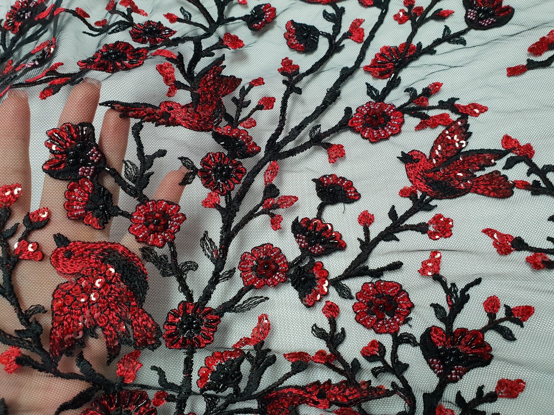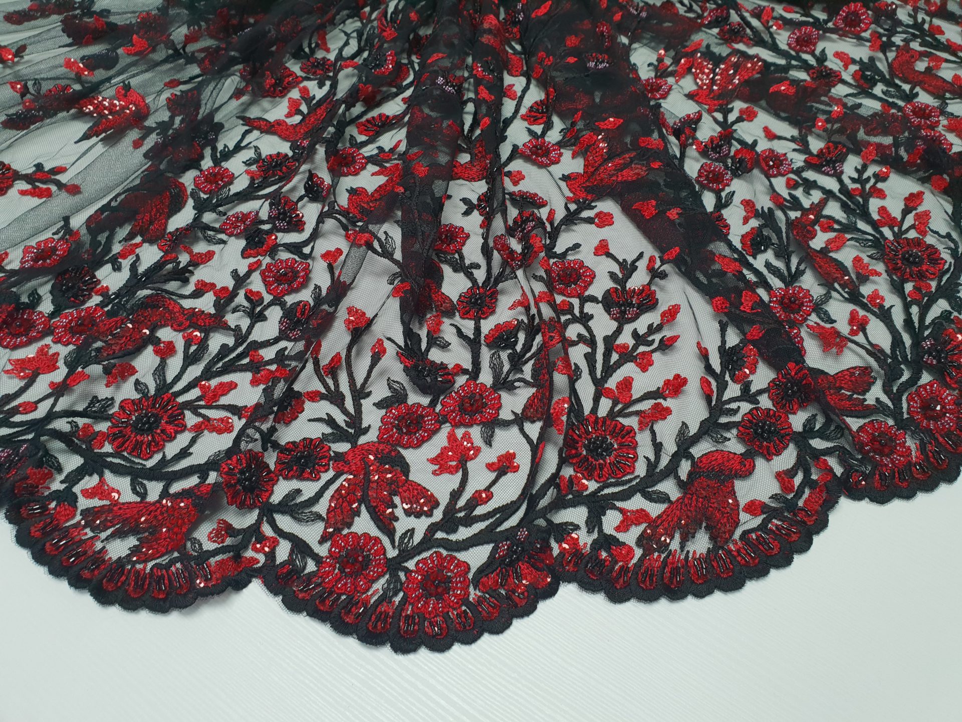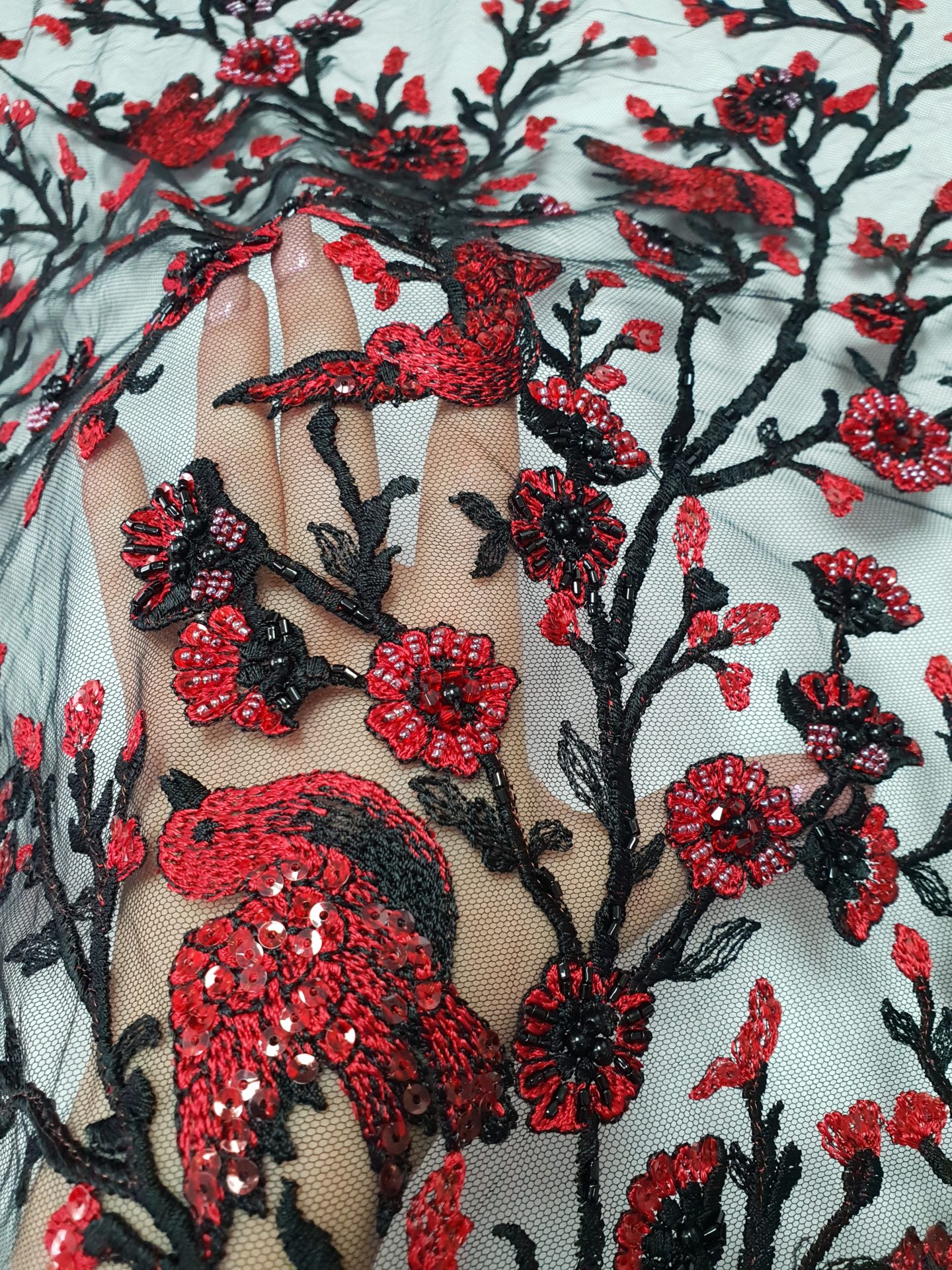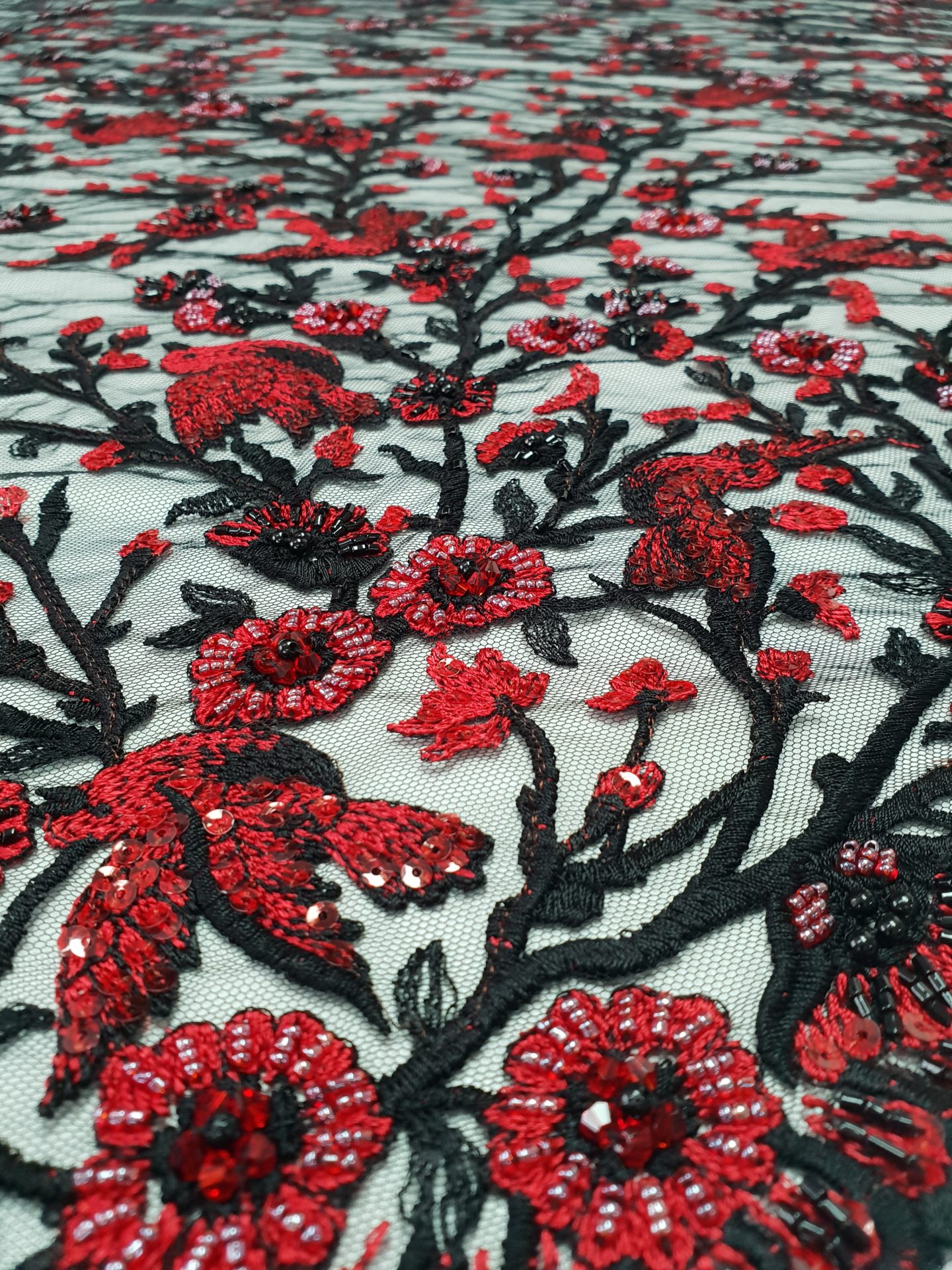 Caracteristici Broderie accesorizata – rosu & negru: