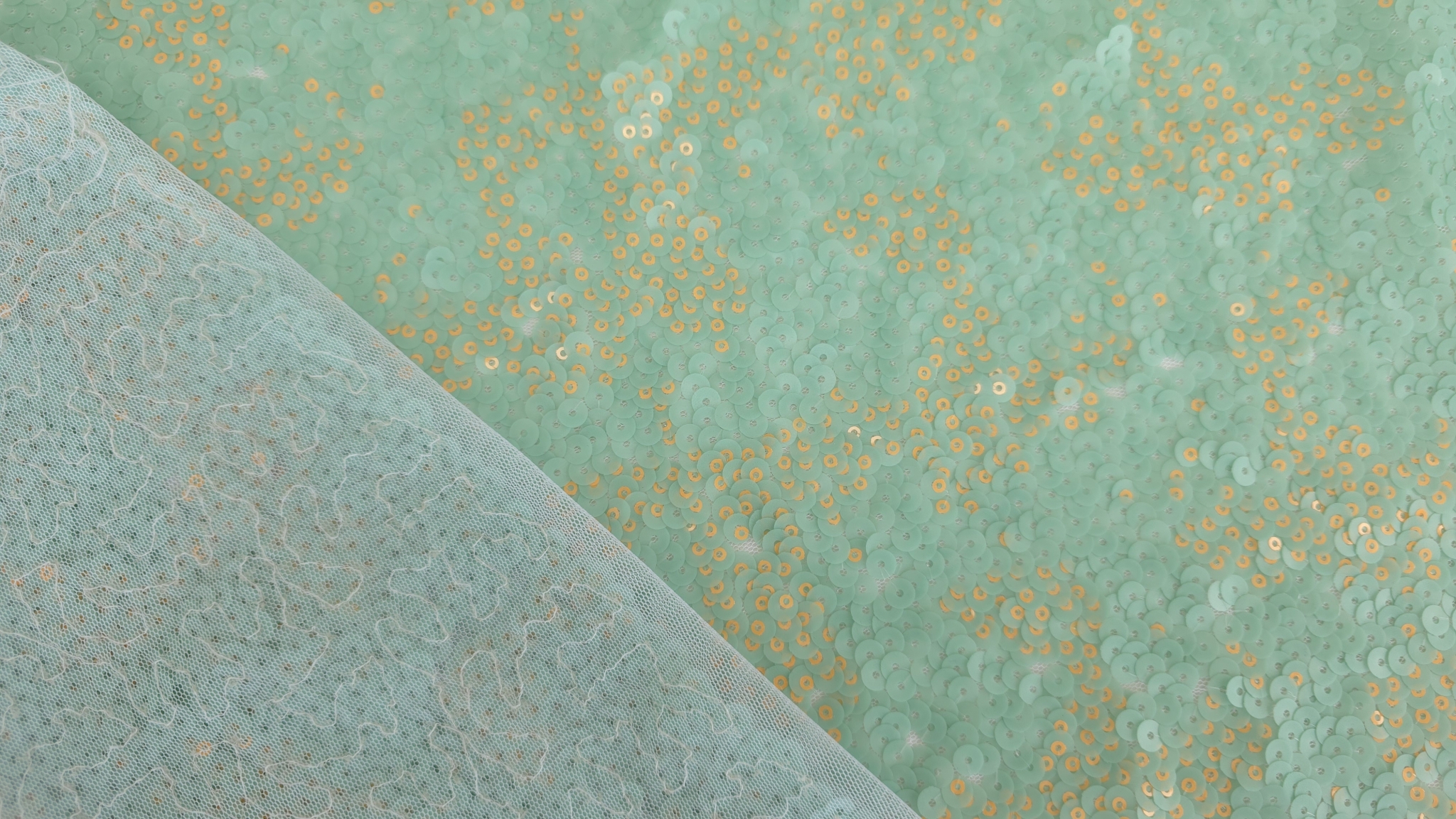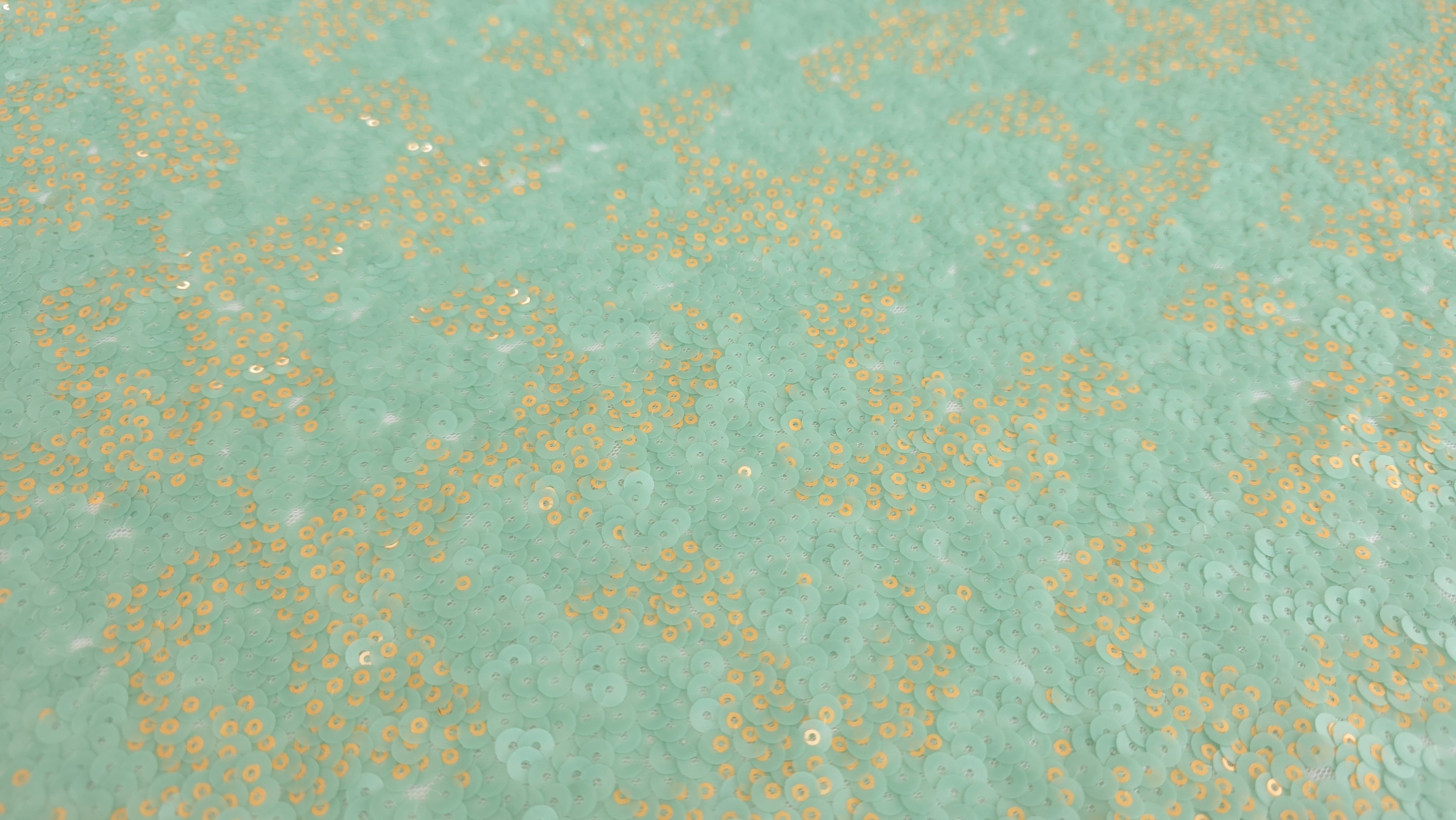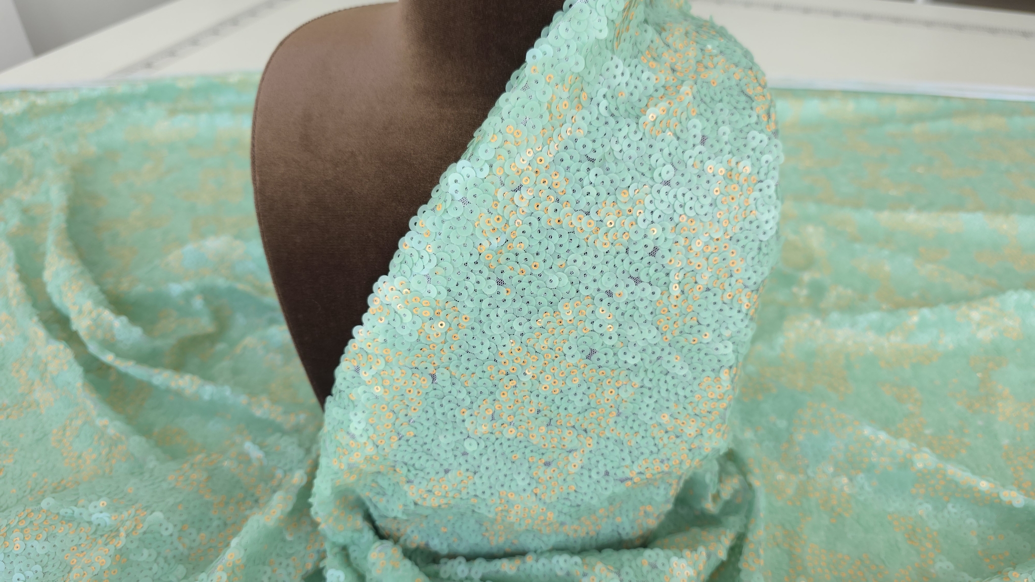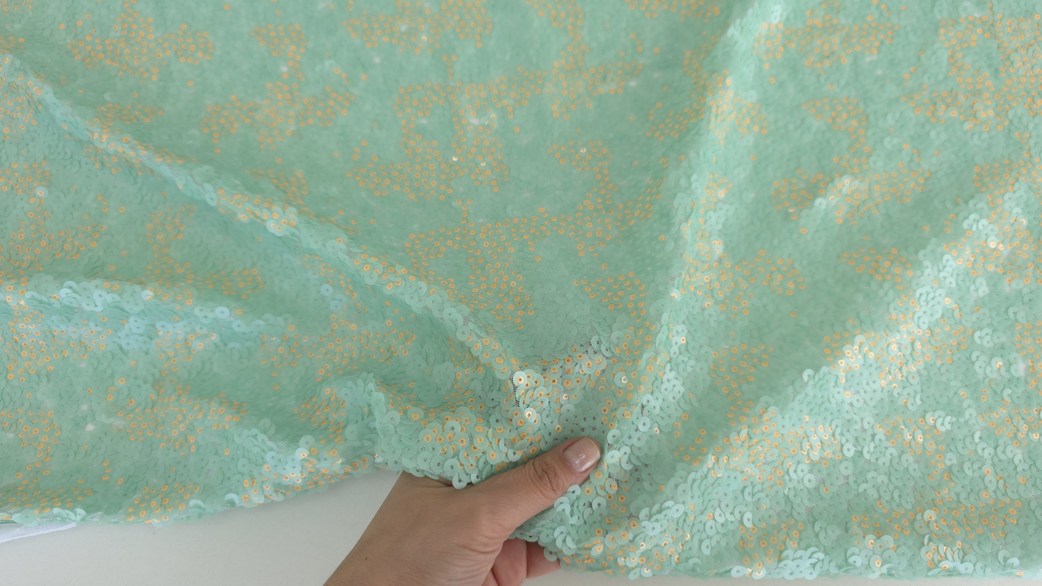 Nuanțele de mint și peach alternează pe suprafața materialului, creând un joc cromatic subtil. Ca material cu paiete mate cusute pe tulle mint și peach metraj, baza de tulle rămâne vizibilă în spațiile dintre grupurile de paiete, adăugând o ușoară transparență care permite suprapunerea peste un material de bază în culoarea dorită.