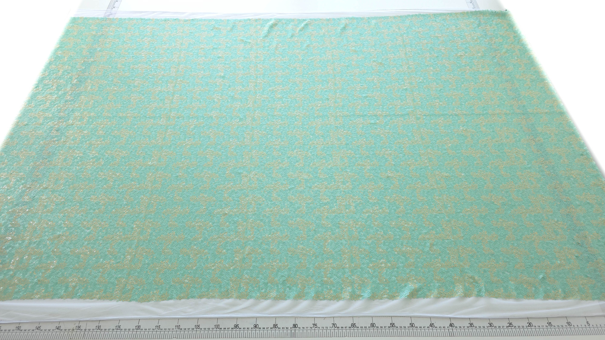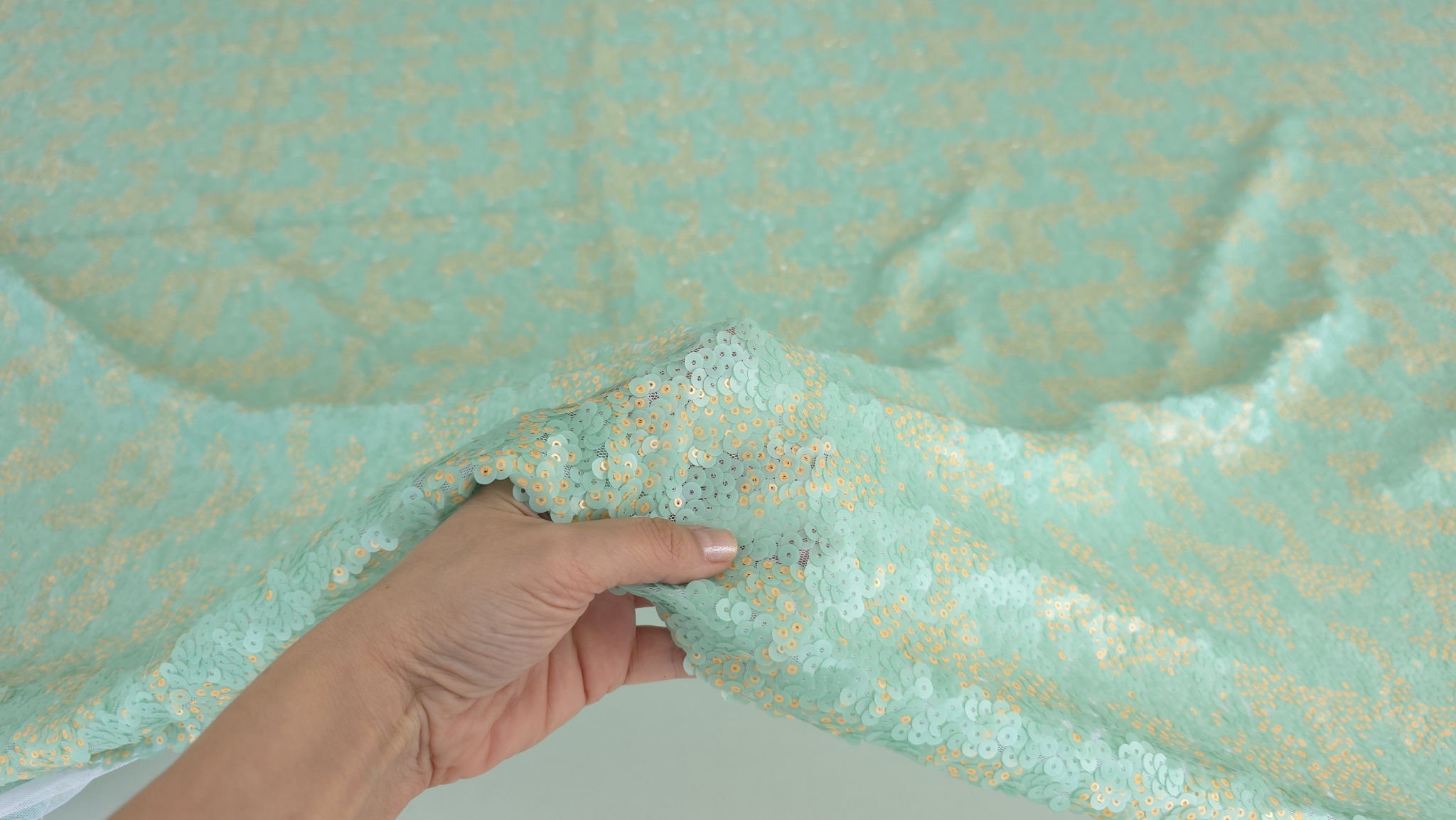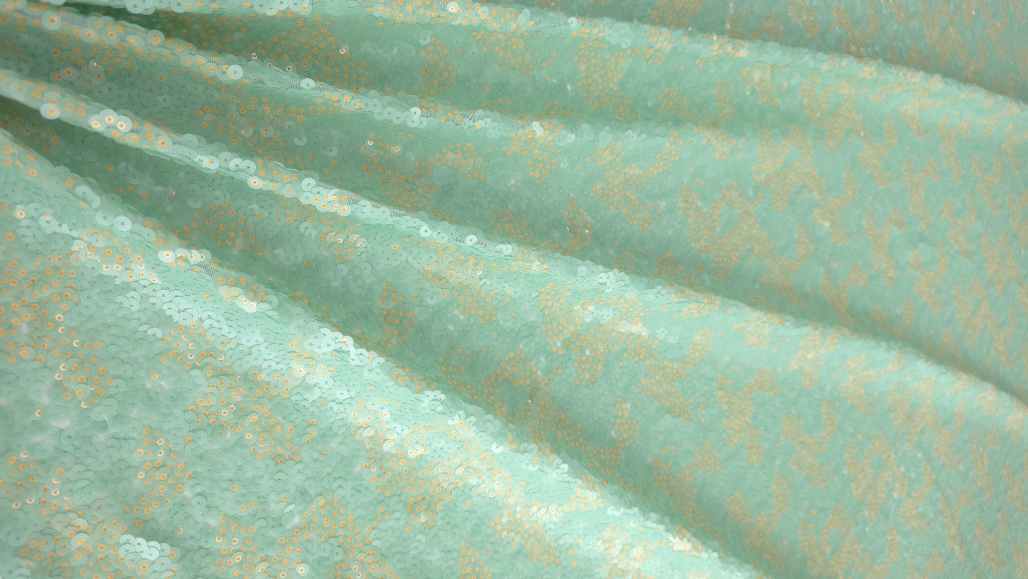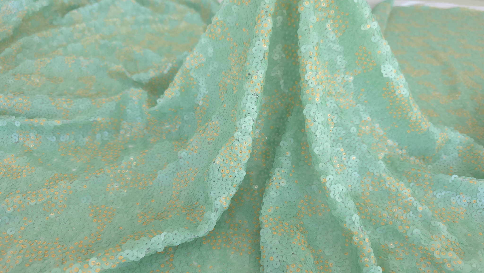 Nuanțele de mint și peach alternează pe suprafața materialului, creând un joc cromatic subtil. Ca material cu paiete mate cusute pe tulle mint și peach metraj, baza de tulle rămâne vizibilă în spațiile dintre grupurile de paiete, adăugând o ușoară transparență care permite suprapunerea peste un material de bază în culoarea dorită.