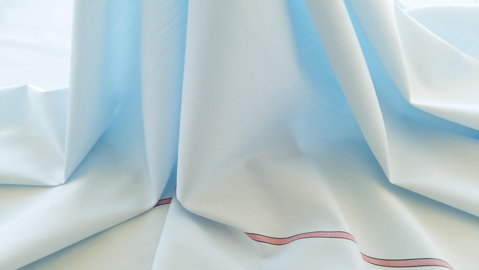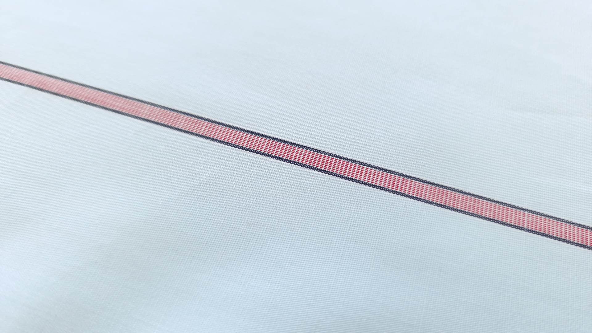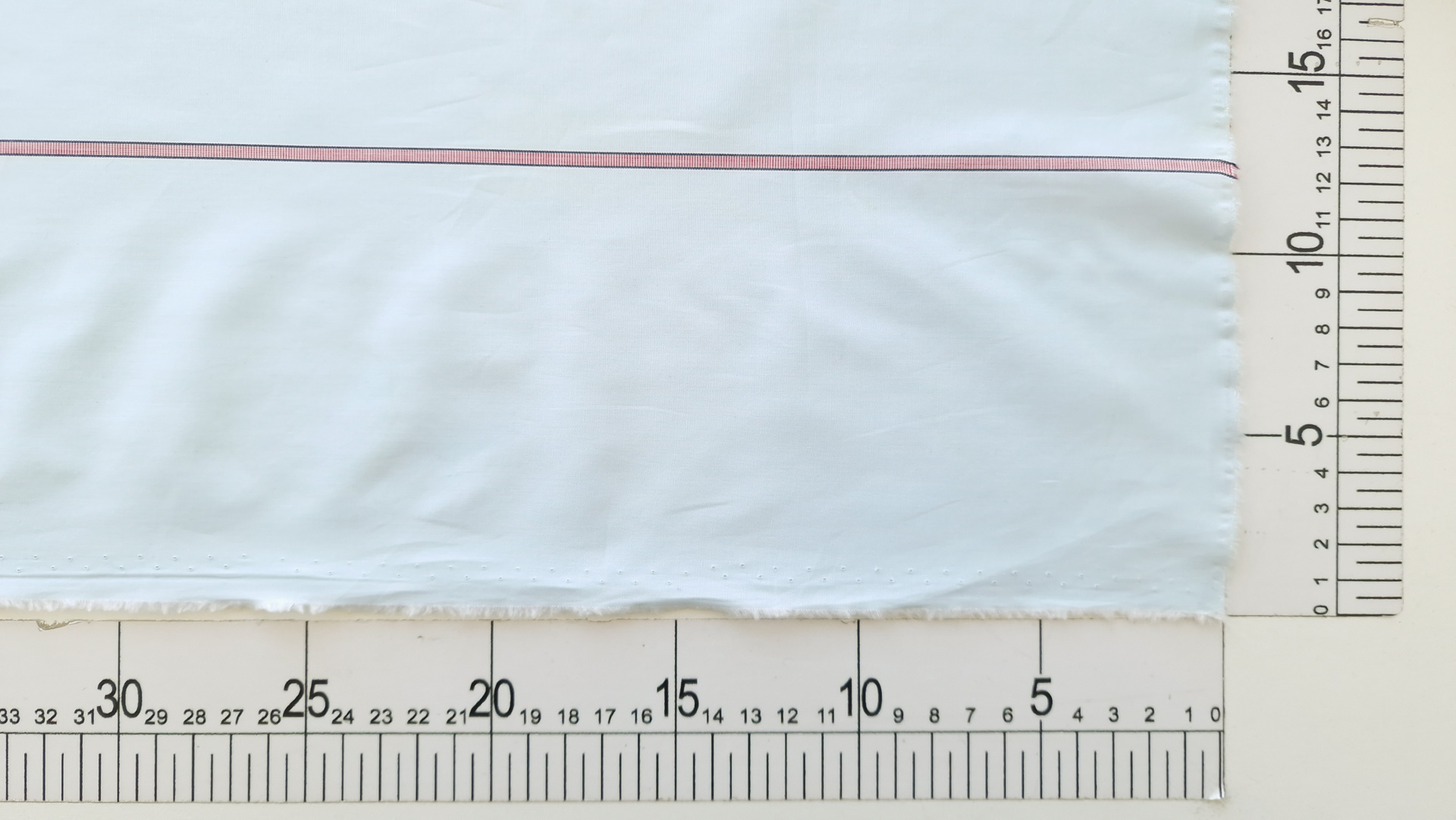 Poplin subtire bleu din bumbac usor elastic, cu o textura placuta la atingere, model cu o linie rosie subtire brodata pe toata lungimea materialului.