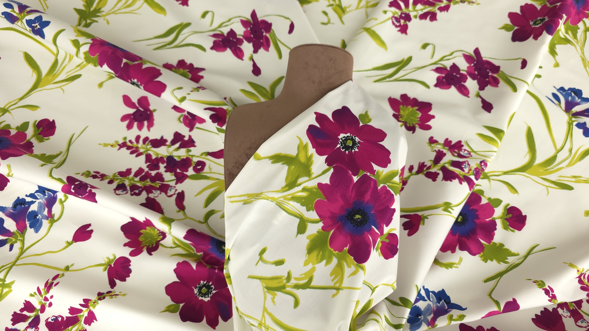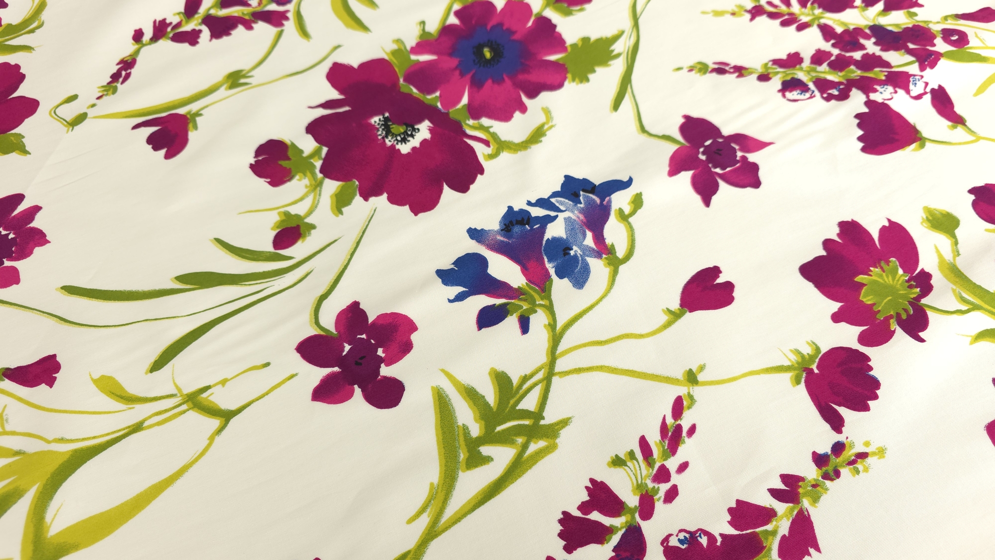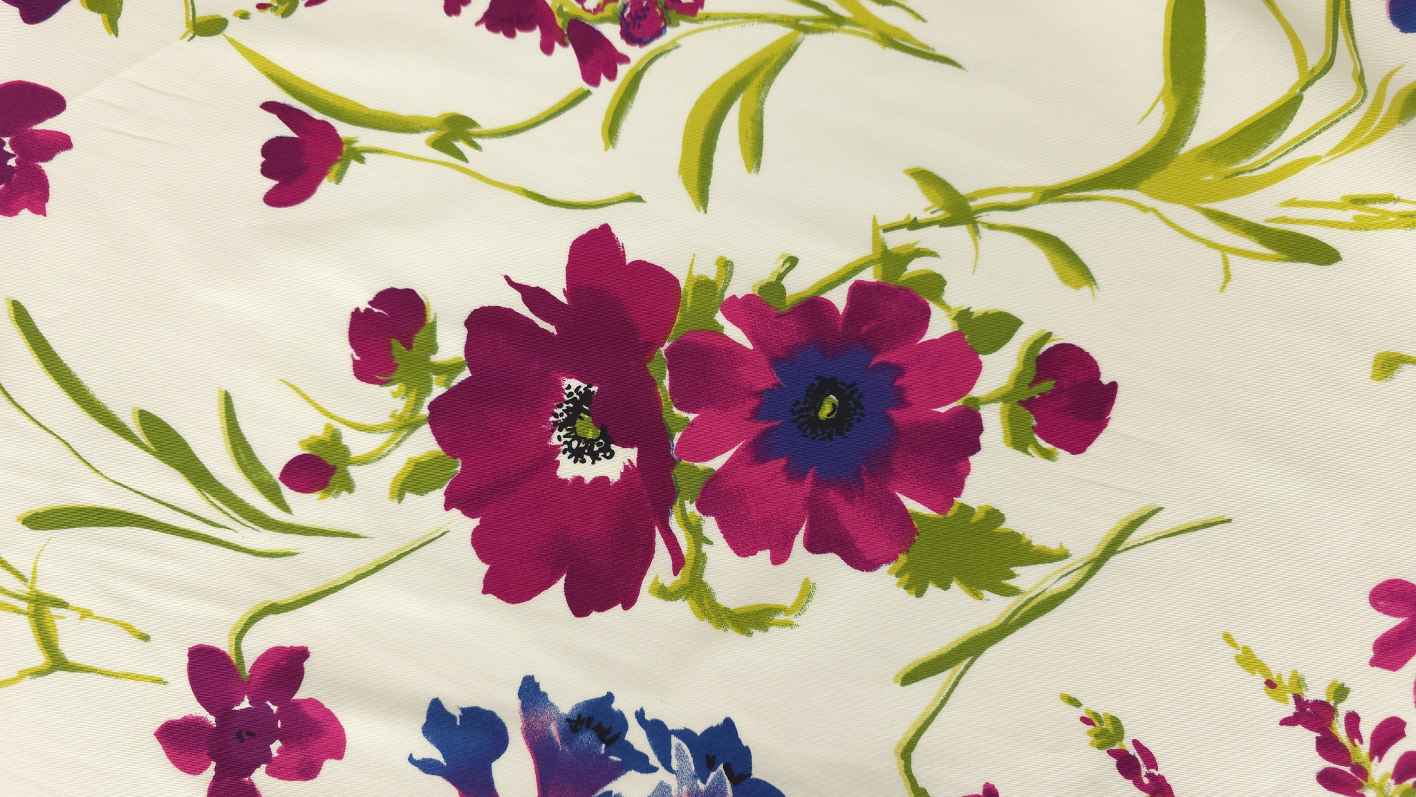Poplin gros elastic cu model floral distribuit pe toată suprafața, cu un imprimeu botanic multicolor pictat în tușe pensulate.