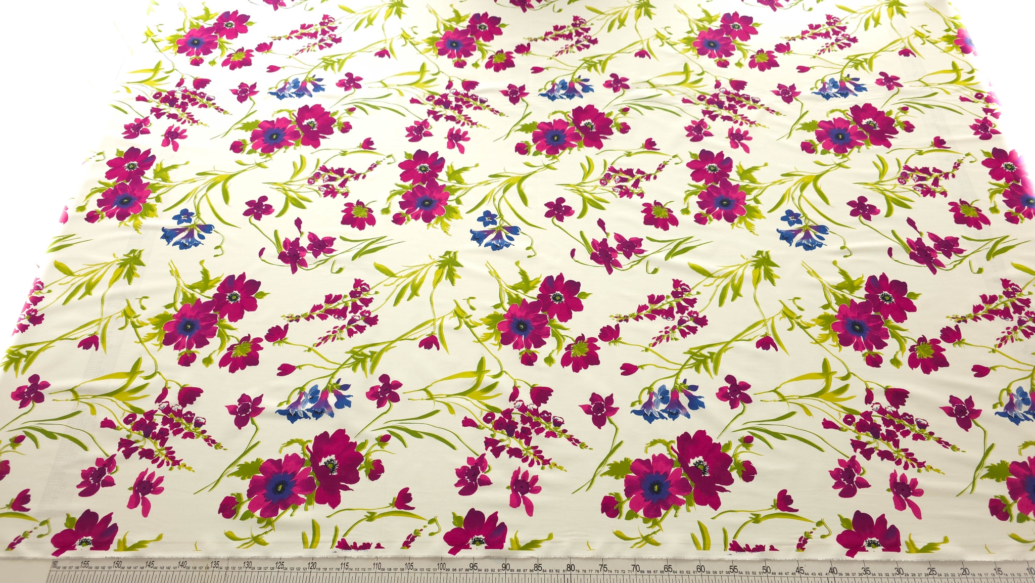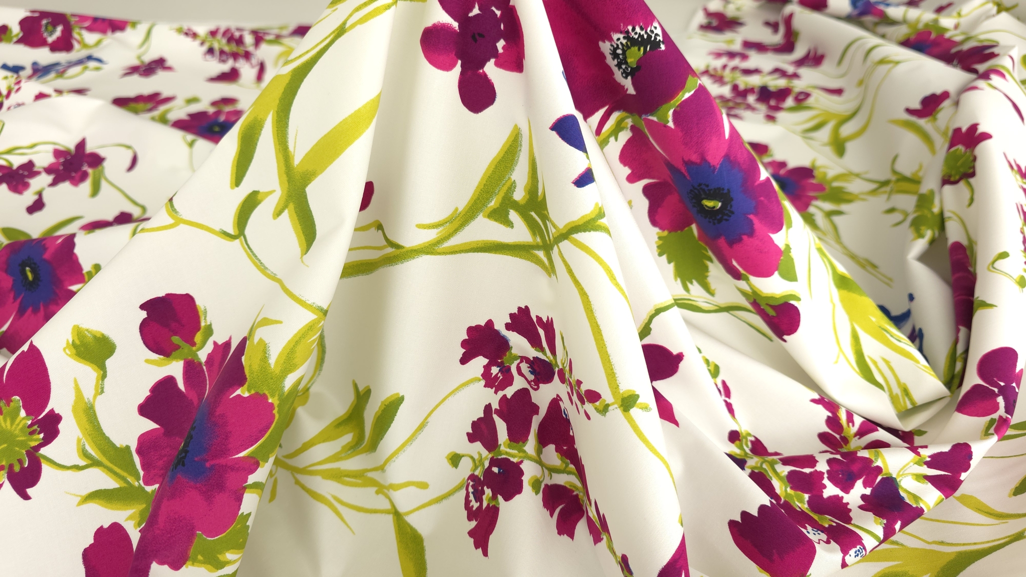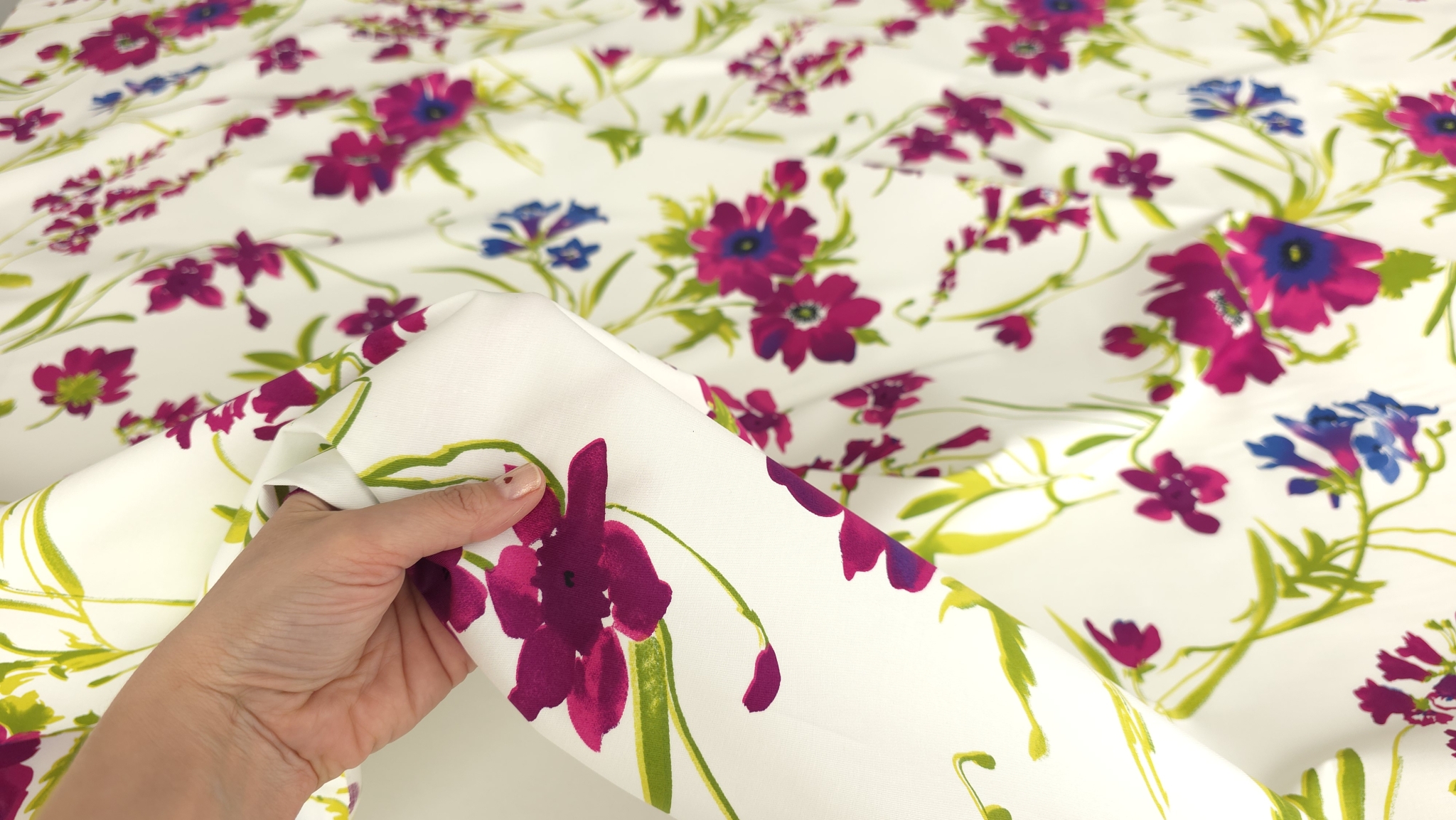 Poplin gros elastic cu model floral distribuit pe toată suprafața, cu un imprimeu botanic multicolor pictat în tușe pensulate.