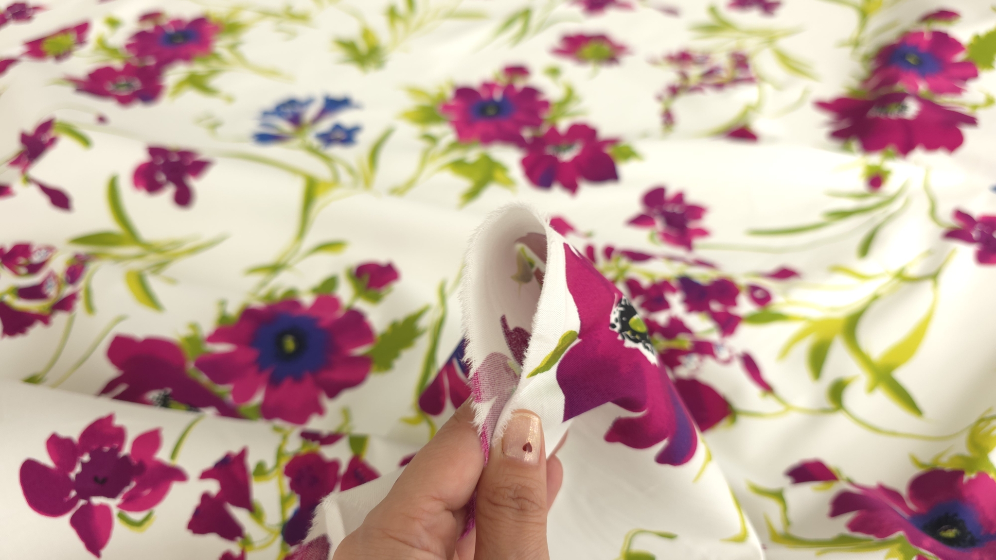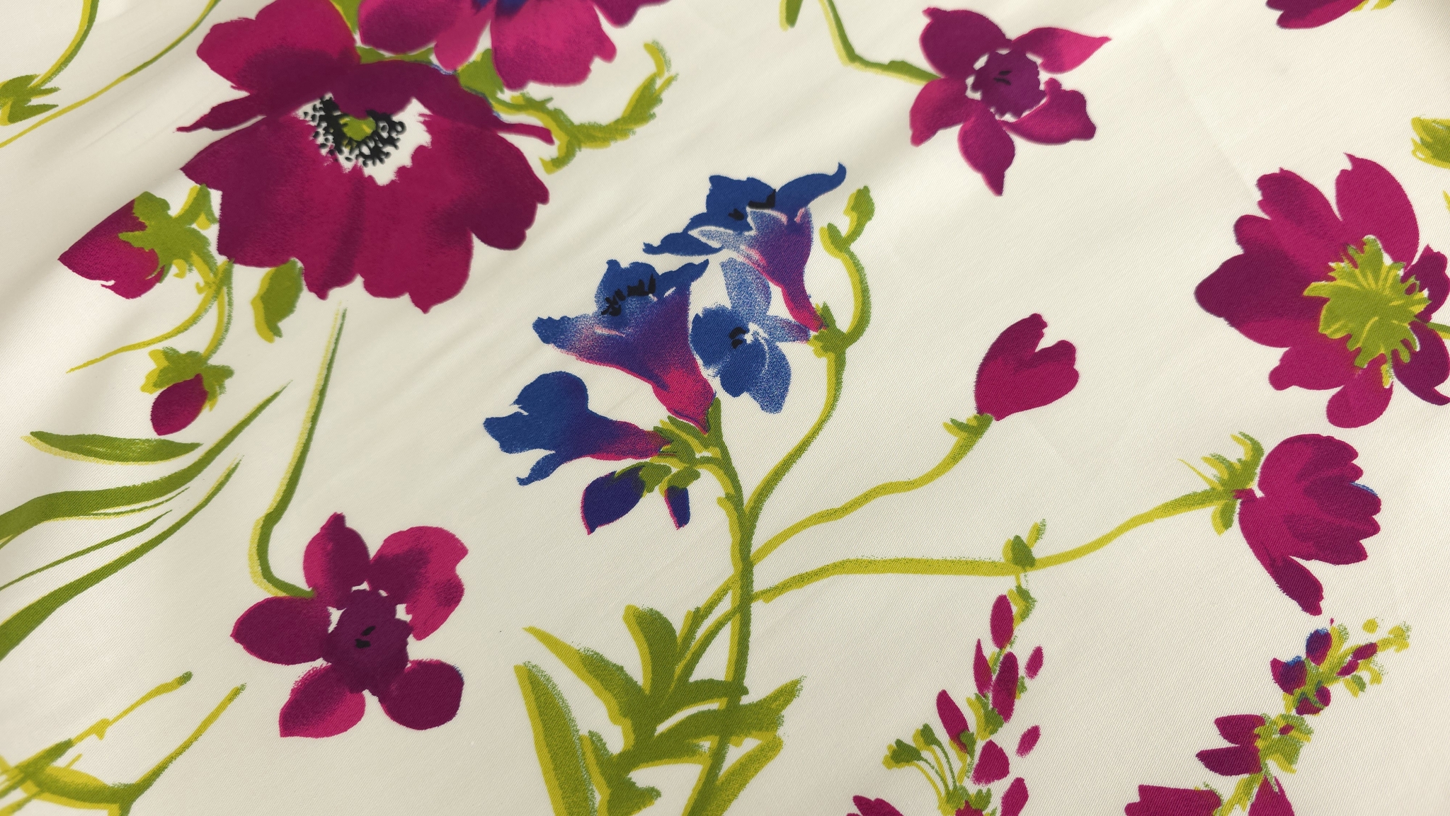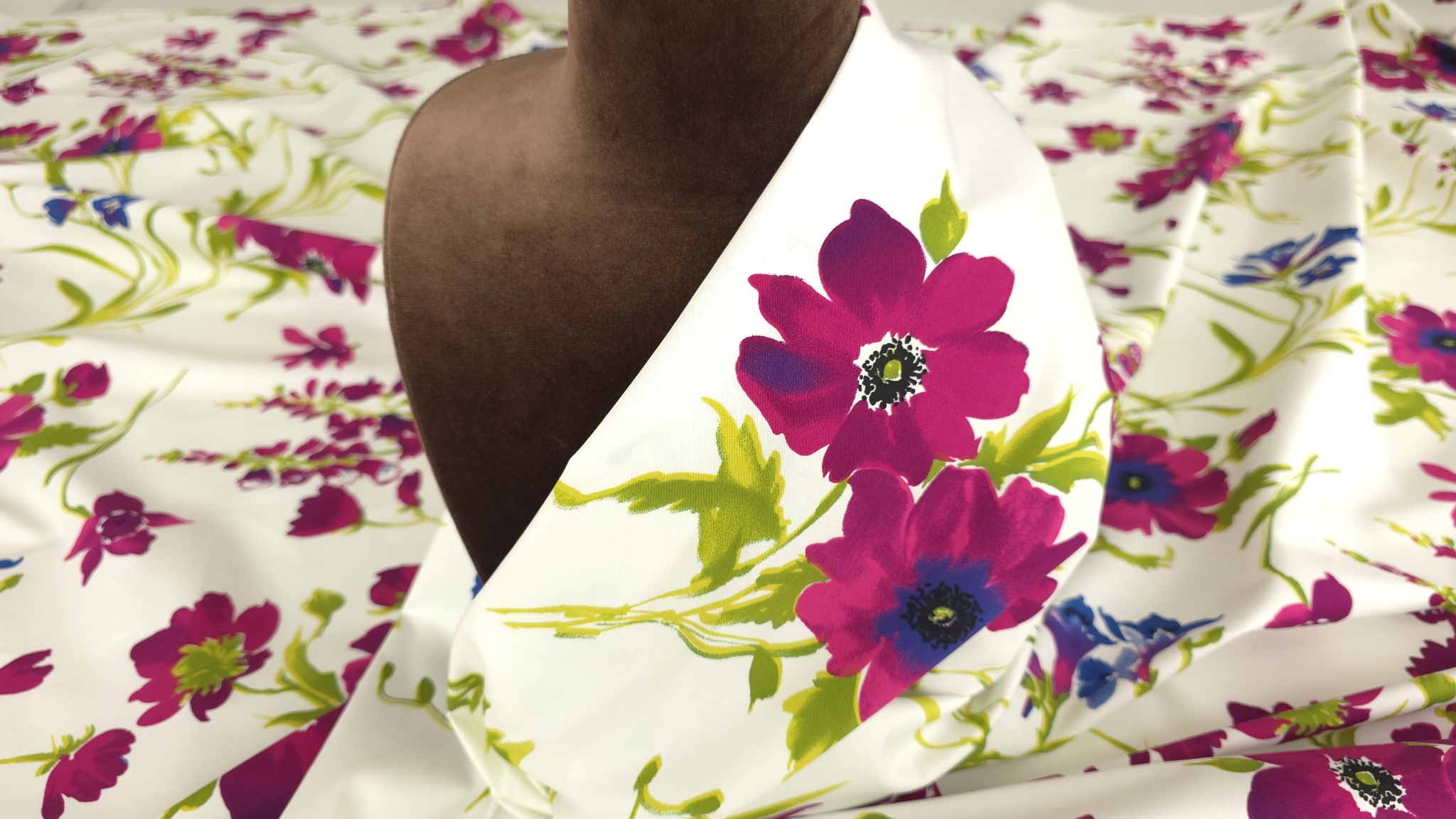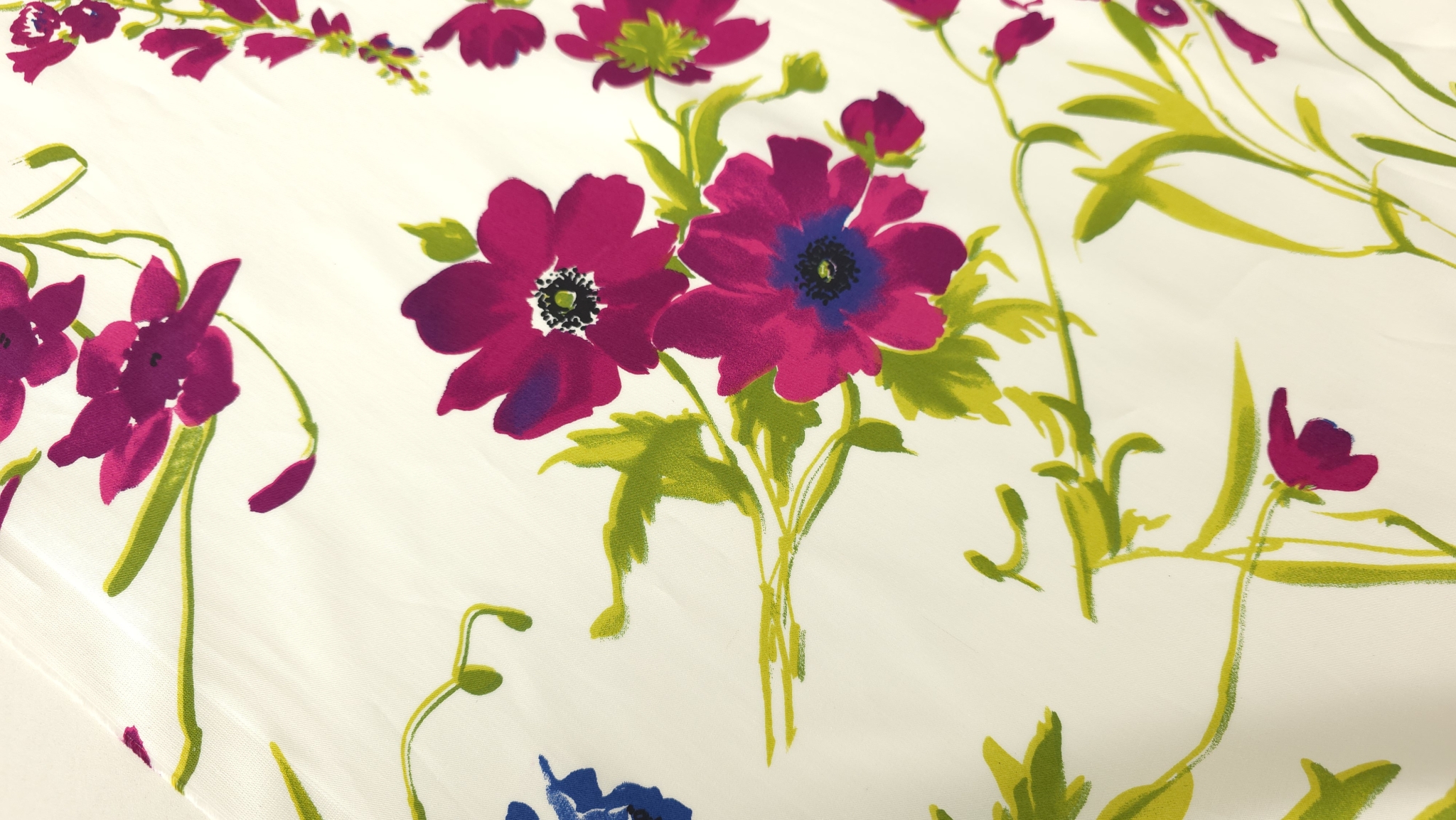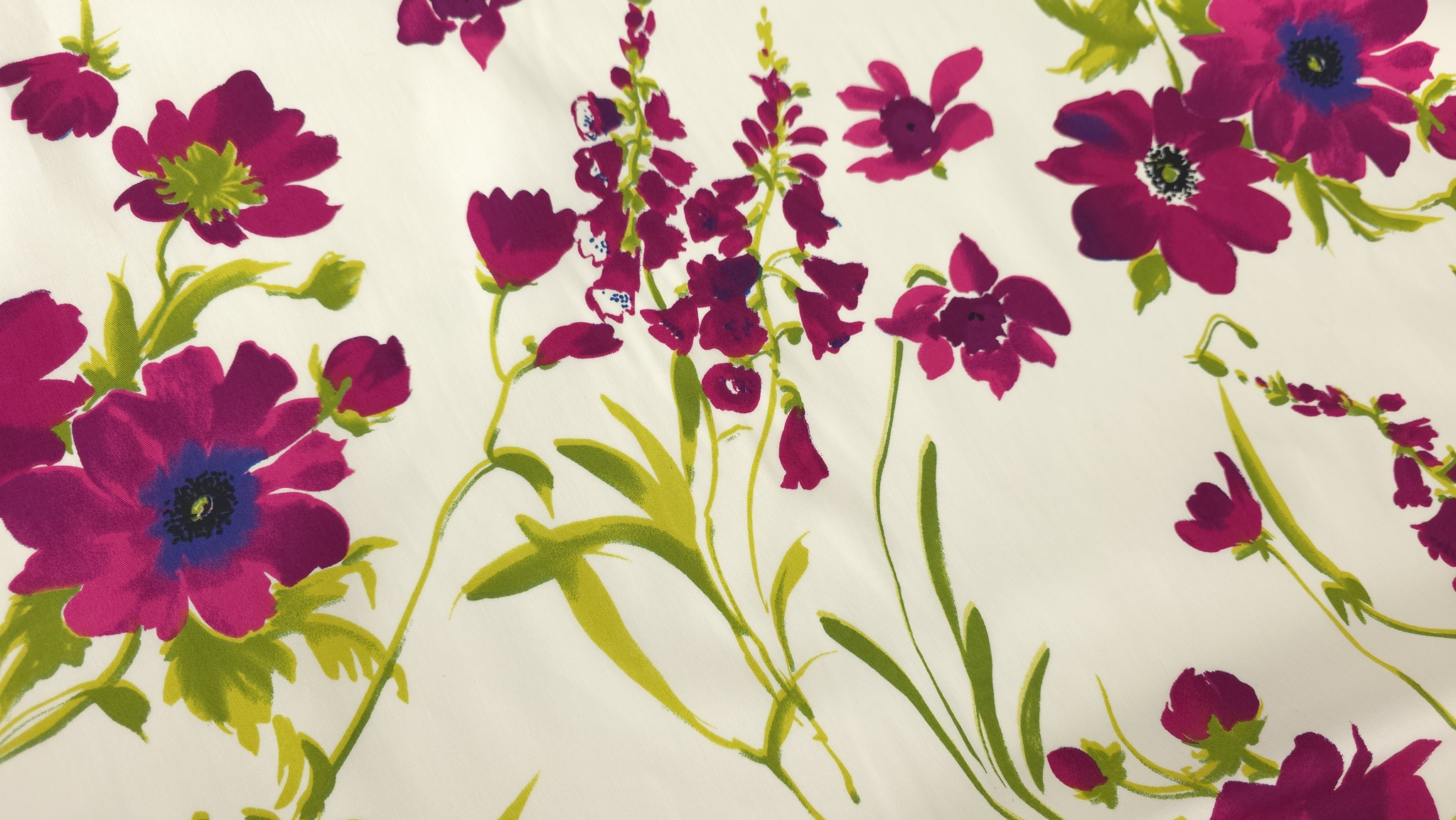 Imprimeul debordează de energie prin flori mari și intens colorate. Această variantă de poplin bumbac cu imprimeu floral atrage privirea prin contrastul curat. Designul modern oferă materialului o identitate vizuală proaspătă și plină de optimism. Fiecare detaliu pare pictat cu grijă pentru un efect vizual spectaculos.