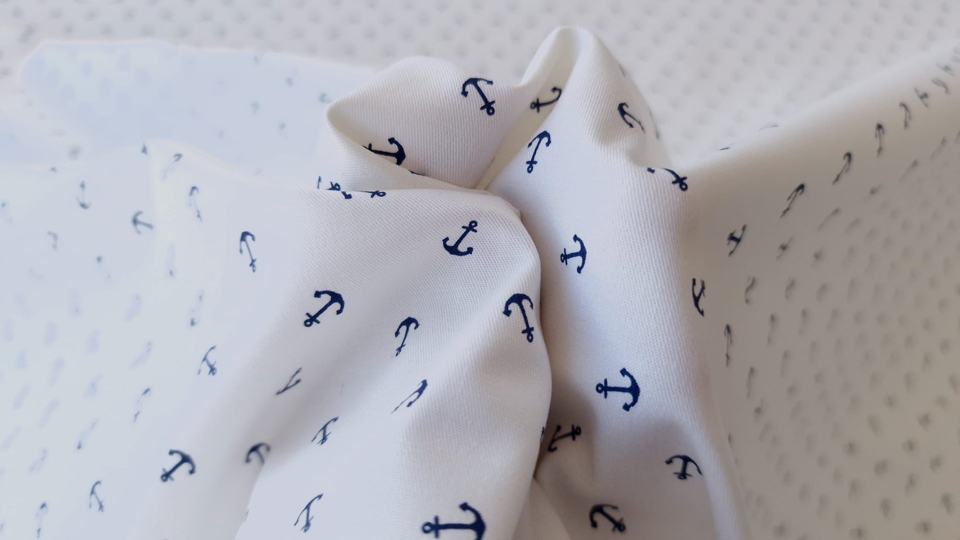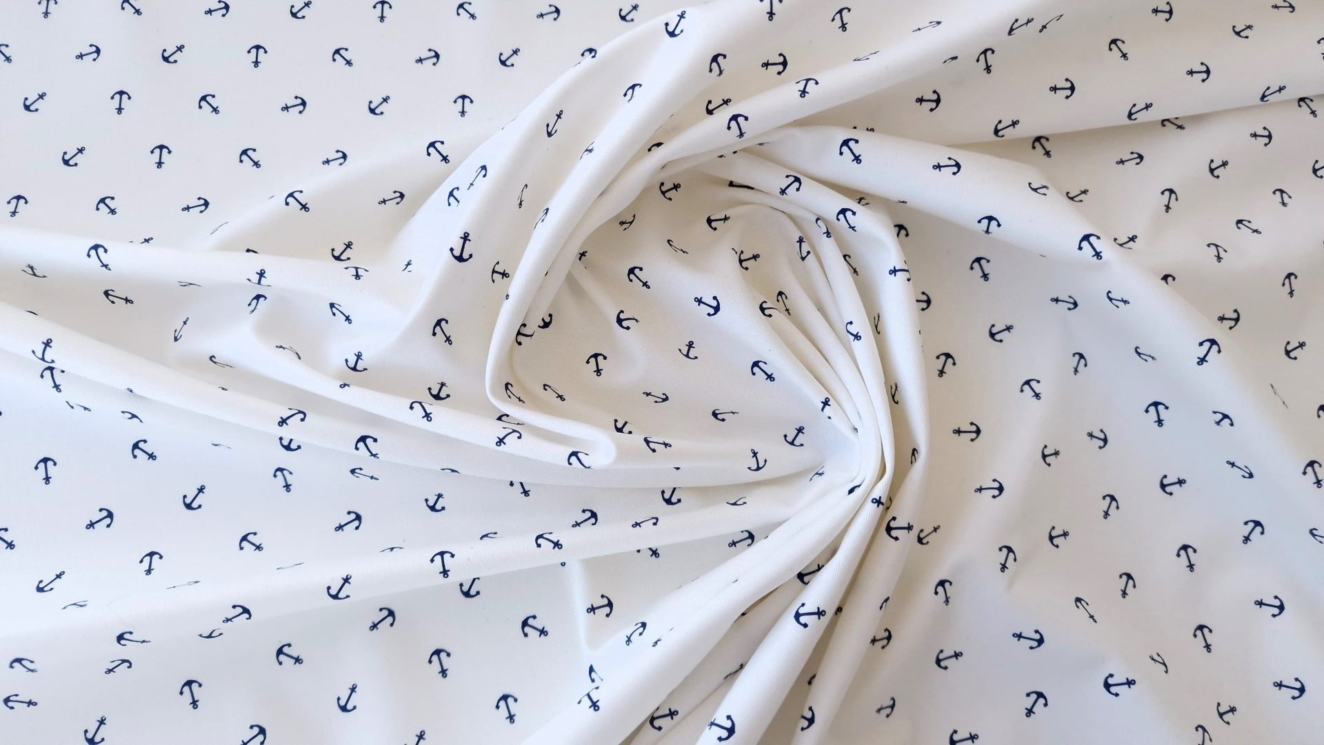 Poplin ivoire usor elastic cu model ancore bleumarin, cu o textura placuta la atingere, cu un grad ridicat de respirabilitate.