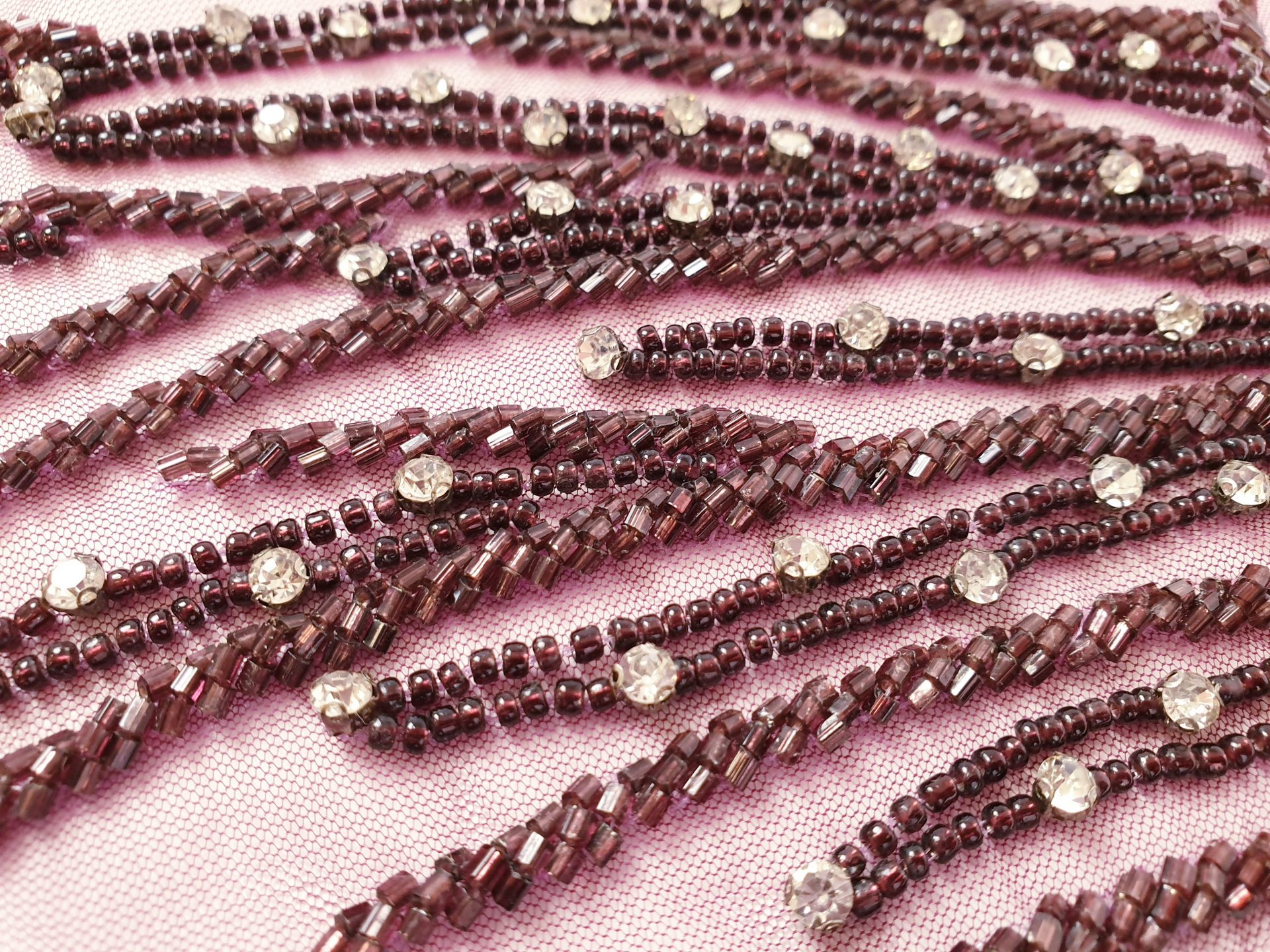 Modelul este realizat din margele rotunde, tubulare in tonuri de mov pruna si accesorizat cu cristale.