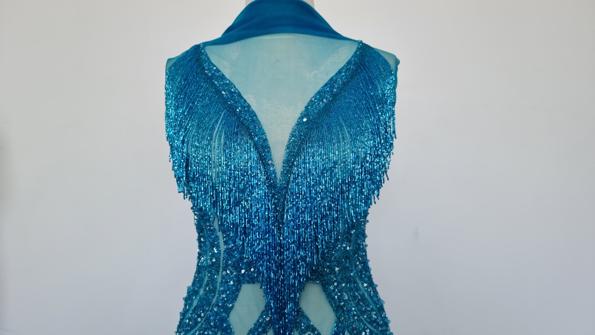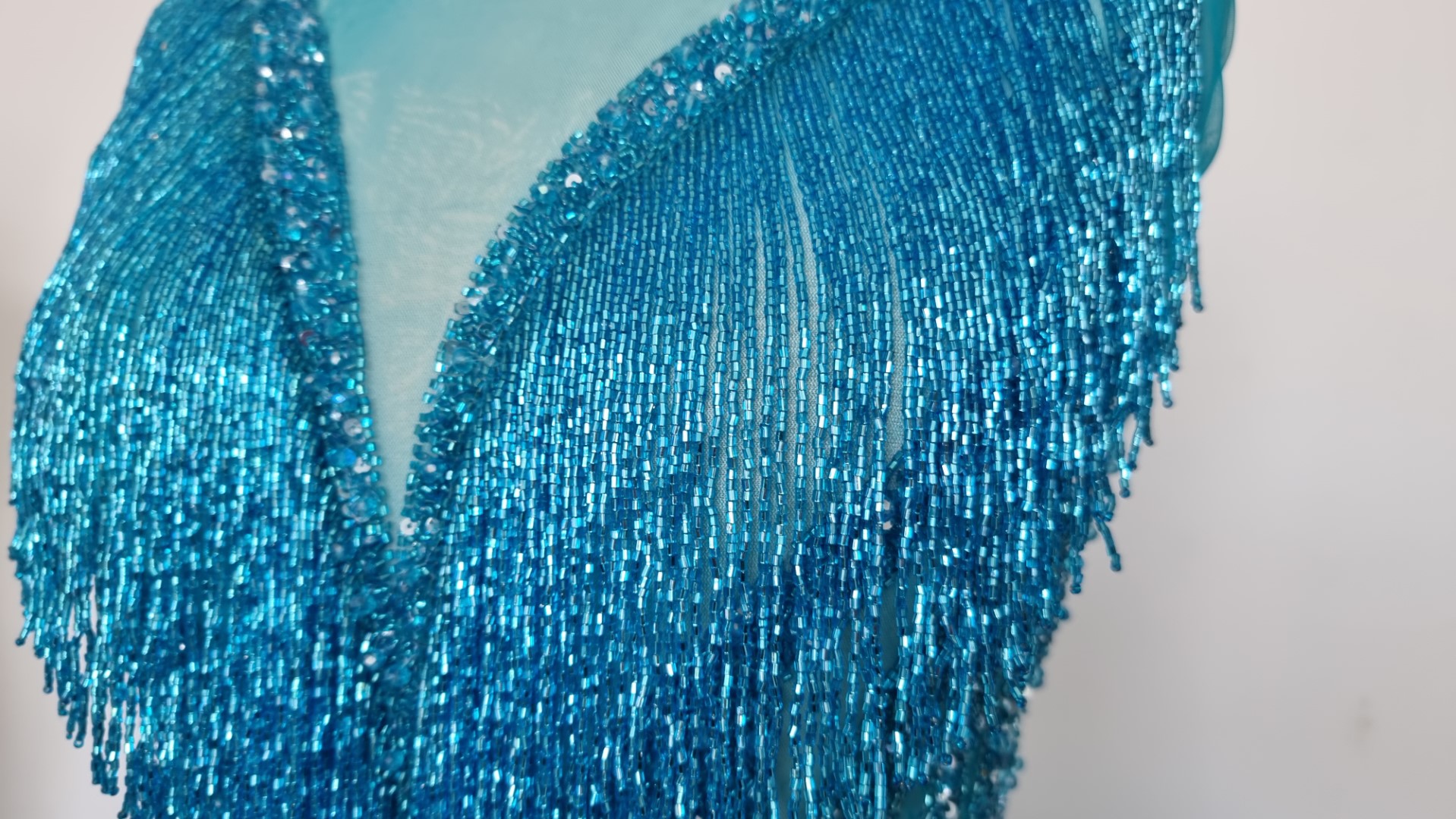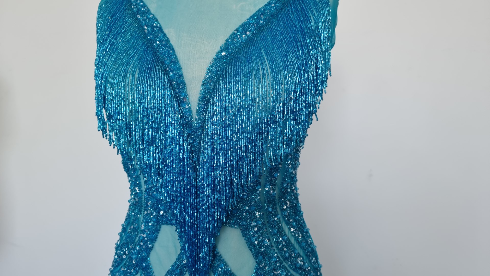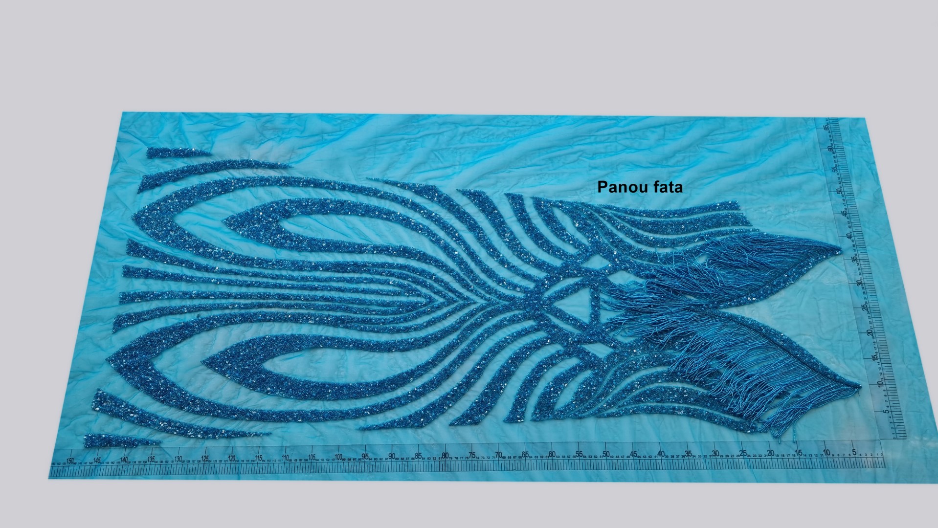 Rochie lunga accesorizata manual cu franjuri olympic blue , set din 4 panouri (fata, spate, 2 maneci ) realizate 100% manual din micropaiete, margele, ideal pentru a concepe cu usurinta o rochie eleganta.