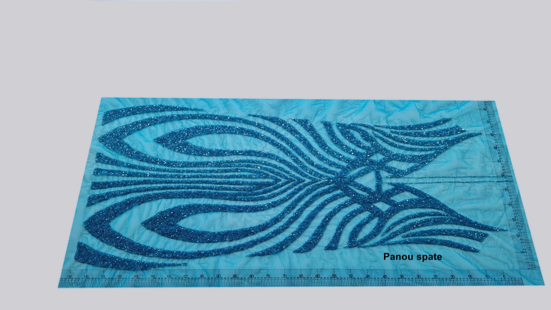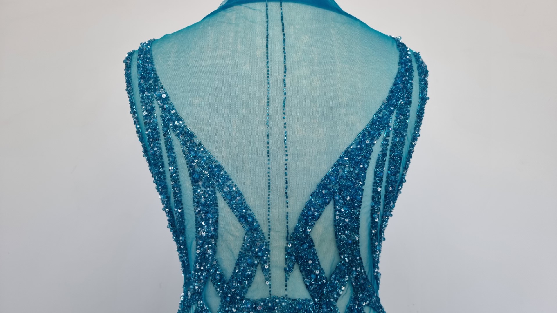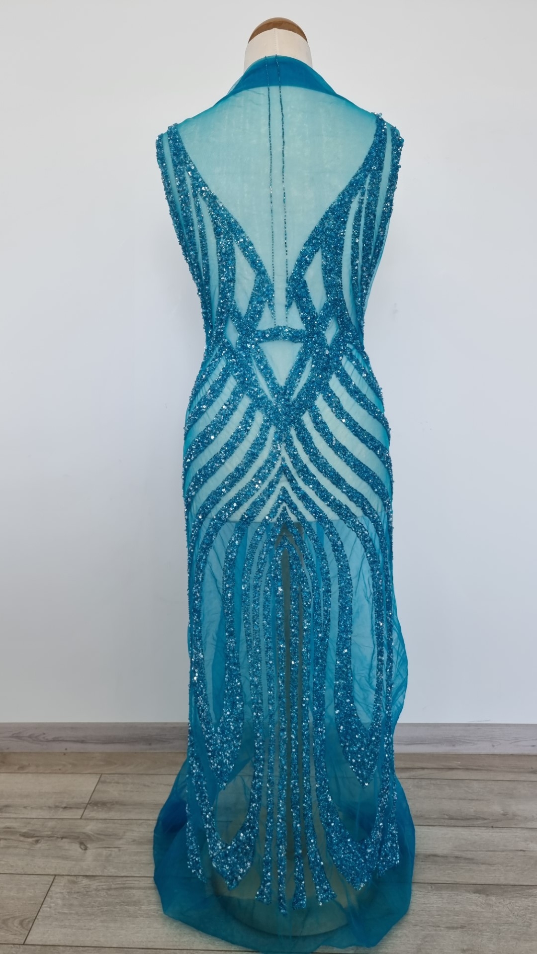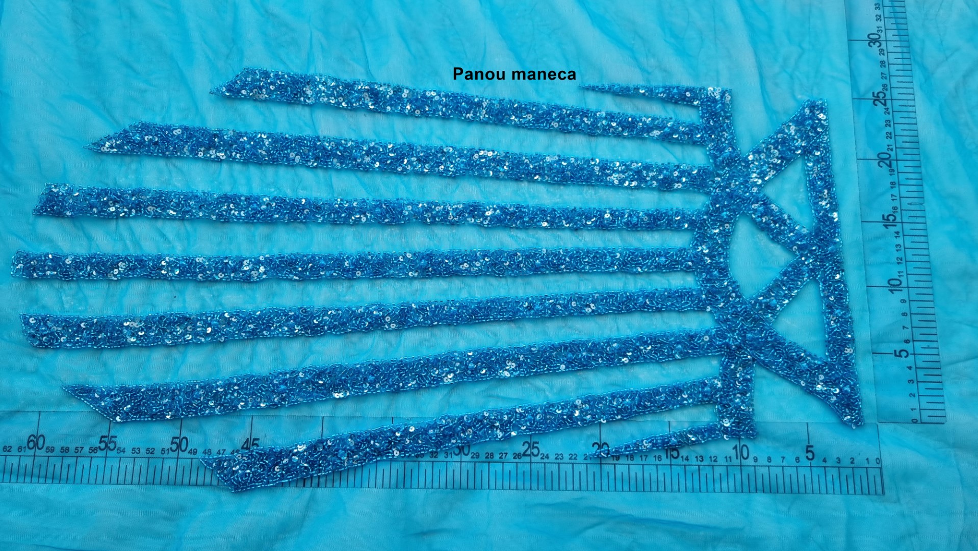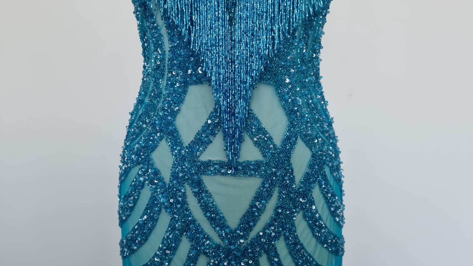 Rochie lunga accesorizata manual cu franjuri olympic blue , set din 4 panouri (fata, spate, 2 maneci ) realizate 100% manual din micropaiete, margele, ideal pentru a concepe cu usurinta o rochie eleganta.