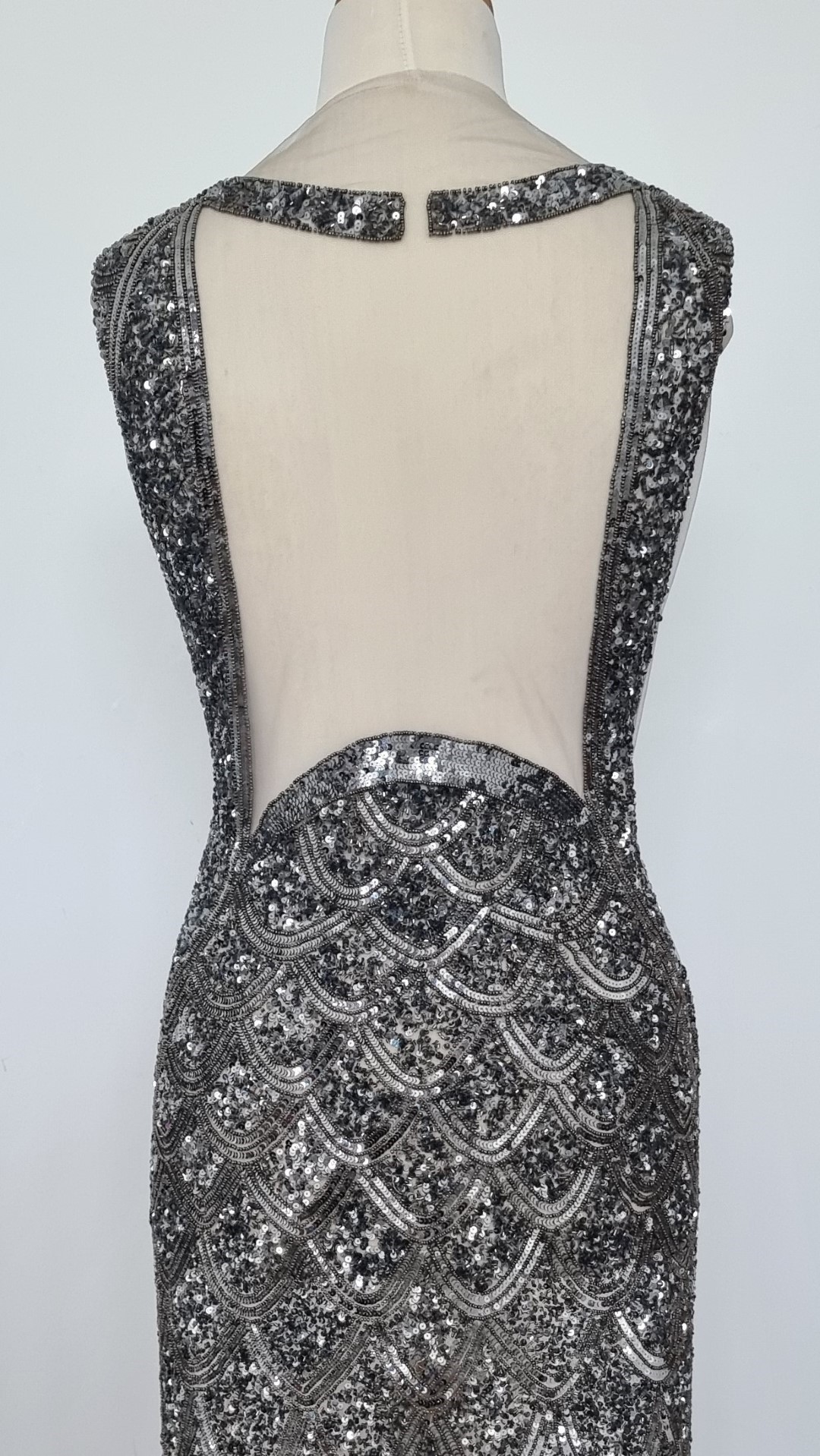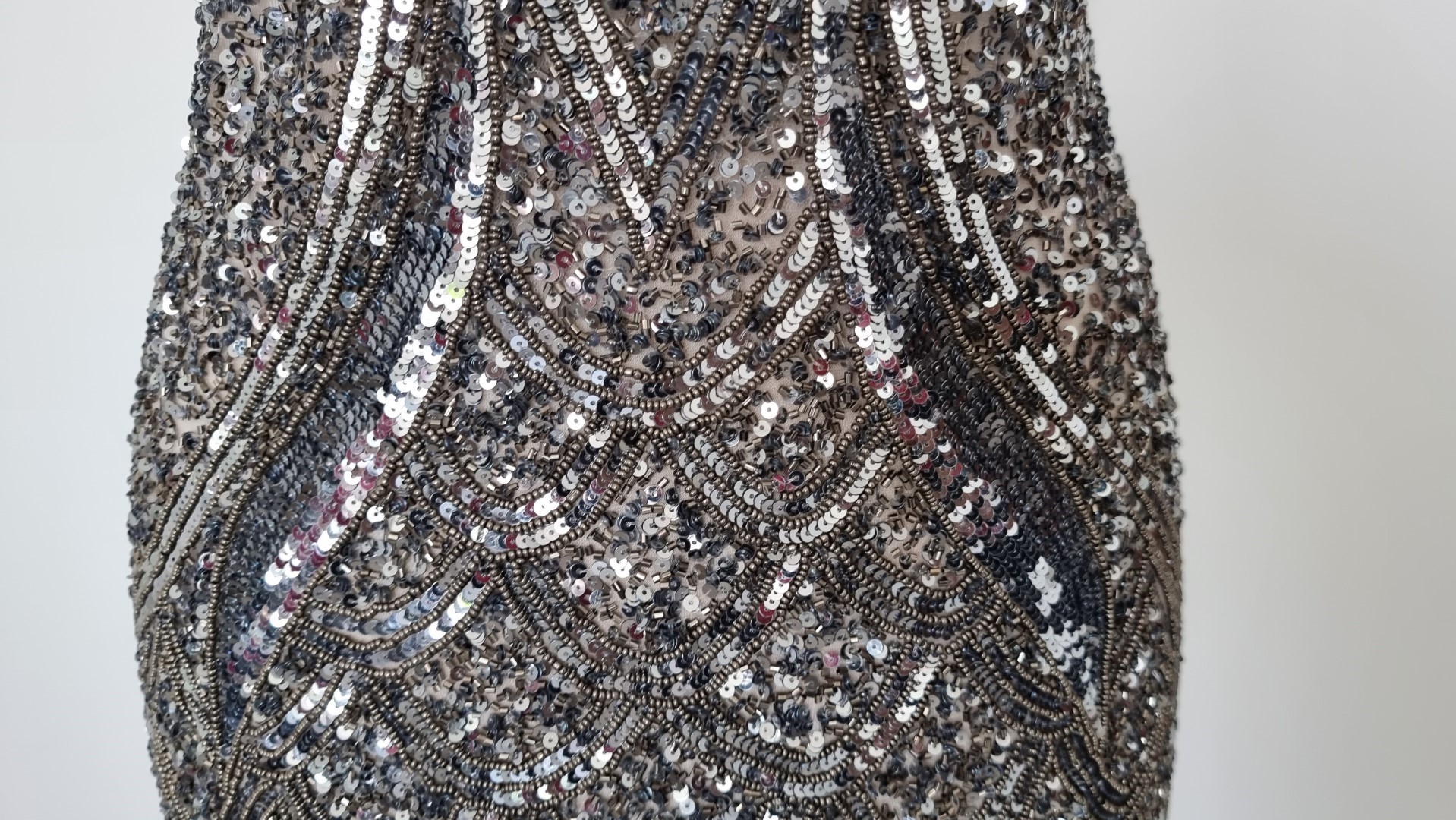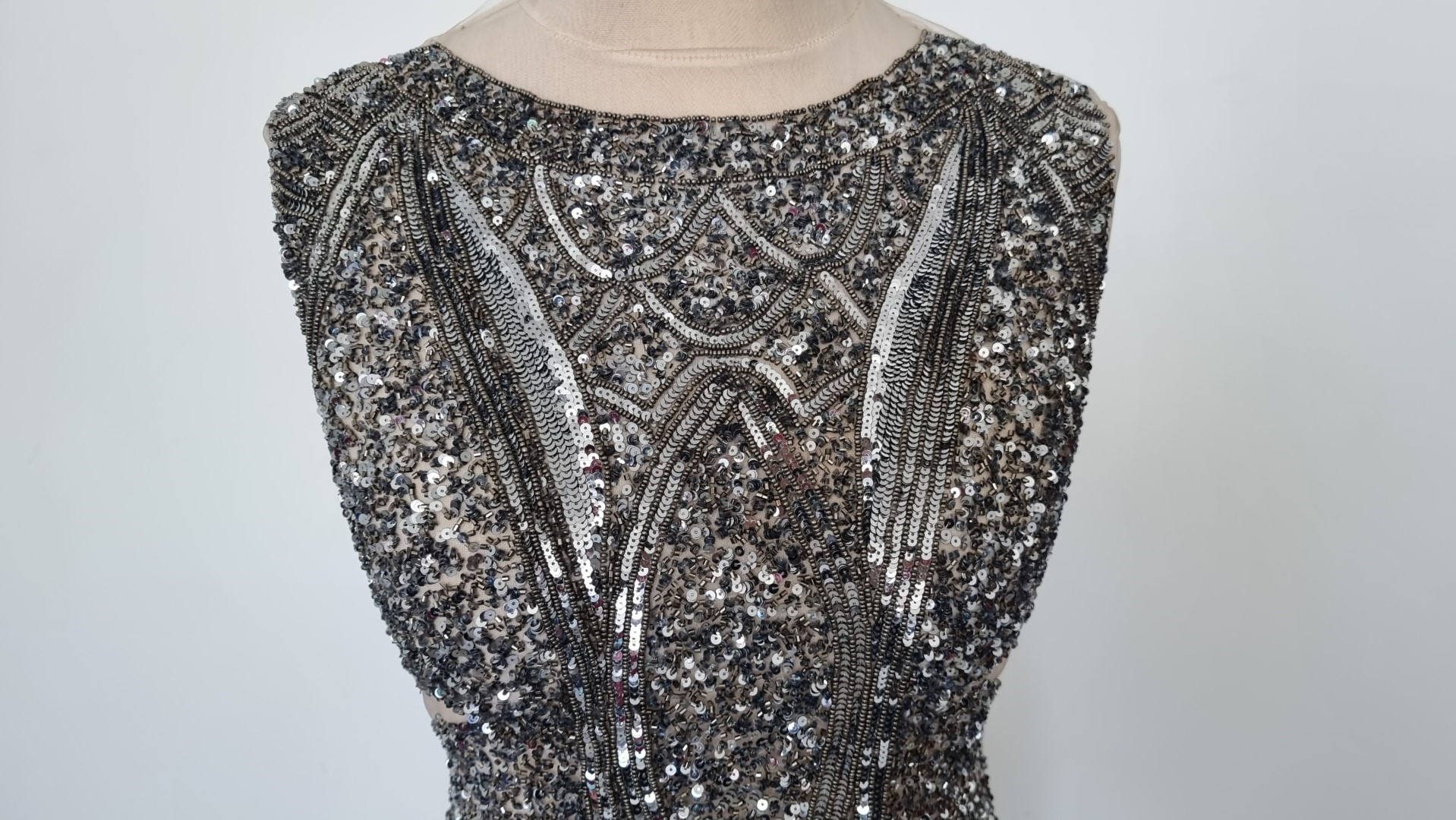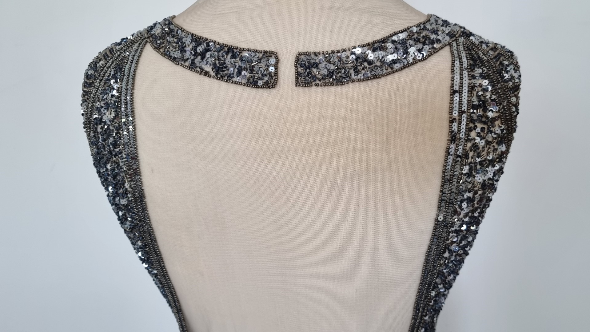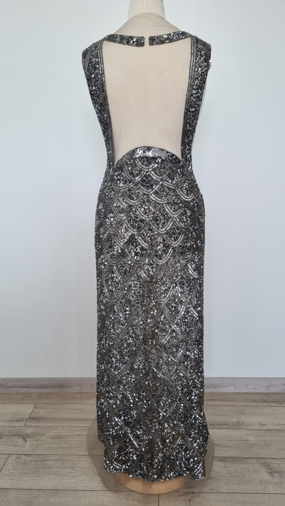 Caracteristici Rochie lunga argintie realizata din panouri accesorizate: