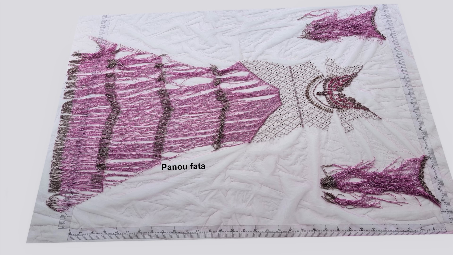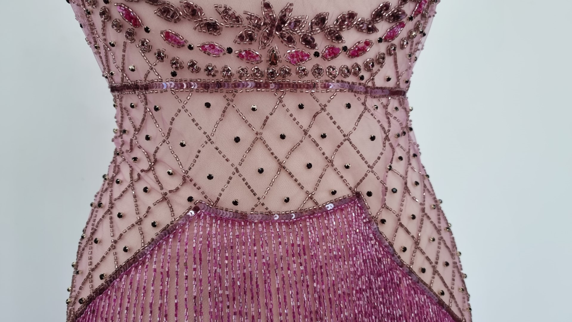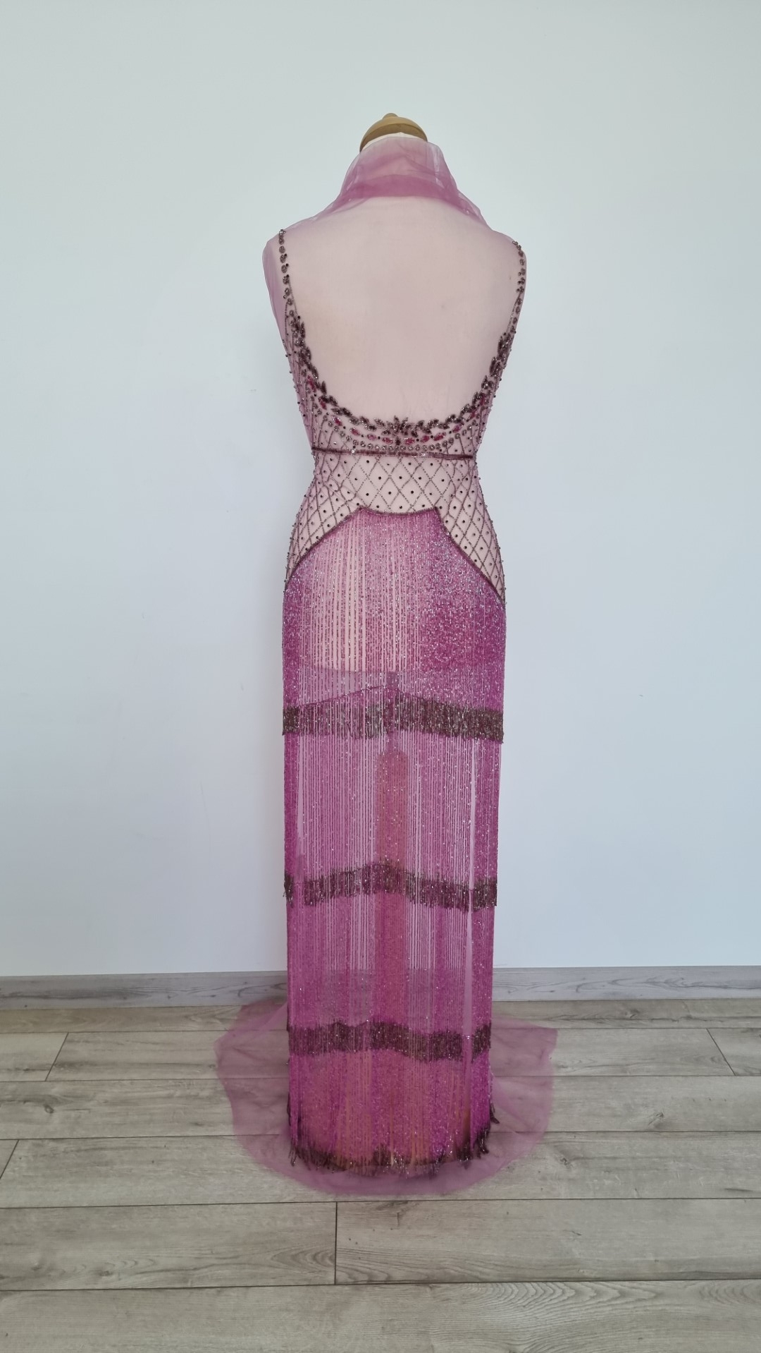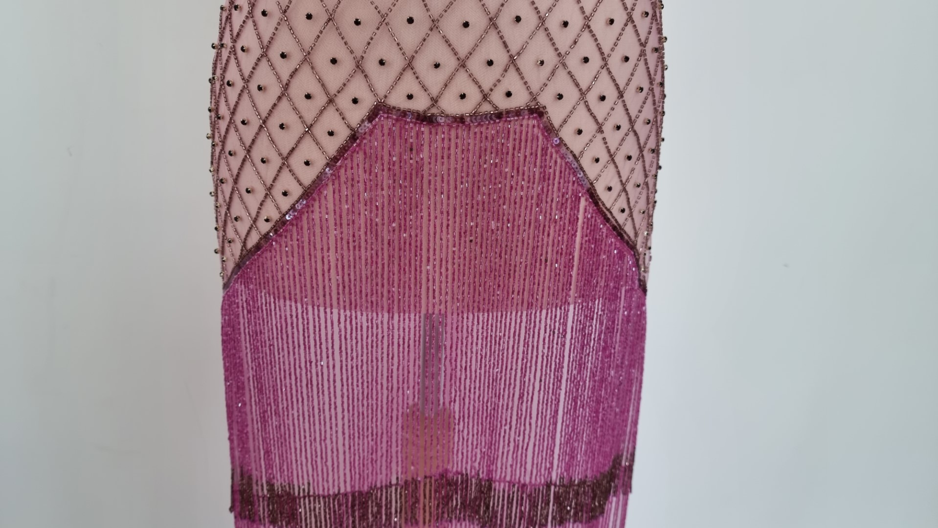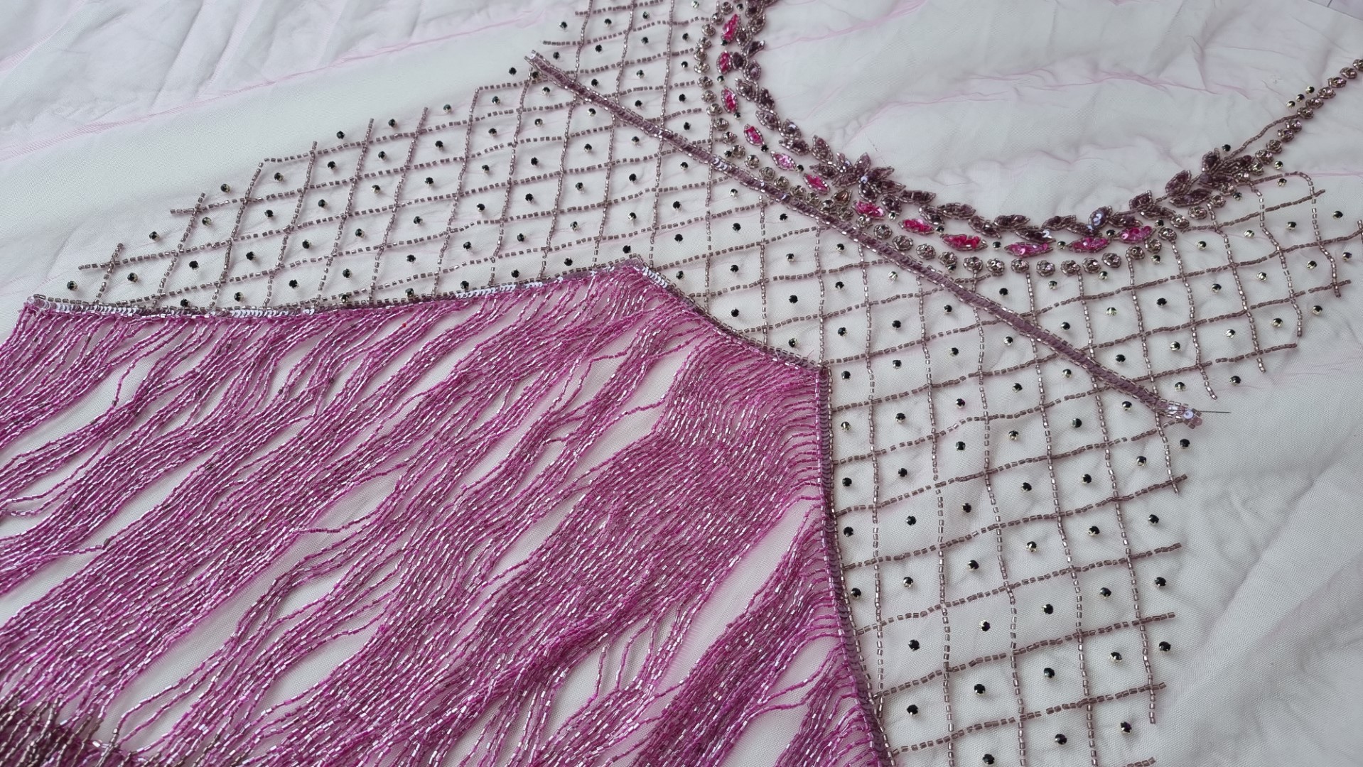 Rochie lunga cu franjuri realizata manual – panouri , set din 4 panouri (fata, spate, 2 maneci ) realizate 100% manual din micropaiete, margele, pietre, ideal pentru a concepe cu usurinta o rochie eleganta.