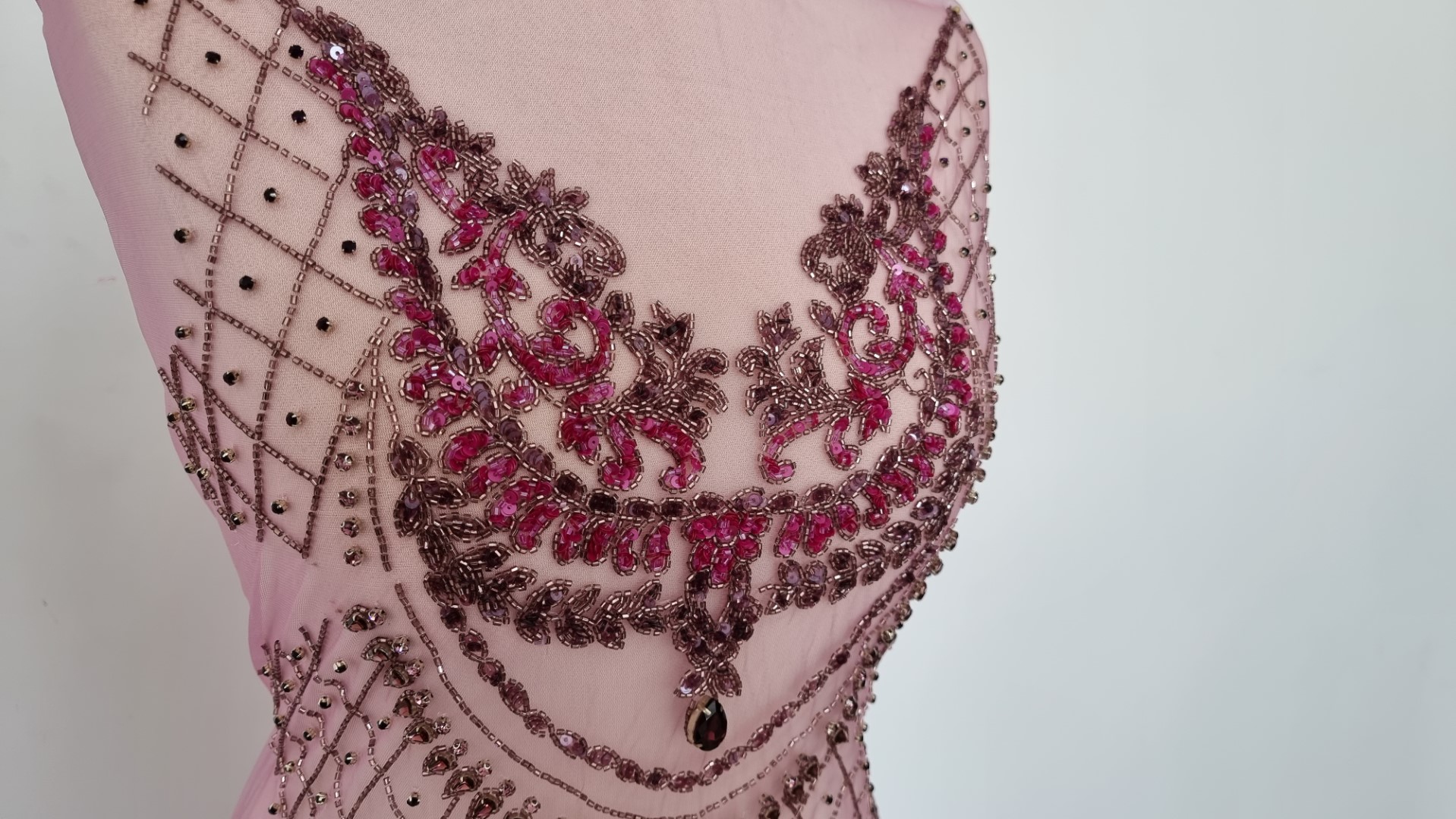 Realizata pe baza din tulle rose, rochia este potrivita pentru marime aproximativa 42, dar poate fi ajustata cu usurinta in momentul asamblarii de catre croitoreasa.