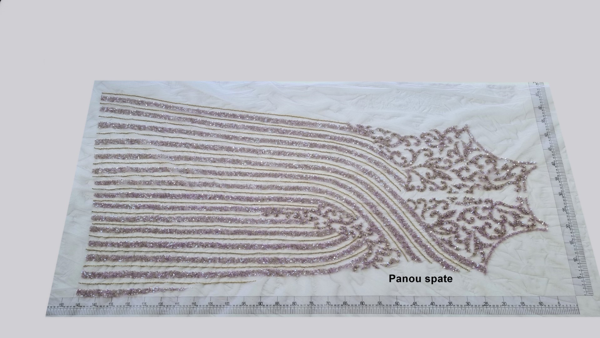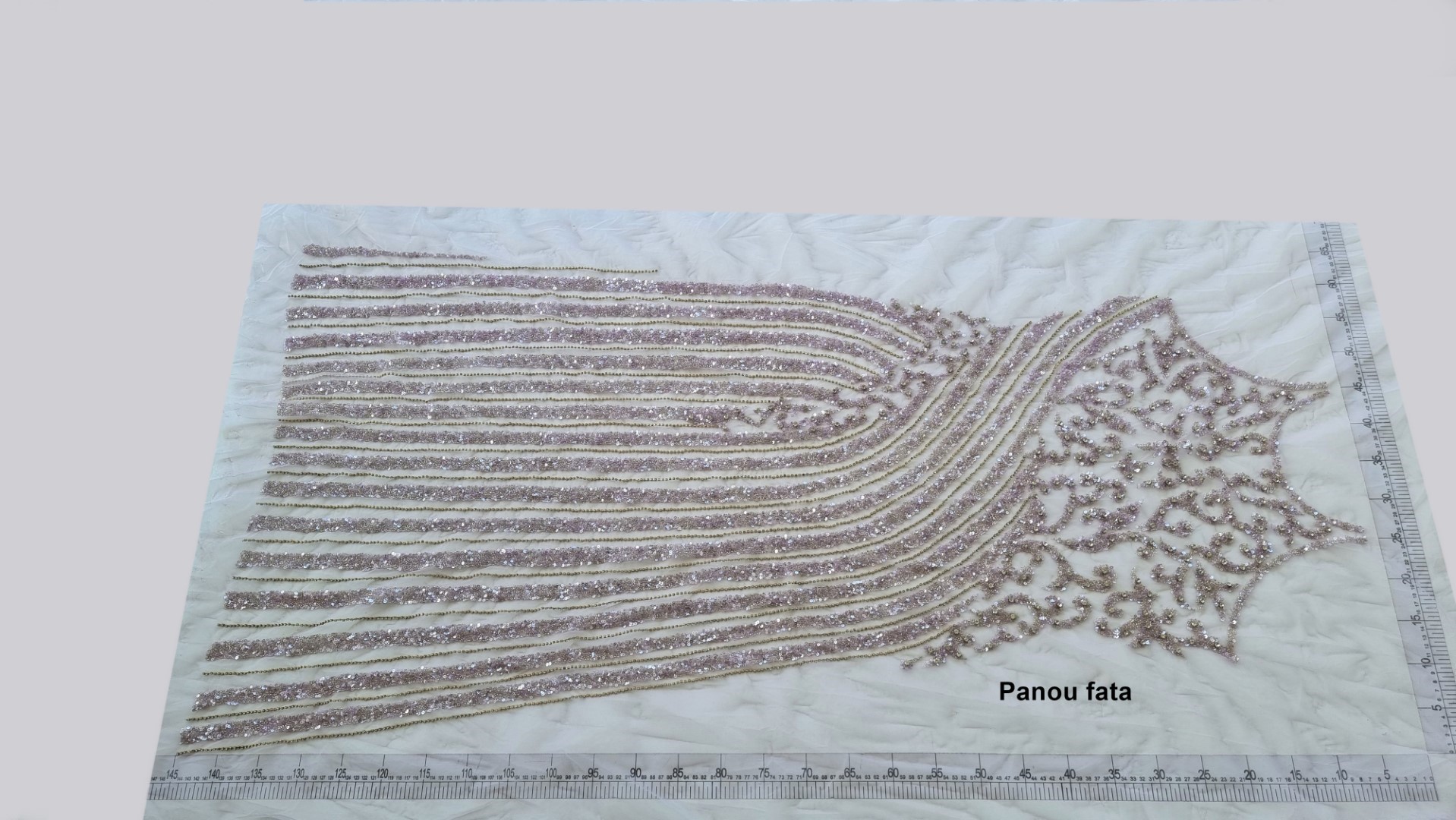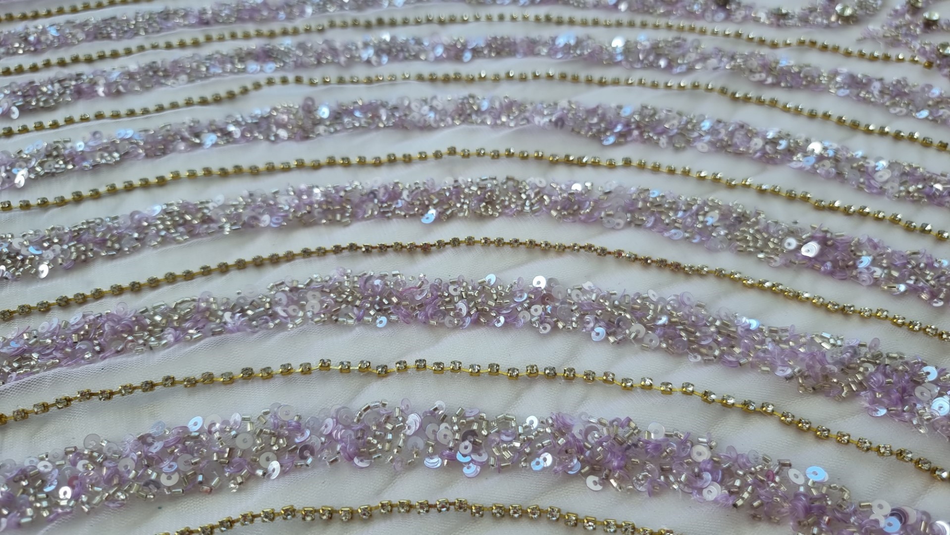 Set din doua panouri (fata, spate) realizate 100% manual din micropaiete mov deschis, margele si pietre argintii si aurii.