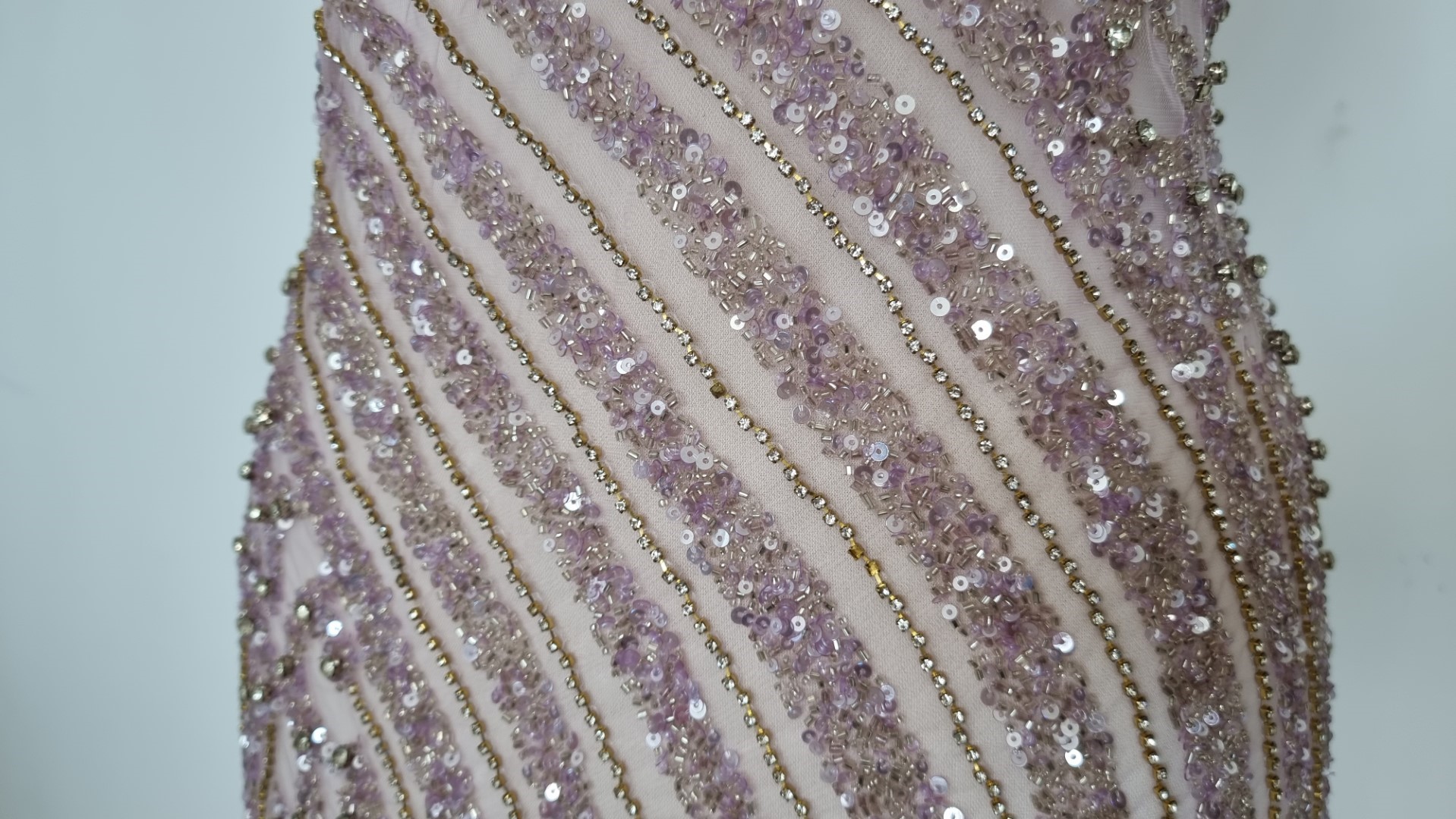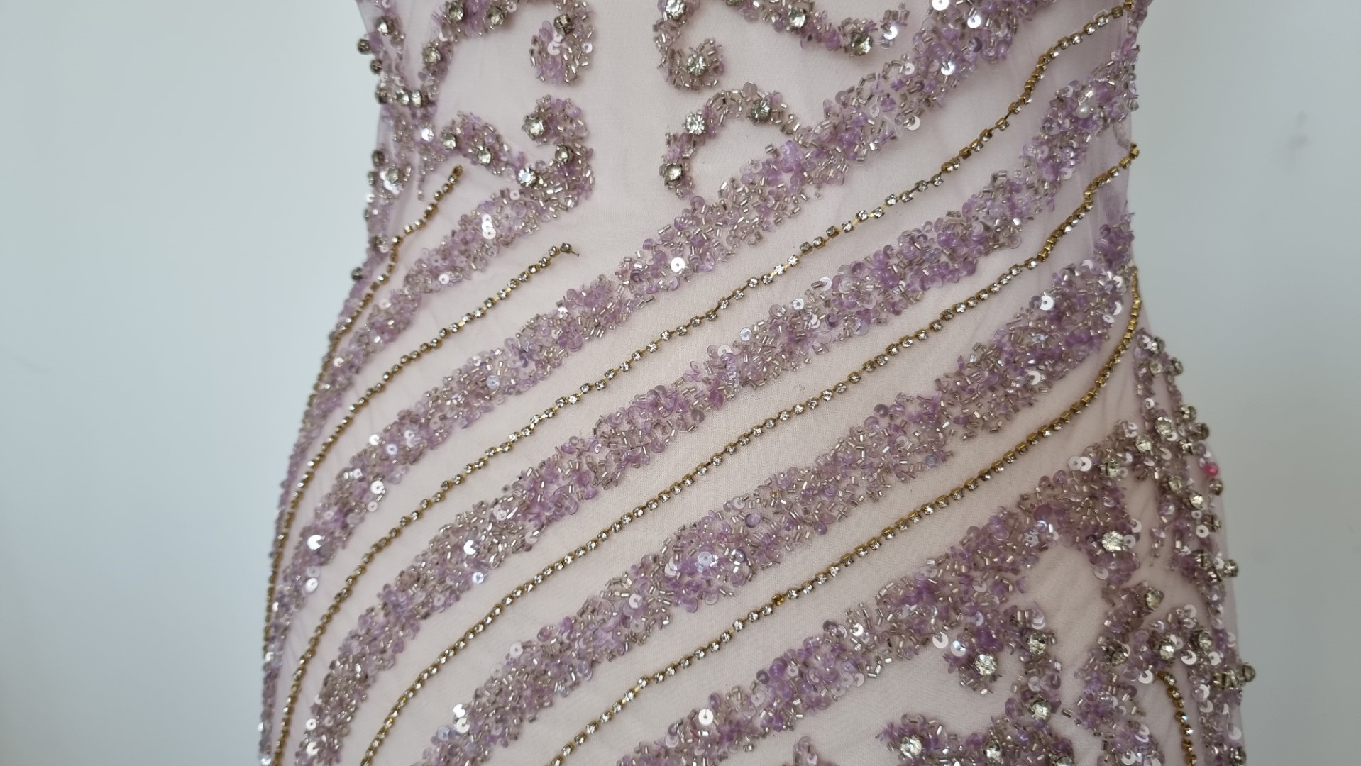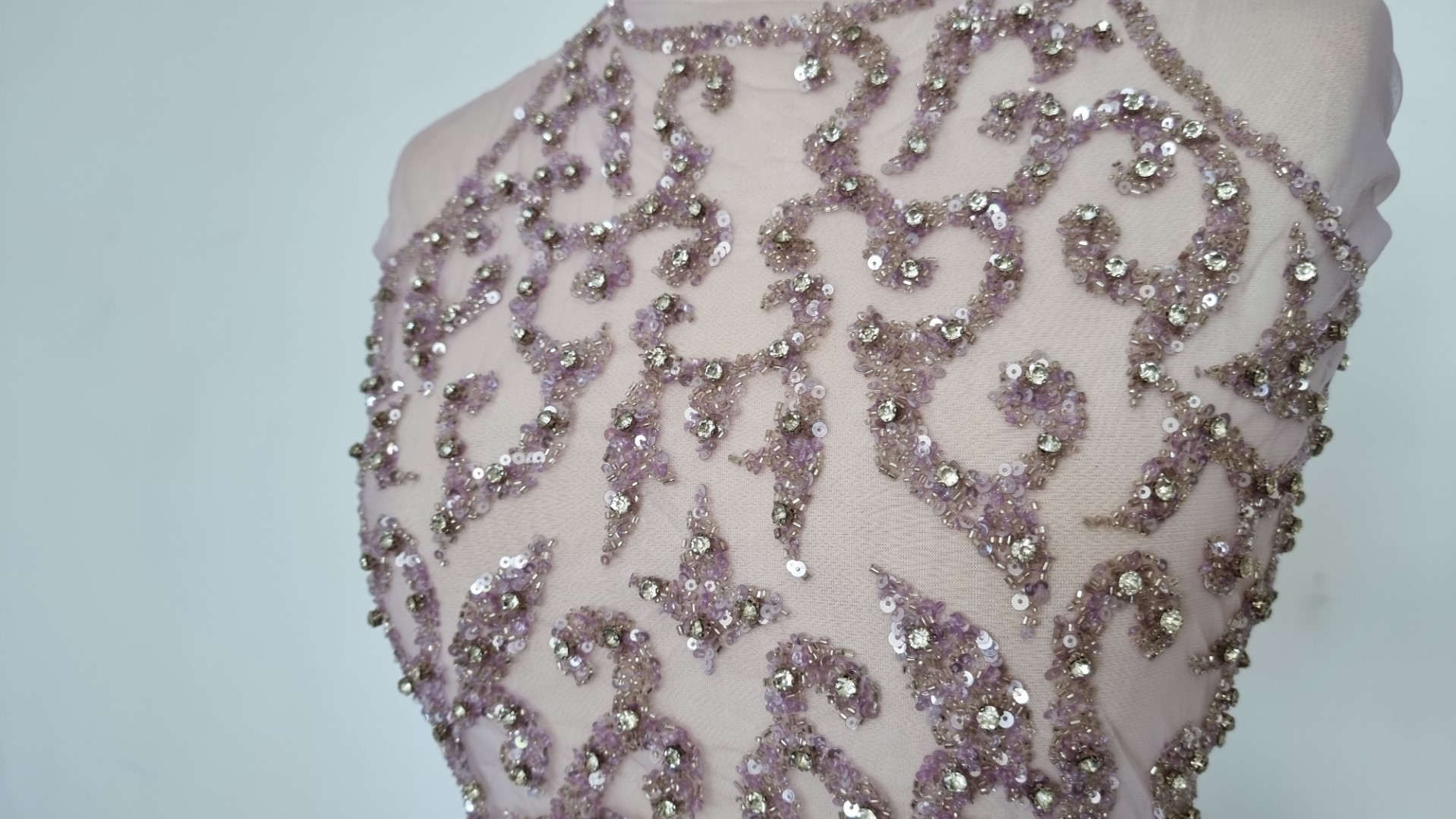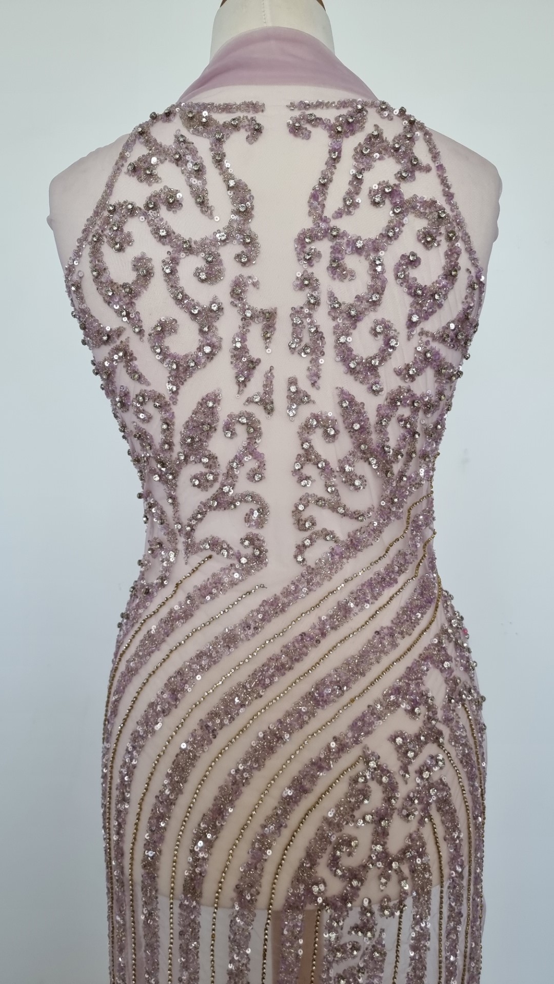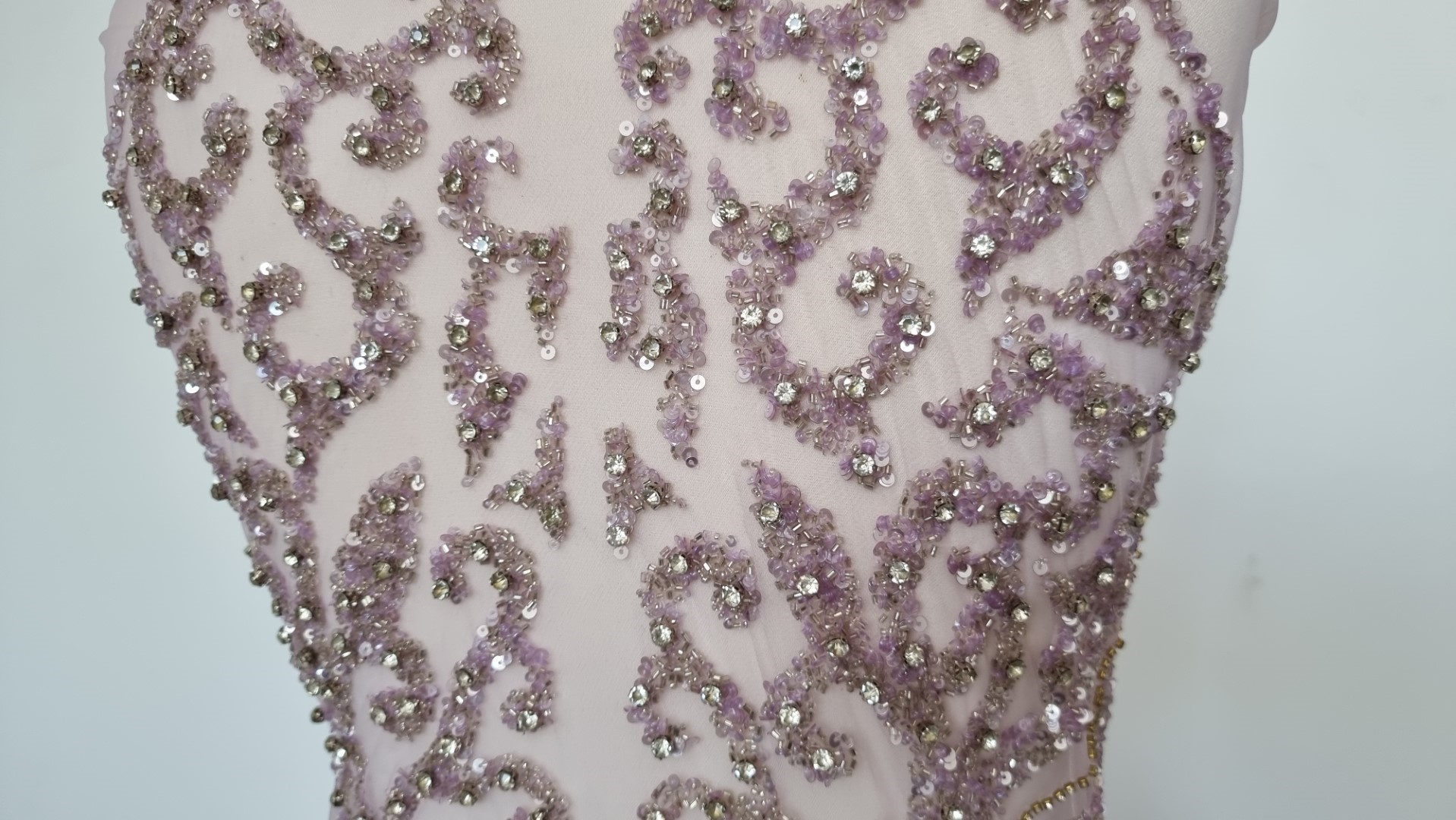 Caracteristici Rochie lunga mov pal realizata din panouri accesorizate manual: