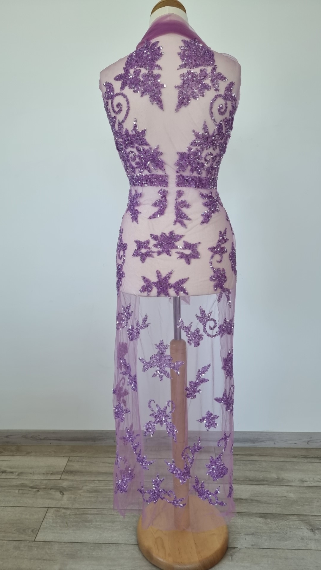 Rochie lunga mov realizata manual din panouri accesorizate.
