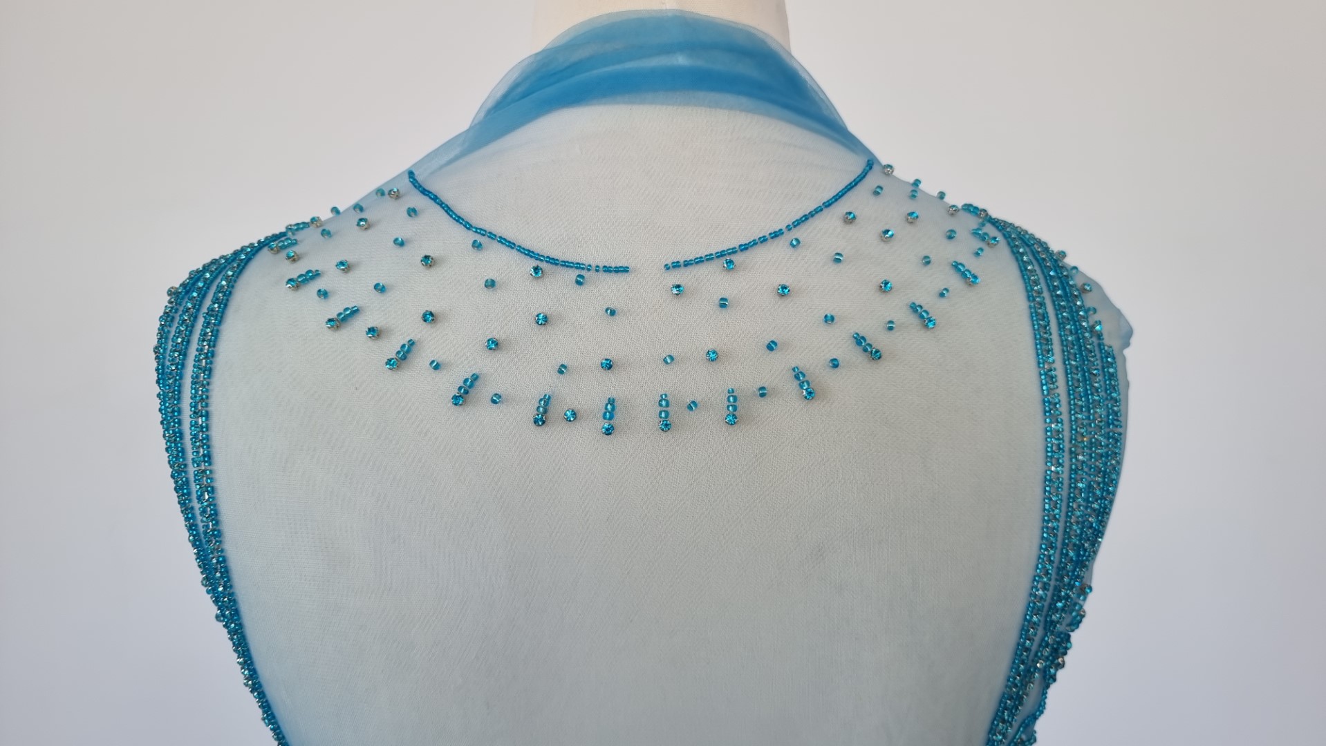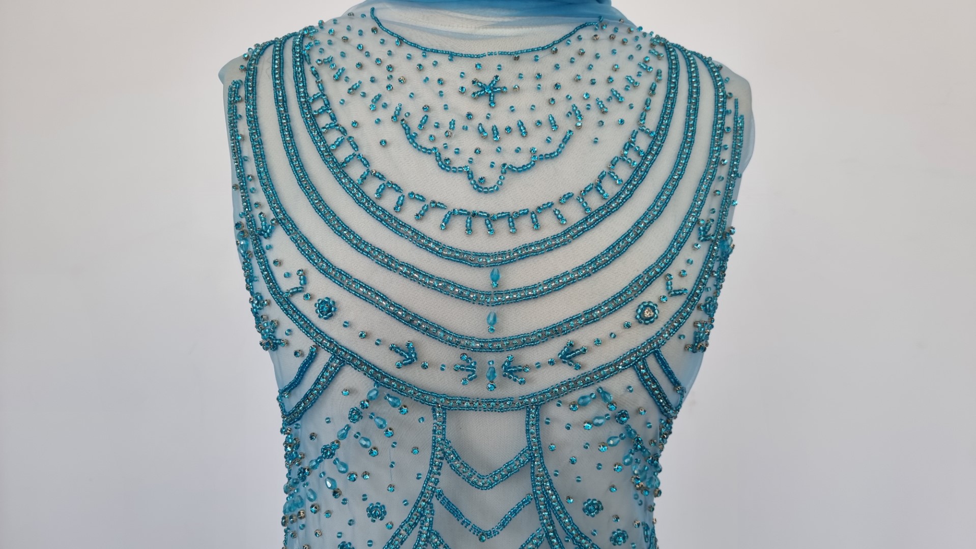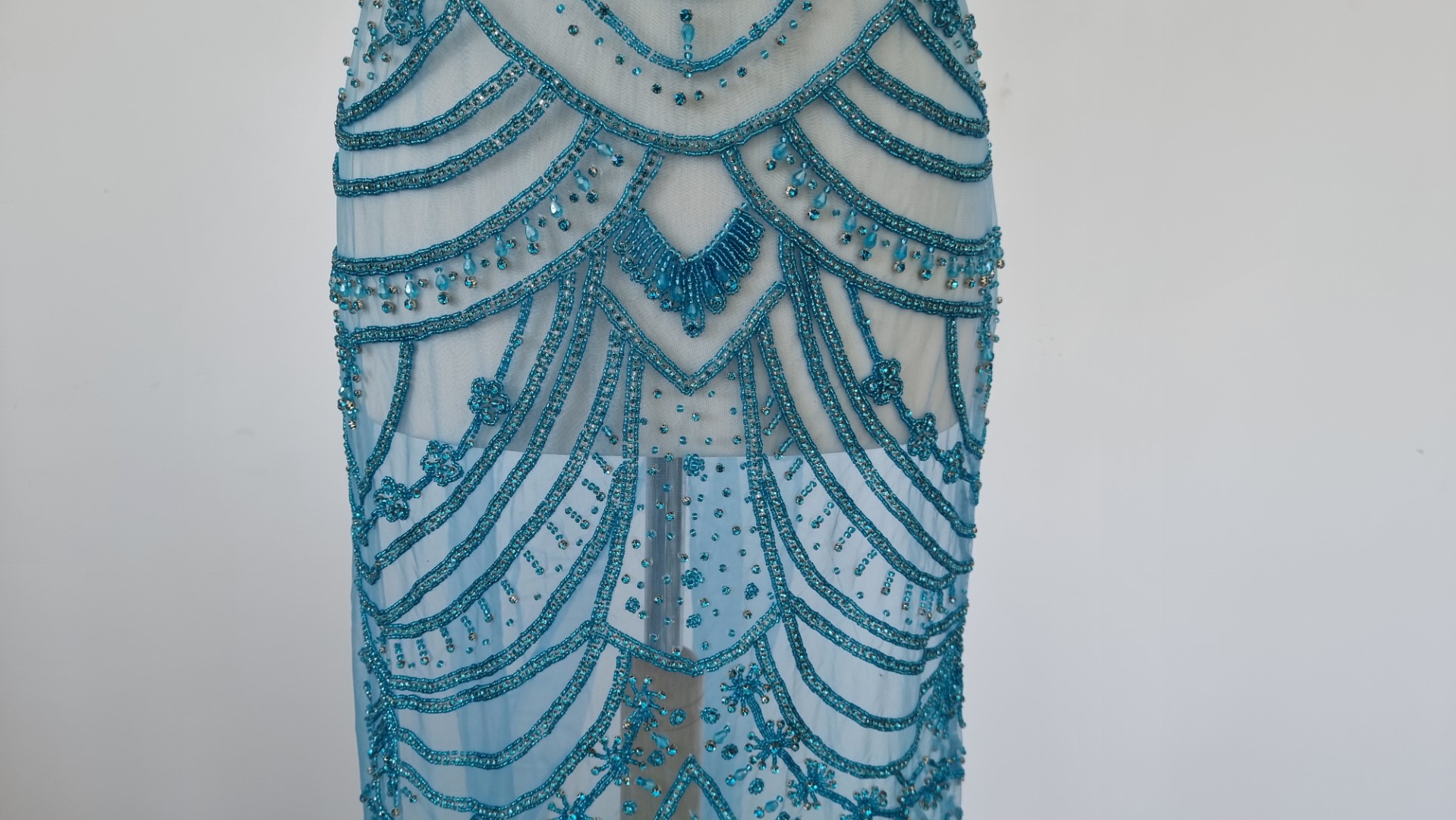 Rochie lunga turquoise lucrata manual – panouri, set din 4 panouri (fata, spate, 2 maneci ) realizate 100% manual din margele si pietre, de diferite dimensiuni, ideal pentru a concepe cu usurinta o rochie eleganta.