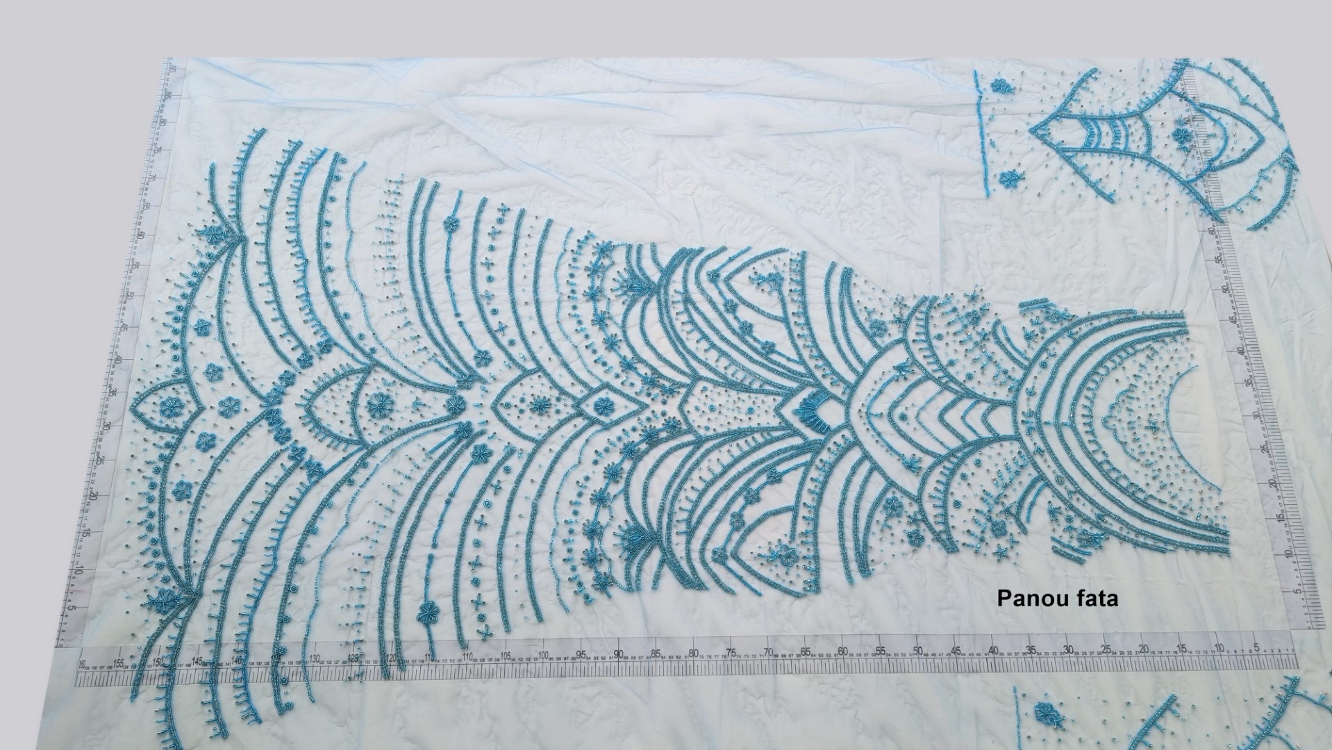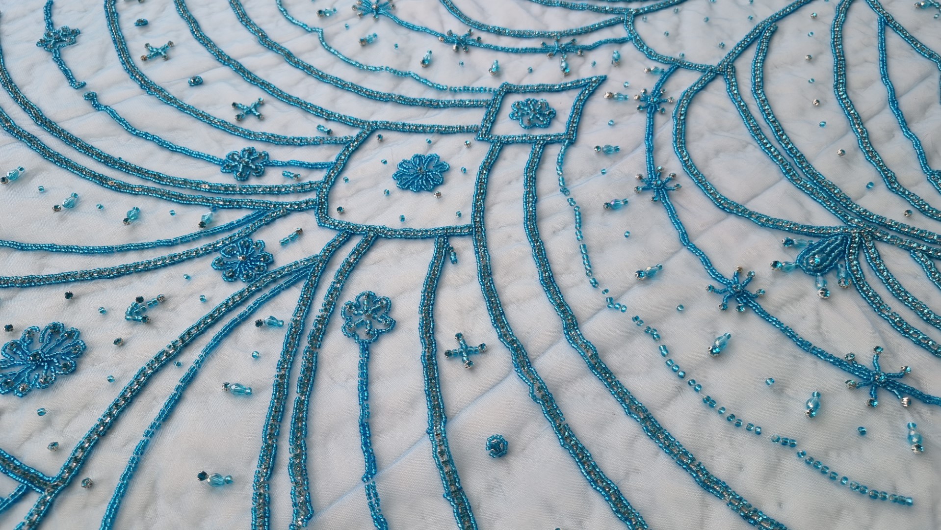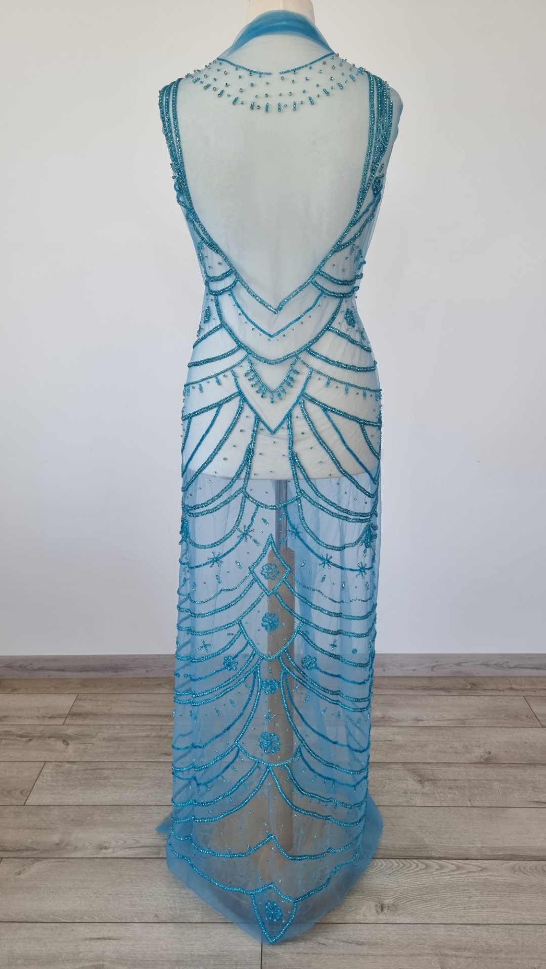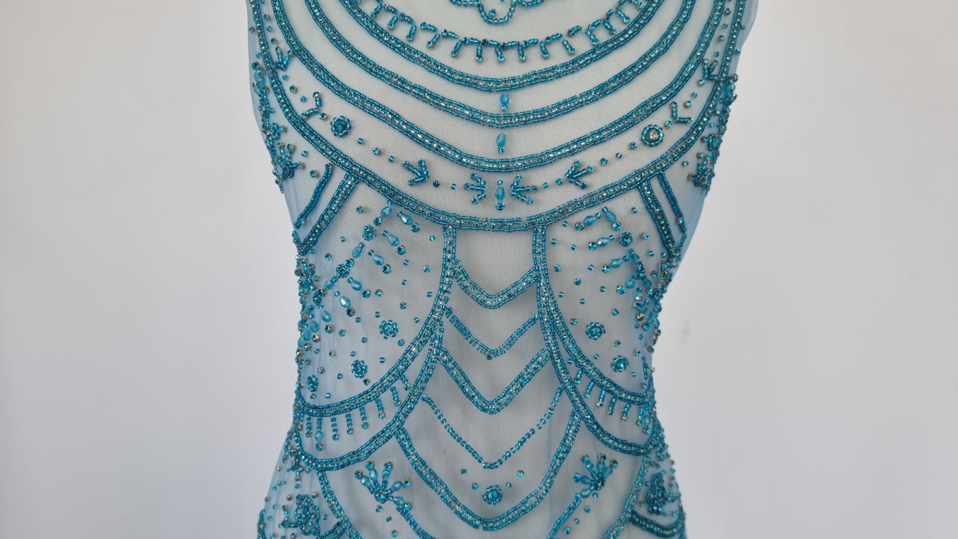 Rochie lunga turquoise lucrata manual – panouri, set din 4 panouri (fata, spate, 2 maneci ) realizate 100% manual din margele si pietre, de diferite dimensiuni, ideal pentru a concepe cu usurinta o rochie eleganta.