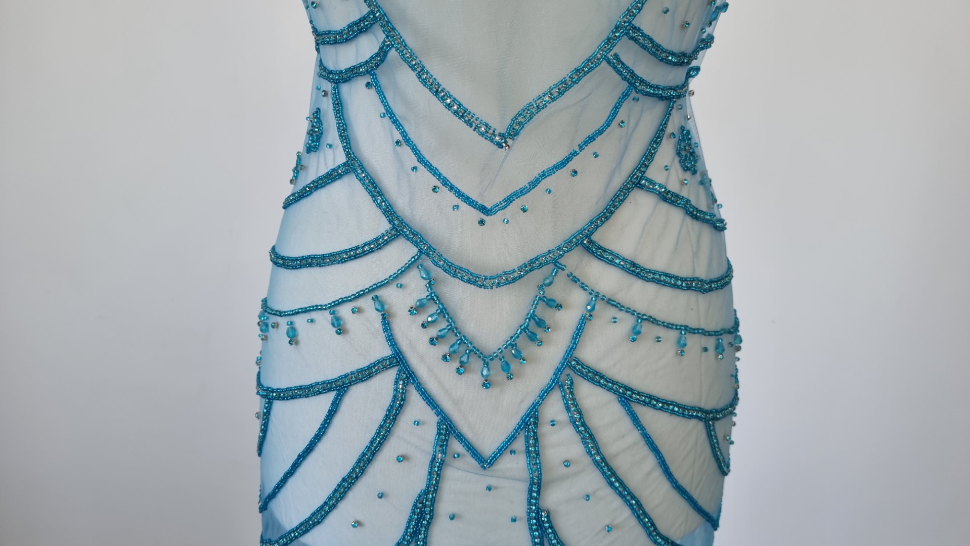Realizata pe baza din tulle bleu, rochia este potrivita pentru marime aproximativa 42, dar poate fi ajustata cu usurinta in momentul asamblarii de catre croitoreasa.
