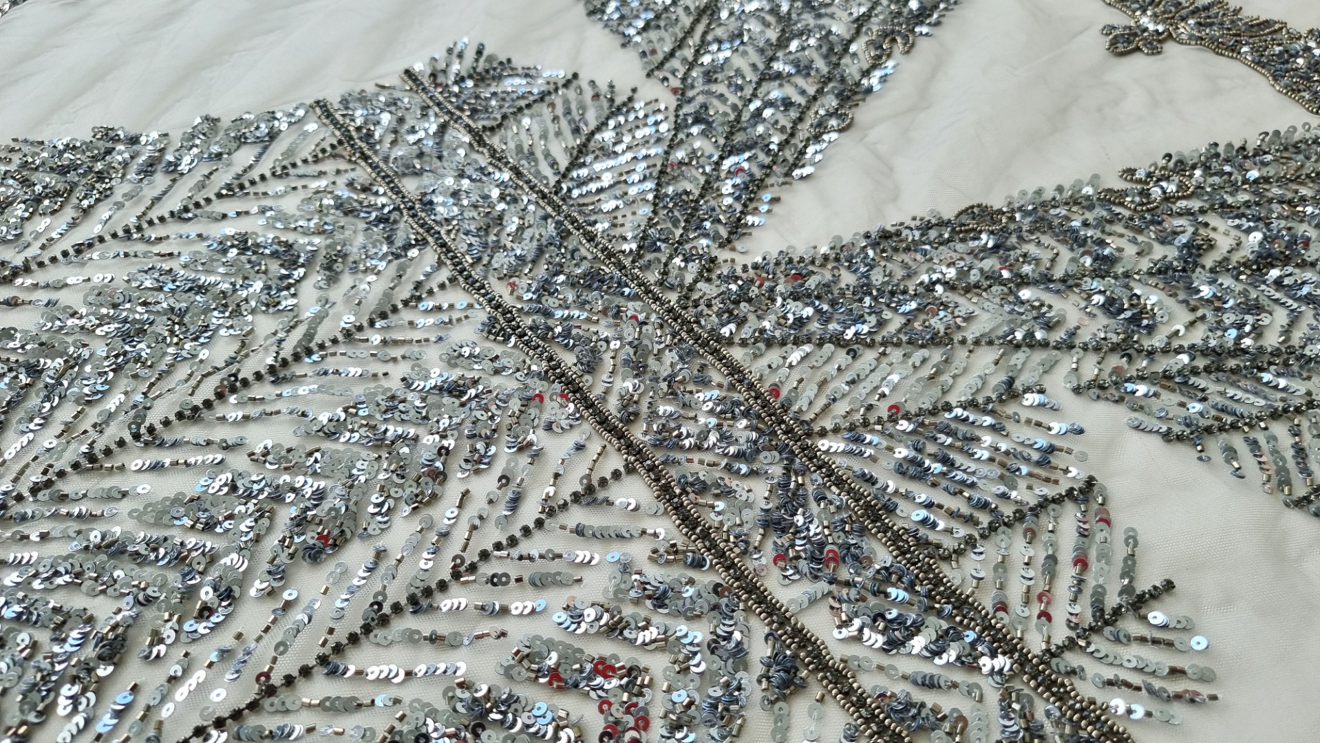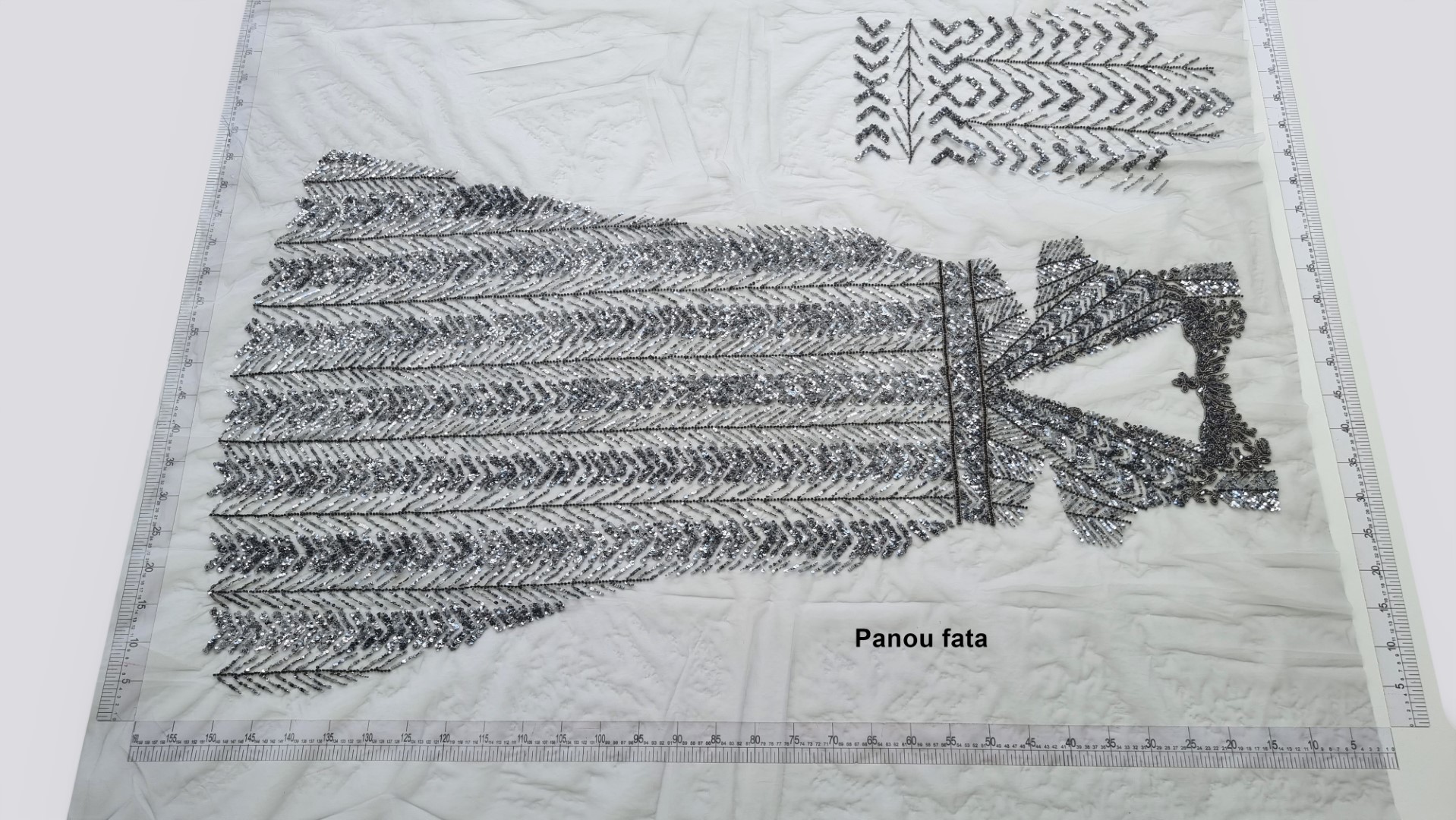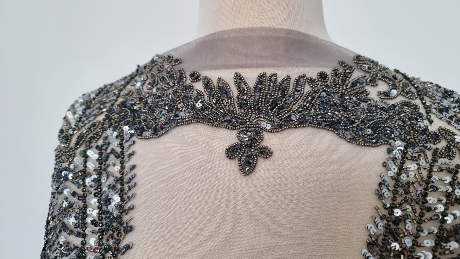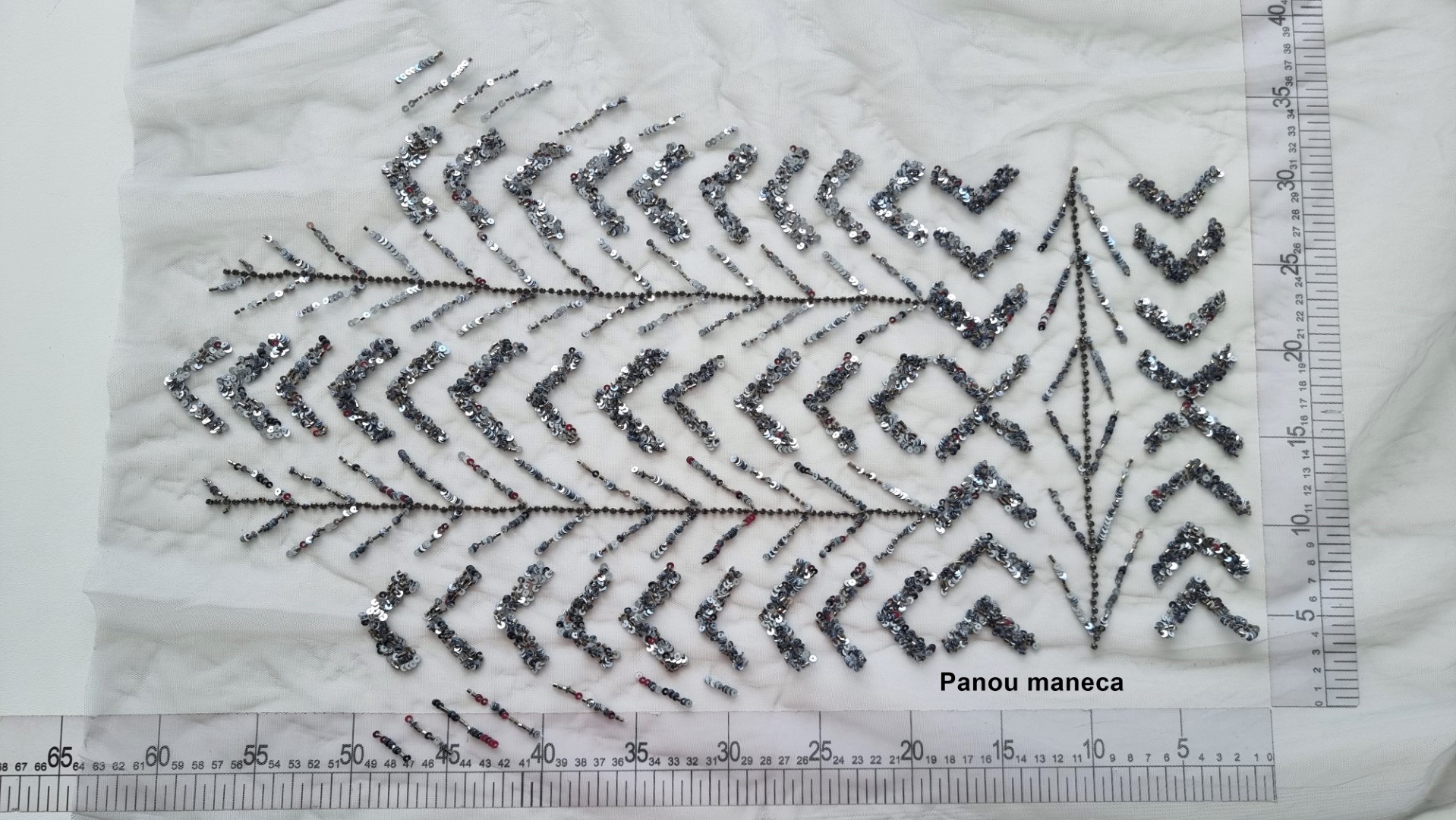 Set din patru panouri (fata, spate, maneci) realizate 100% manual din micropaiete si margele rotunde si tubulare argintii si gri metalic.