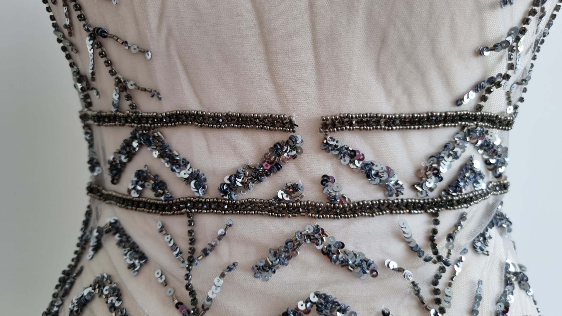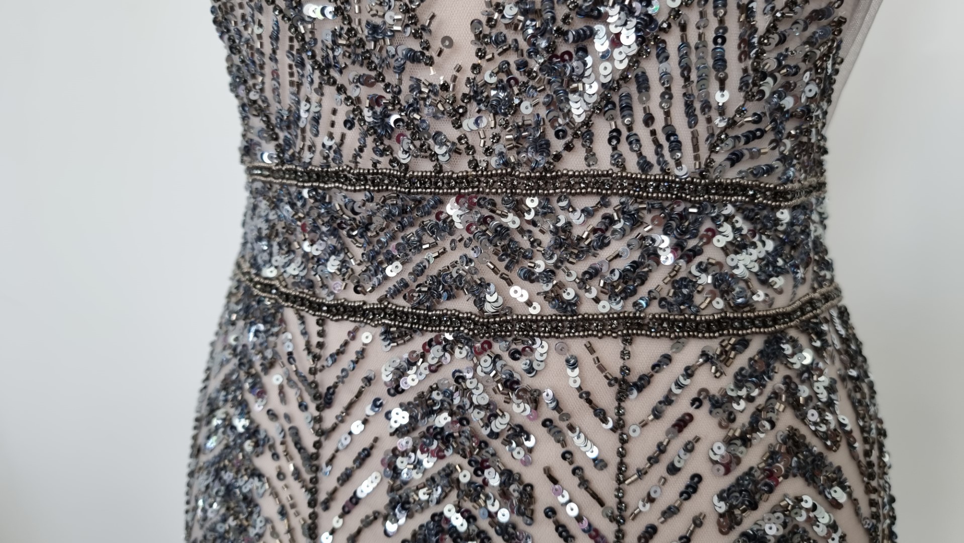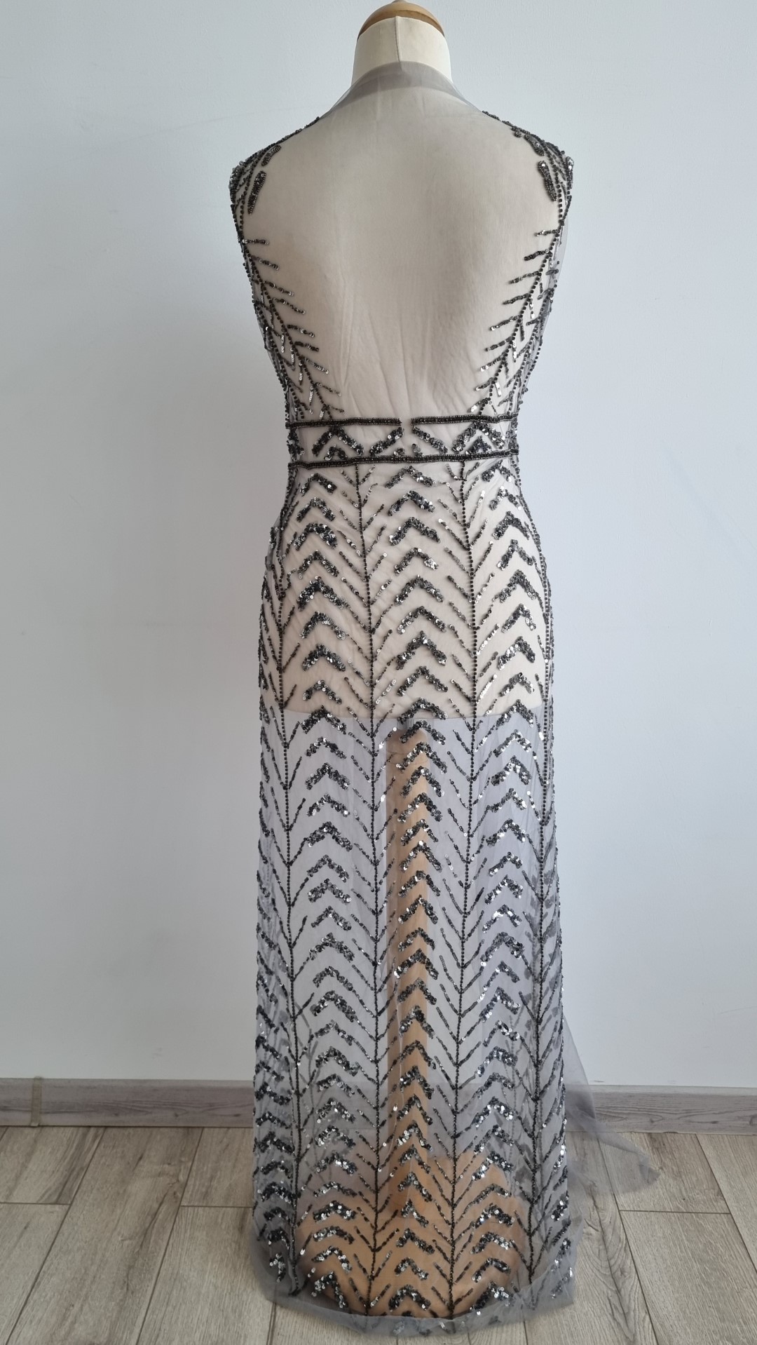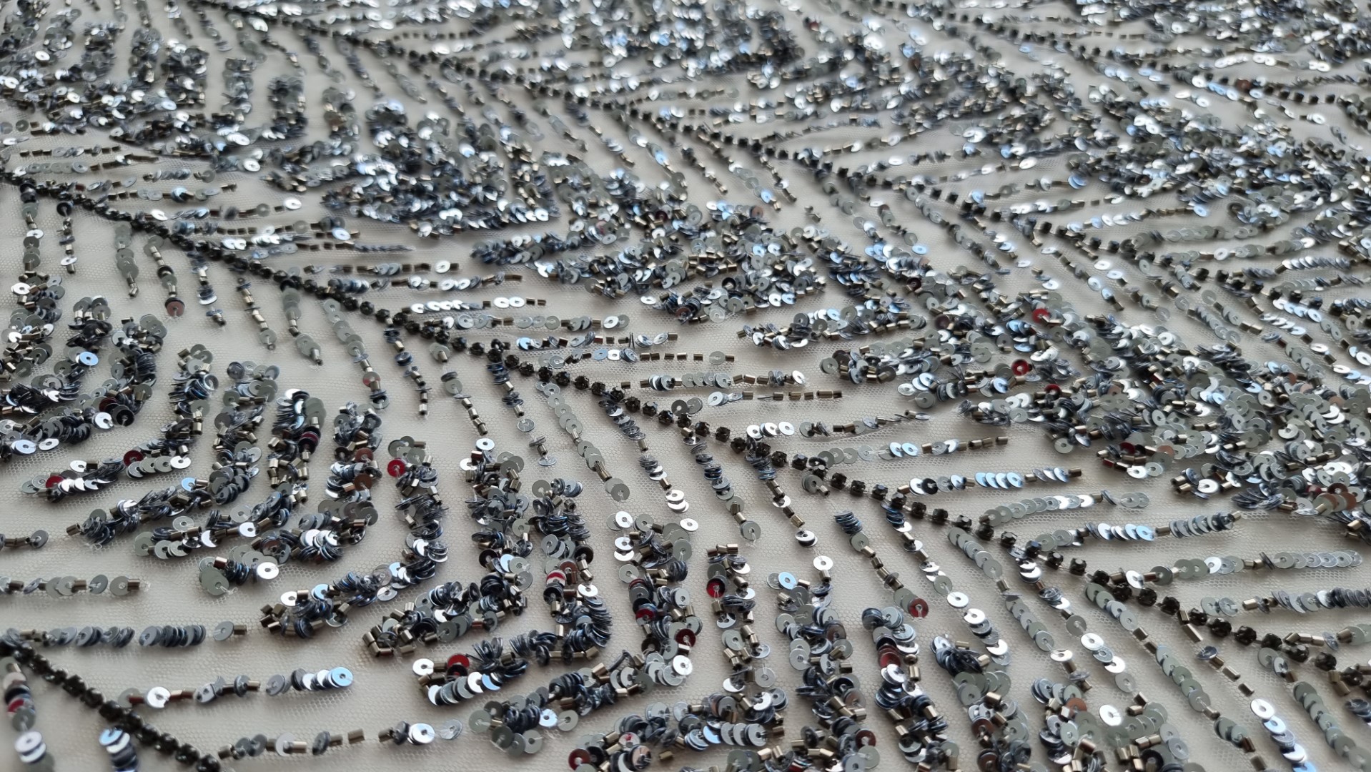 Set din patru panouri (fata, spate, maneci) realizate 100% manual din micropaiete si margele rotunde si tubulare argintii si gri metalic.