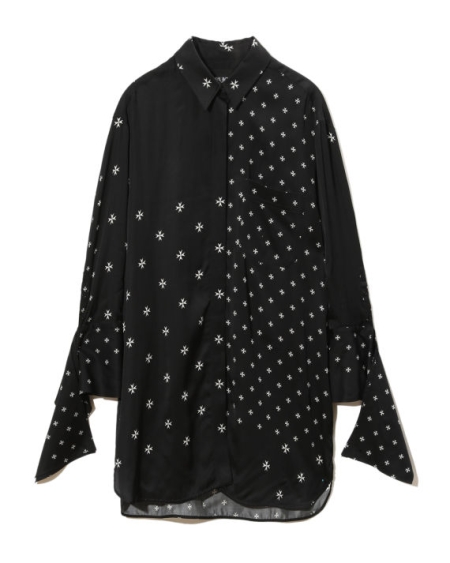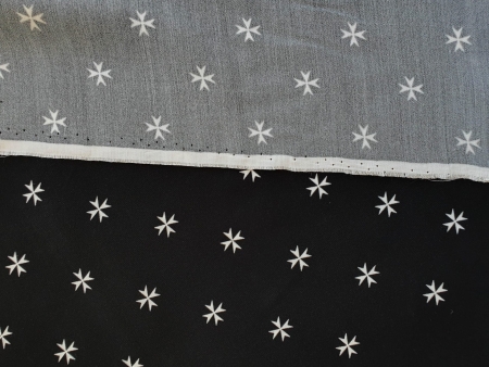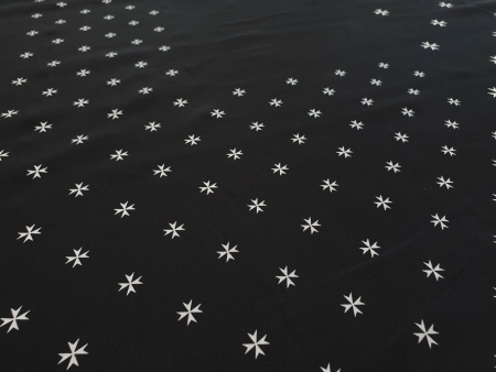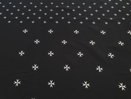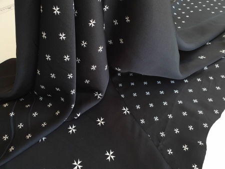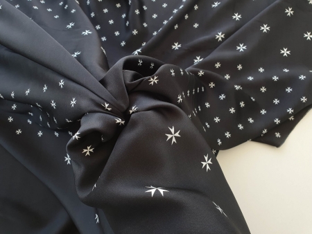Satin din vascoza si matase naturala imprimata Stars NBL577, subtire, cu imprimeu ivory pe fond negru.