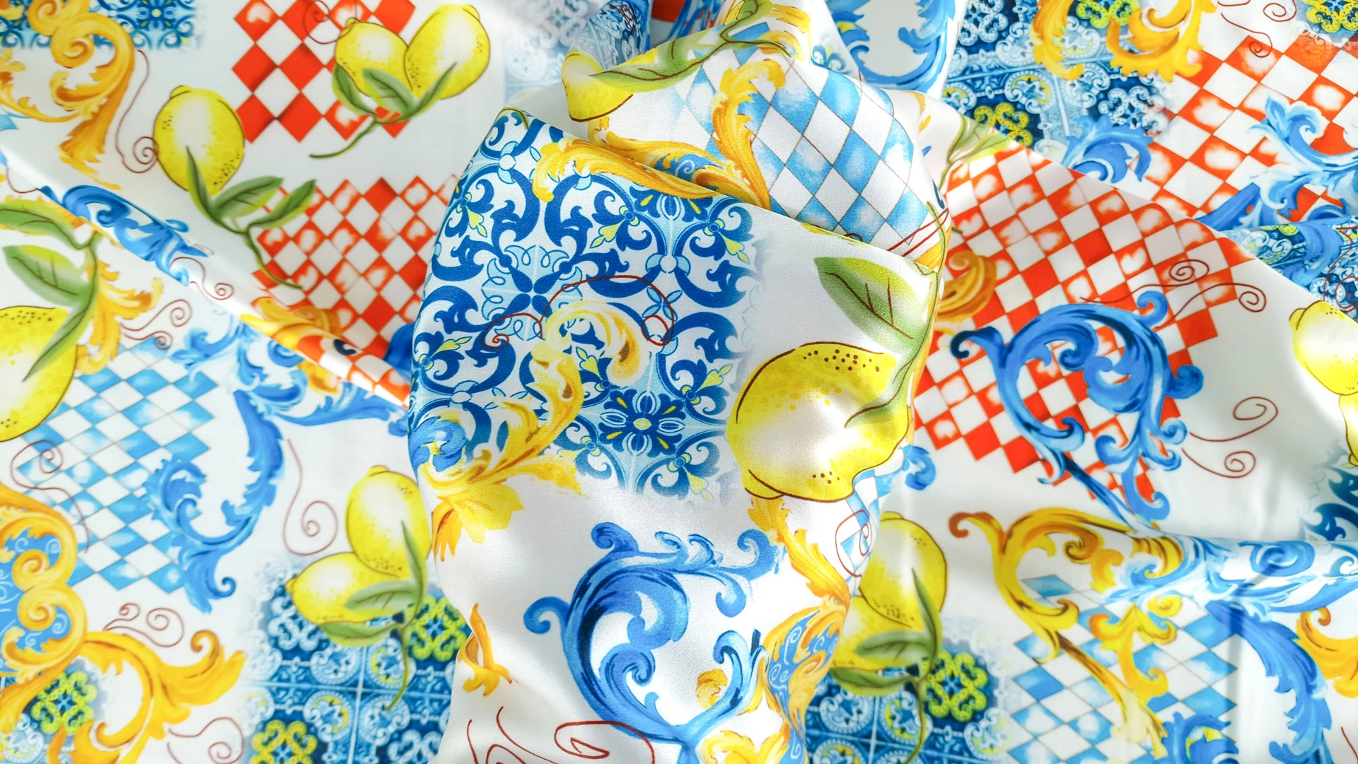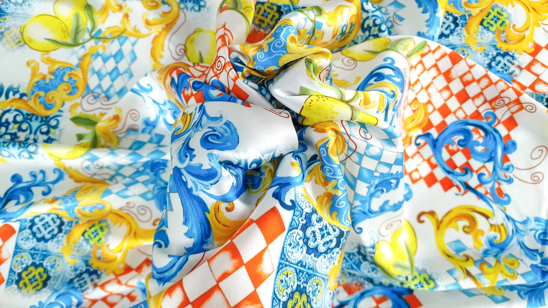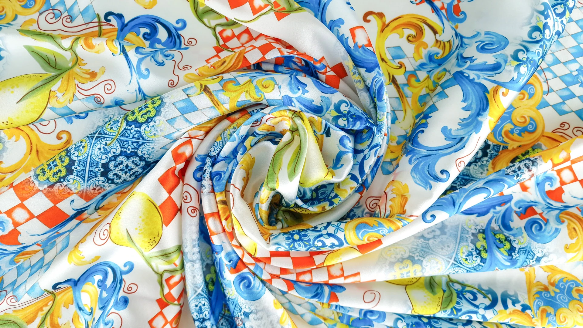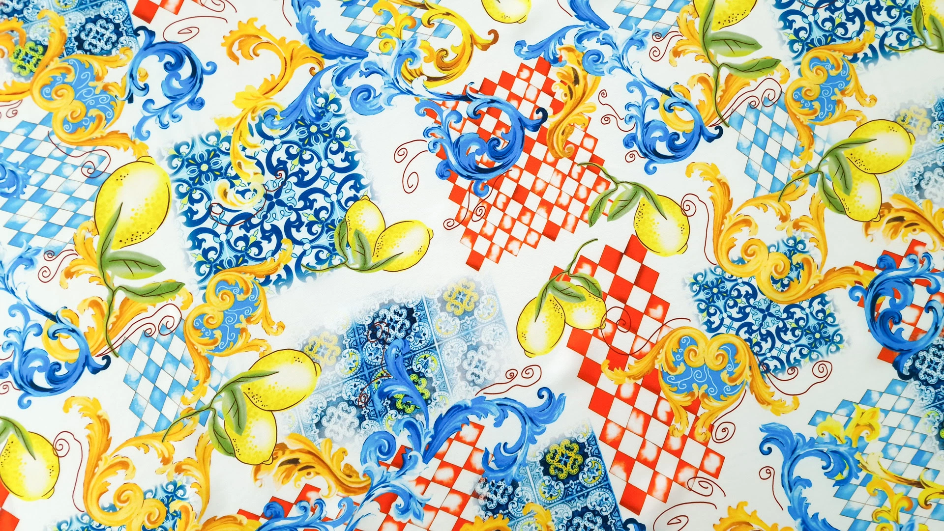 Satin din matase naturala Mediterranean Mosaic DG1709 cu elastan in compozitie, este o țesătură ce combină tradiția cu modernitatea într-un mod original cu un design distribuit pe întreaga sa suprafață. Fabricată din mătase naturală de cea mai bună calitate, aceast satin se remarcă prin delicatețea și strălucirea sa deosebită, oferind o senzație de rafinament și confort incomparabil. Imprimeul inspirat de Dolce&Gabbana cu detalii florale și geometrice într-o paletă de culori strălucitoare, inspirat de tradițiile artistice siciliene și atmosfera vibrantă a coastei mediteraneene. Datorită tehnologiei avansate de imprimare, culorile vii și detaliile fine sunt redate cu o claritate excepțională.