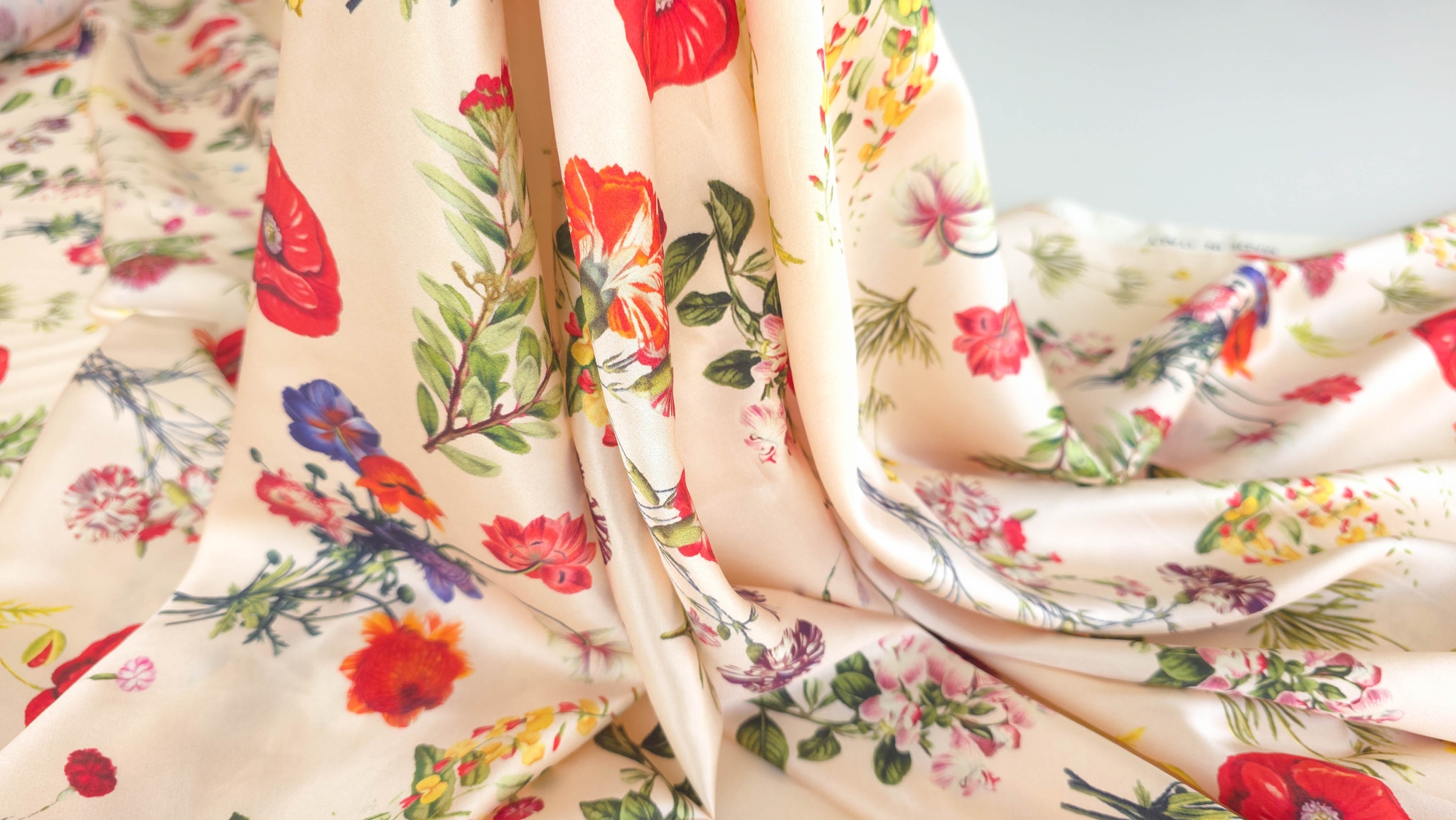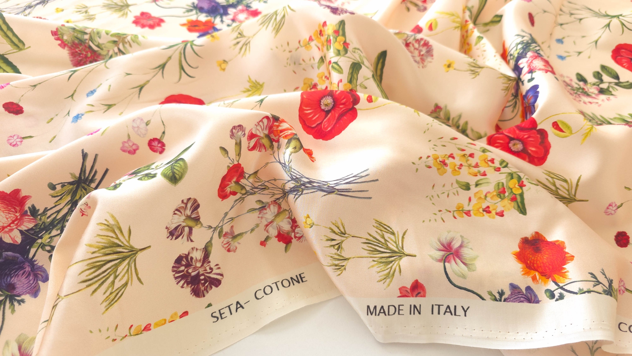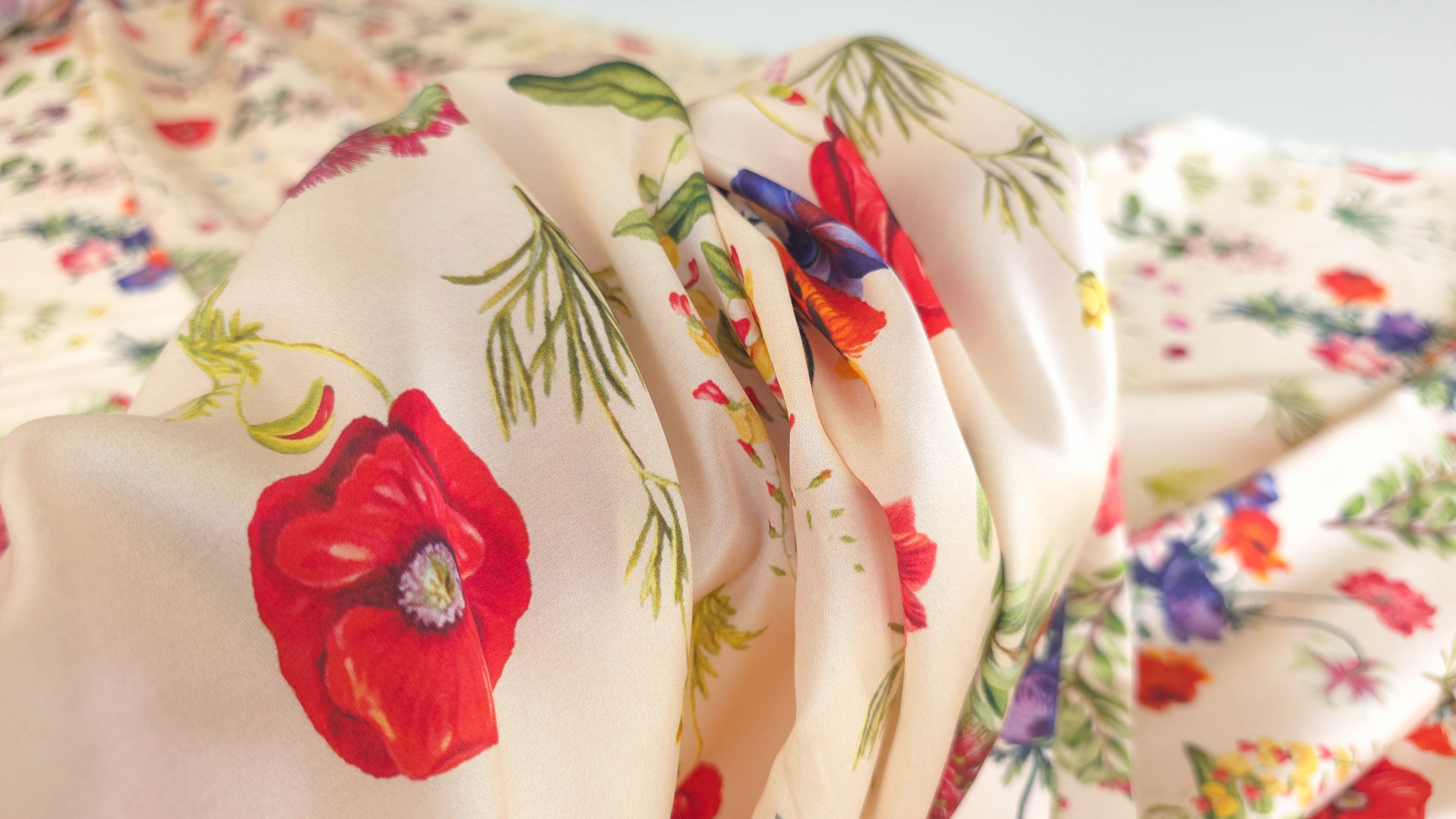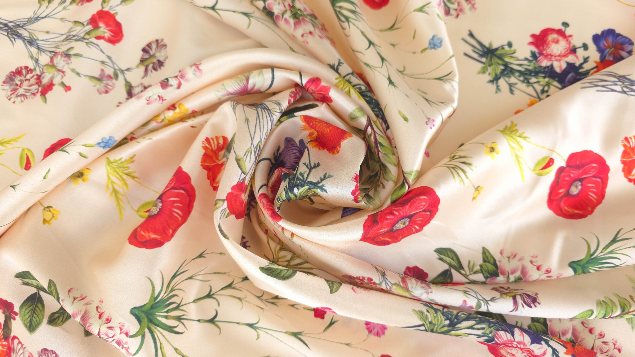 Satin imprimat cu matase naturala GBV1812 , model de inspiratie Giambattista Valli, cu imprimeu floral distribuit pe întreaga suprafață, ideal pentru confecționarea rochiilor sau a fustelor, a cămășilor vaporoase sau eșarfe. Satinul este cunoscut pentru textura sa fină, moale și lucioasă, fiind perfect pentru creații elegante.
