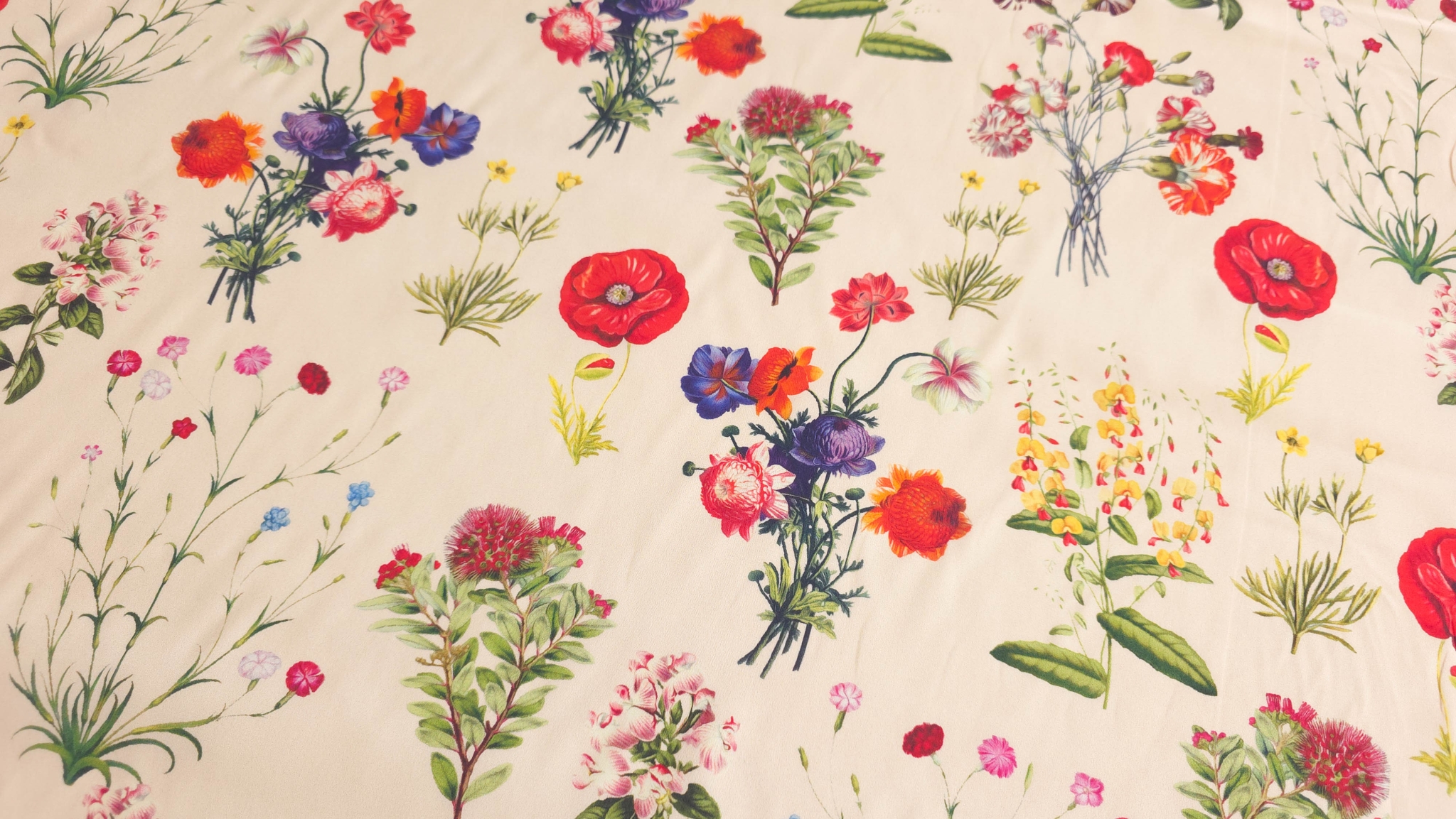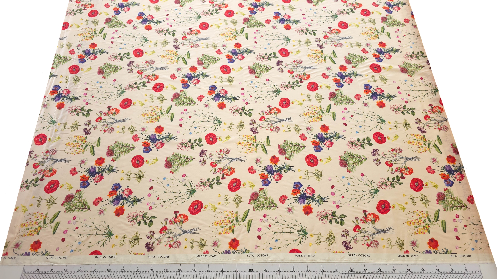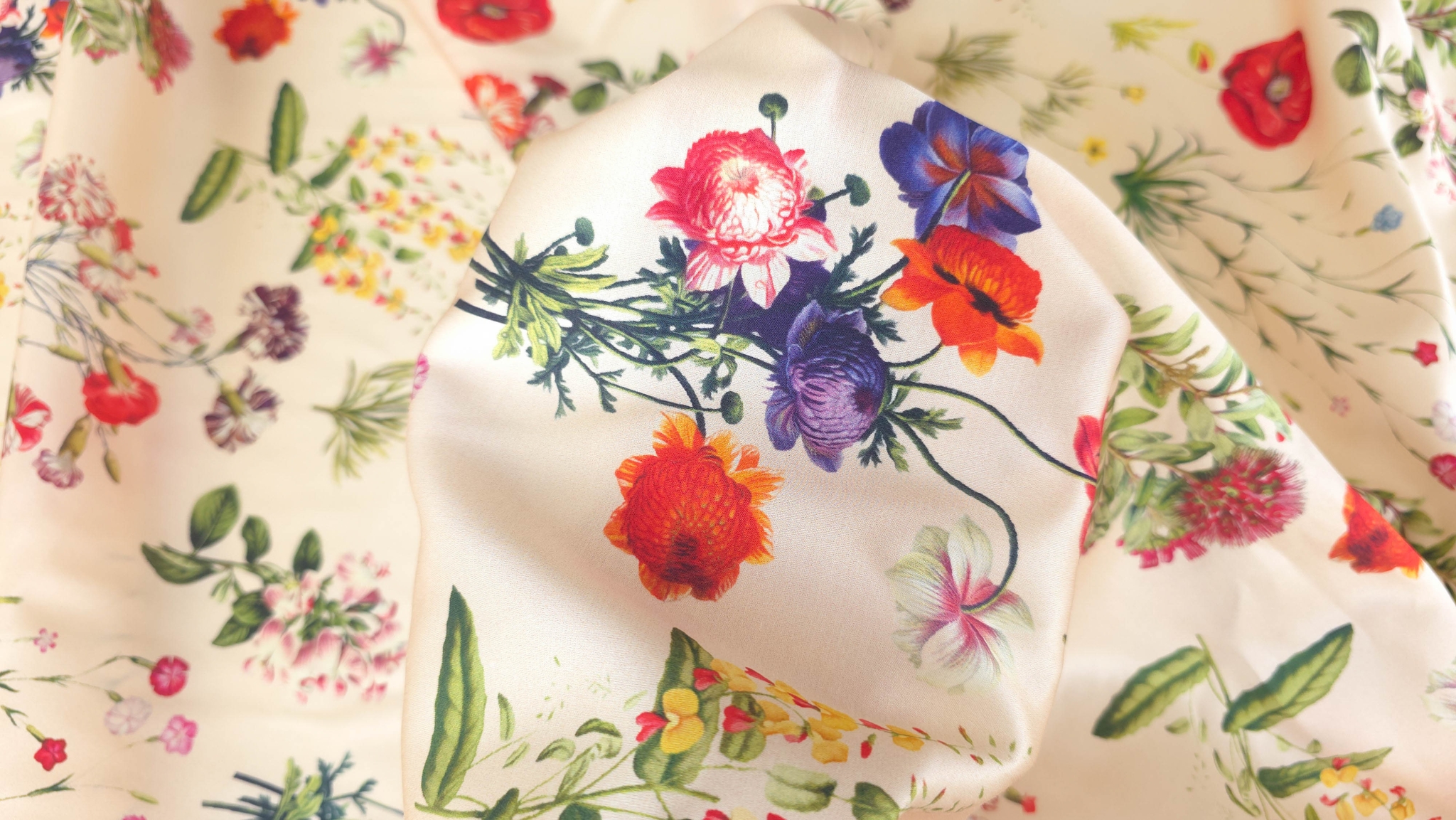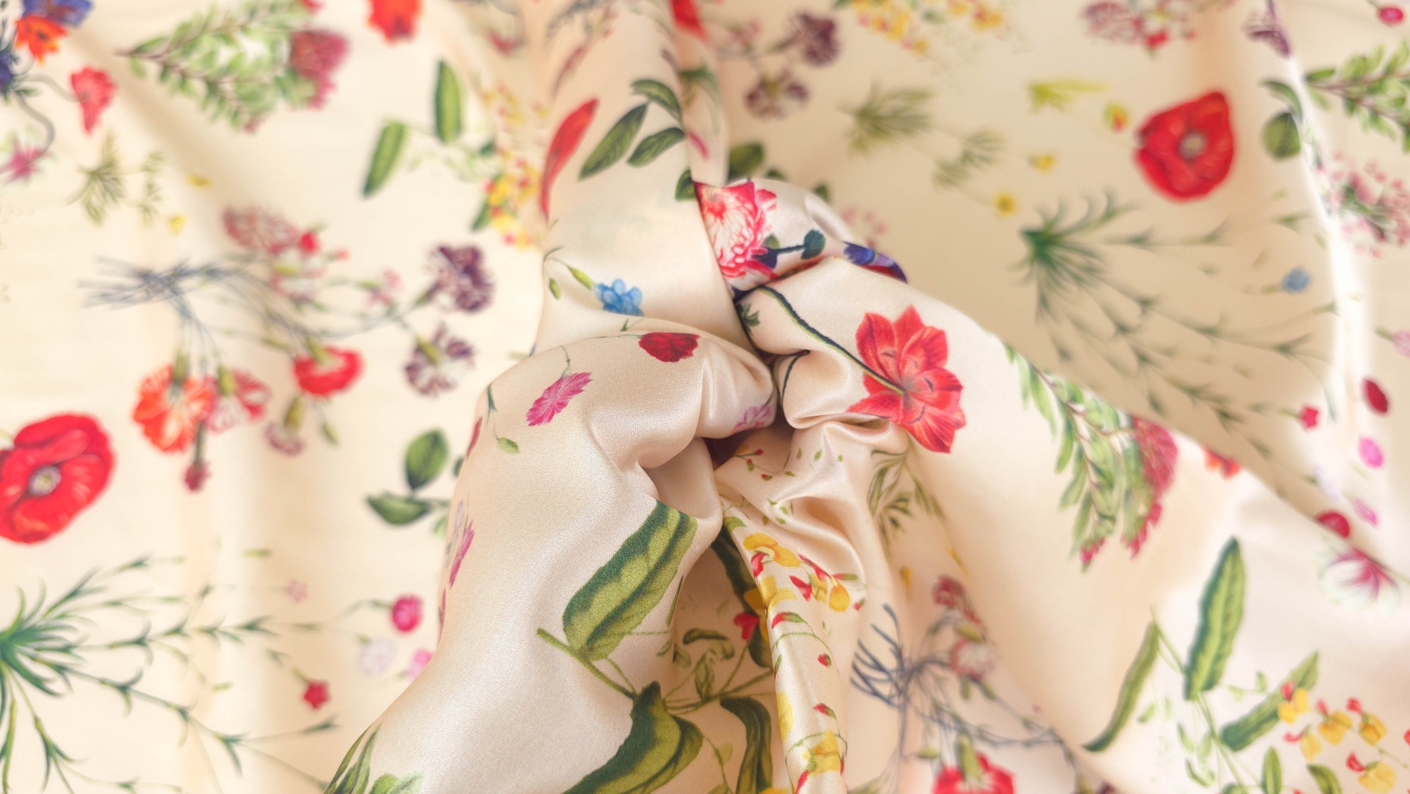 Satin imprimat cu matase naturala GBV1812 , model de inspiratie Giambattista Valli, cu imprimeu floral distribuit pe întreaga suprafață, ideal pentru confecționarea rochiilor sau a fustelor, a cămășilor vaporoase sau eșarfe. Satinul este cunoscut pentru textura sa fină, moale și lucioasă, fiind perfect pentru creații elegante.