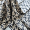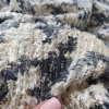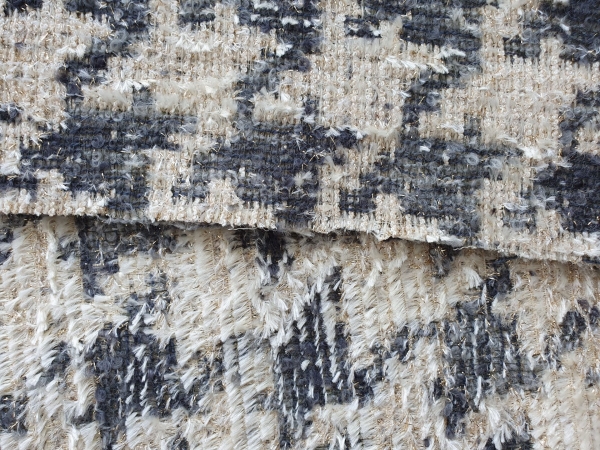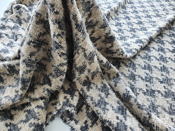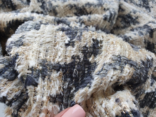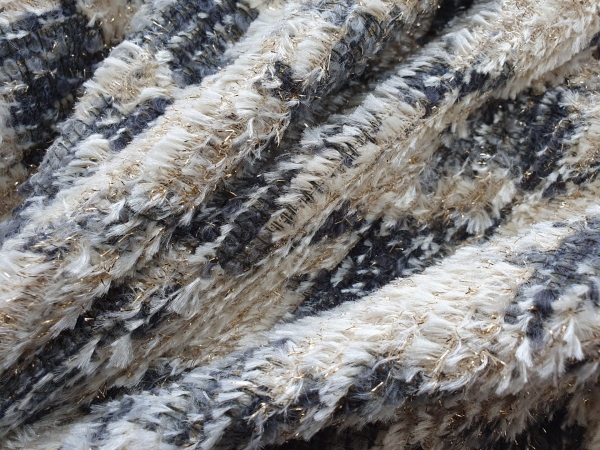 Stofa bej & gri cu matase si insertii metalizate, cu textura pufoasa, usoara si placuta la atingere.