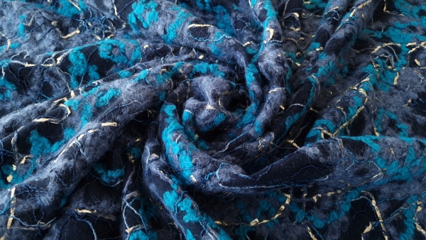 Stofa groasa impletita cu lana si insertii fir metalizat, textura placuta la atingere si purtare, foarte calduroasa.