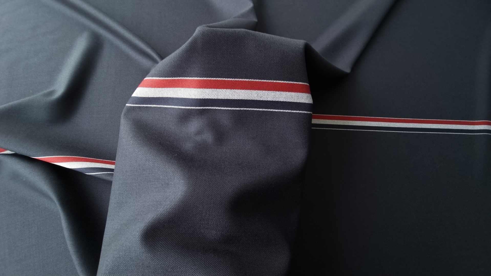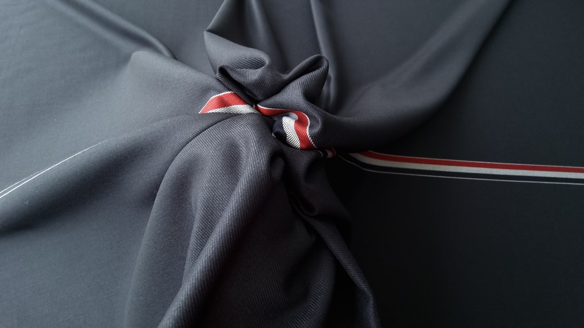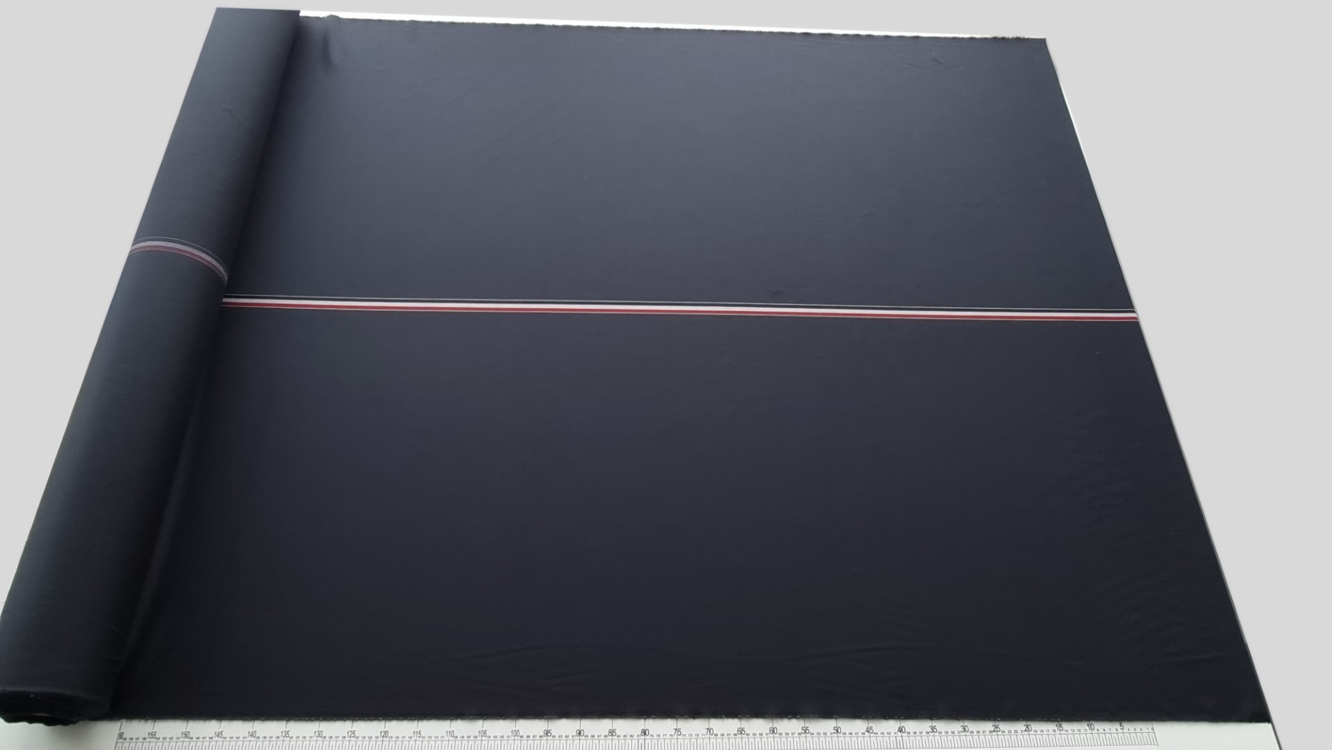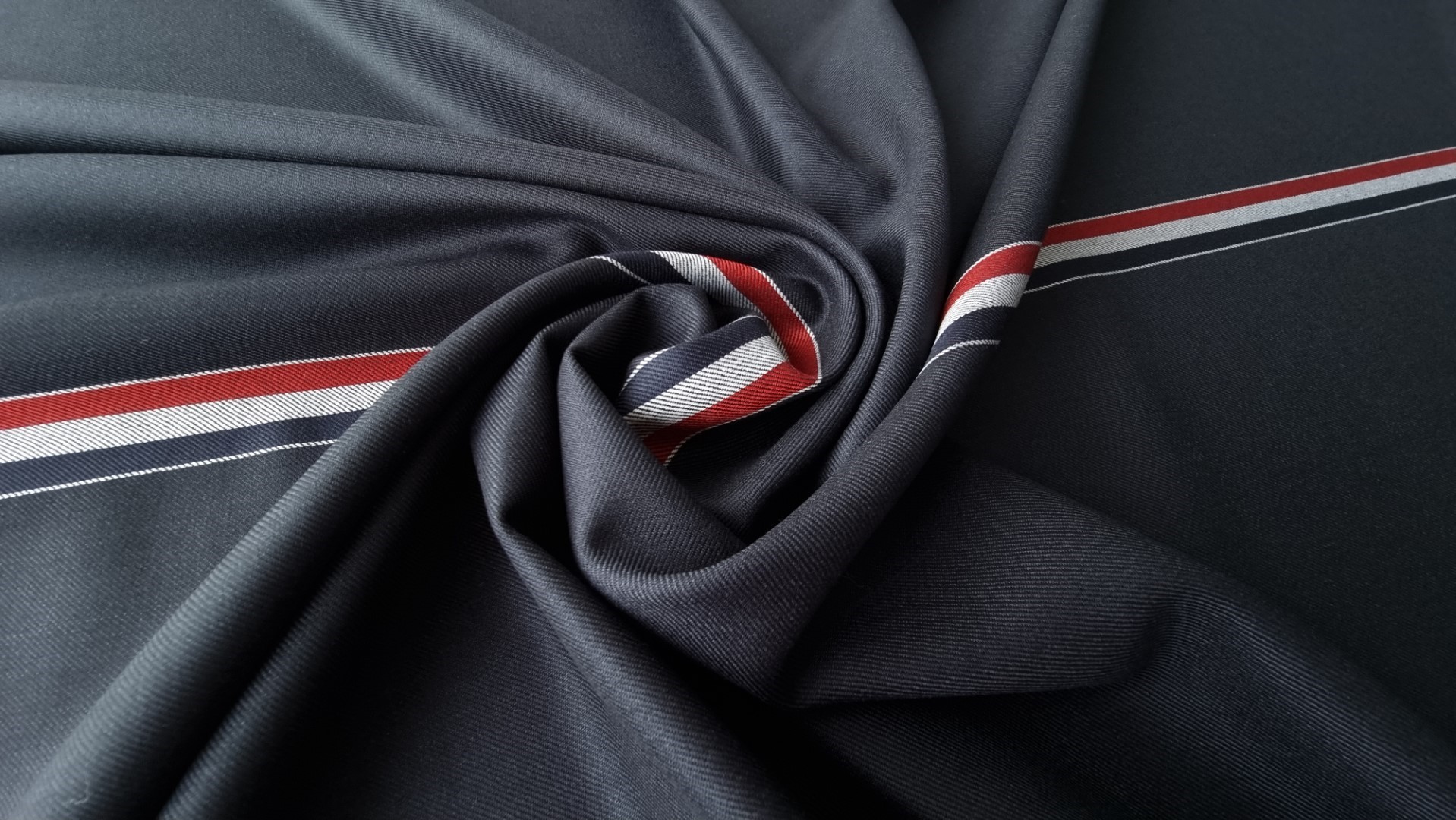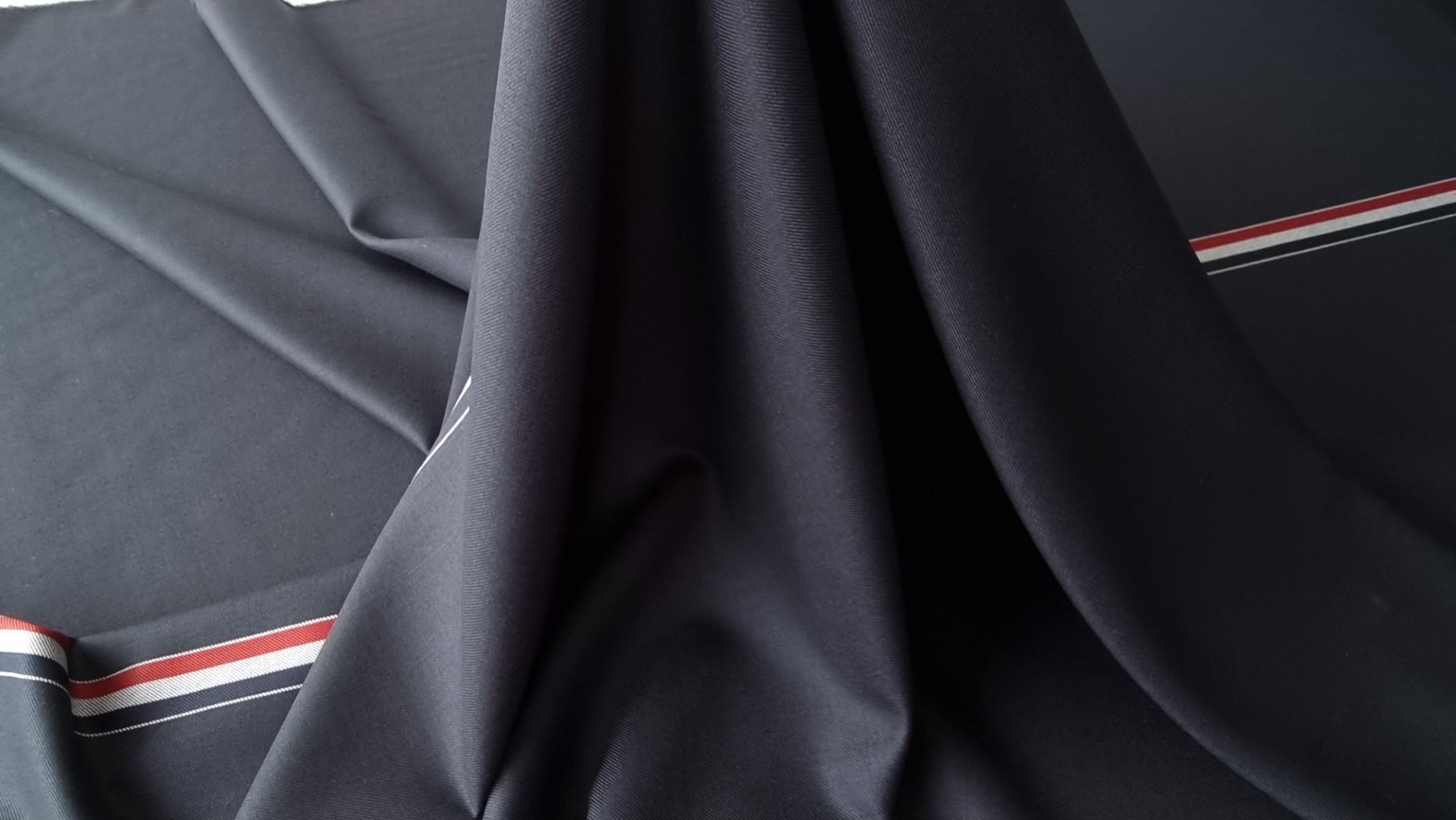Stofita neagra din lana THB1058, fara elastan, foarte placuta la atingere, ideala pentru realizarea costumelor, cu un model format din trei dungi unite pe lungime.