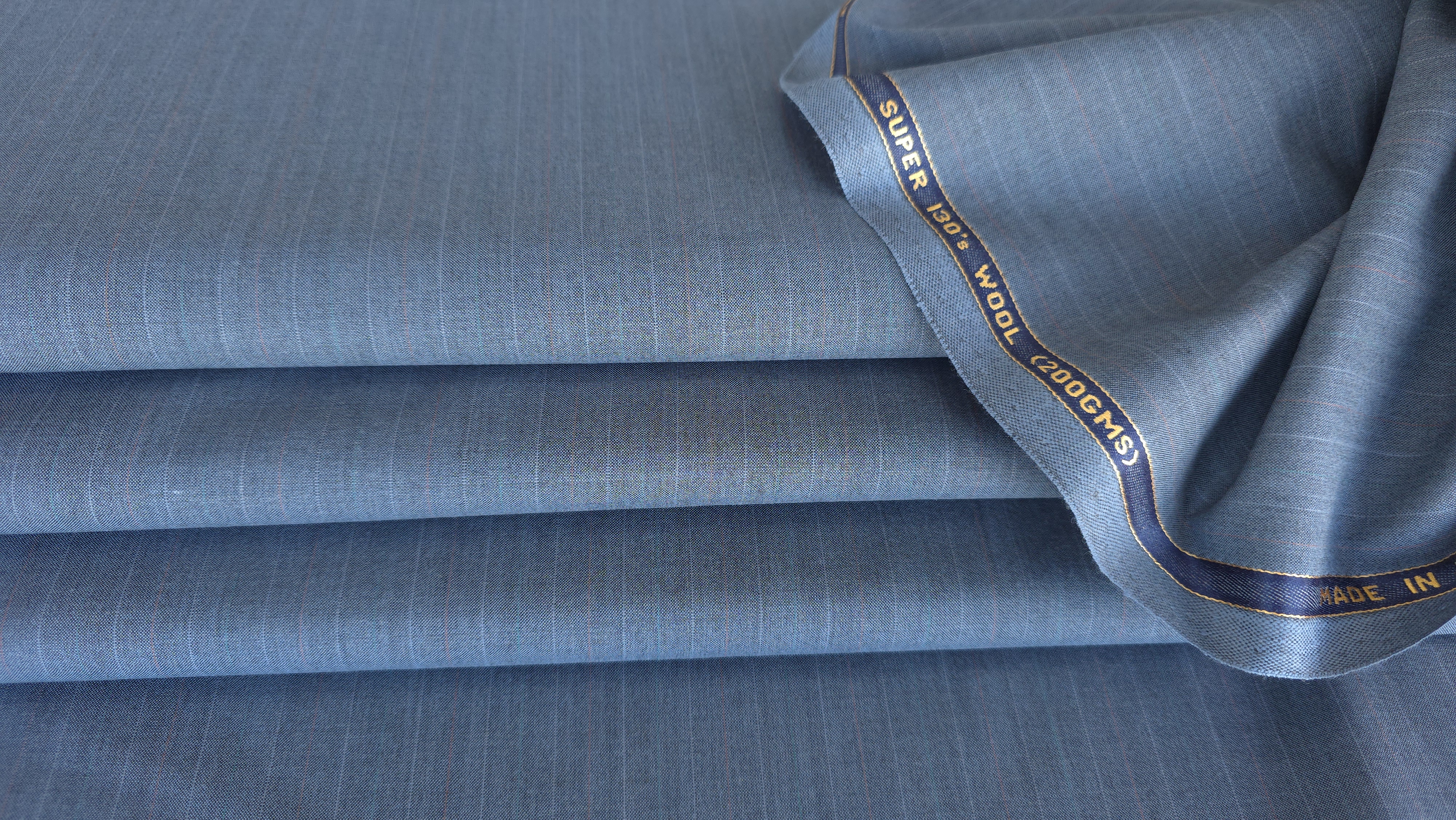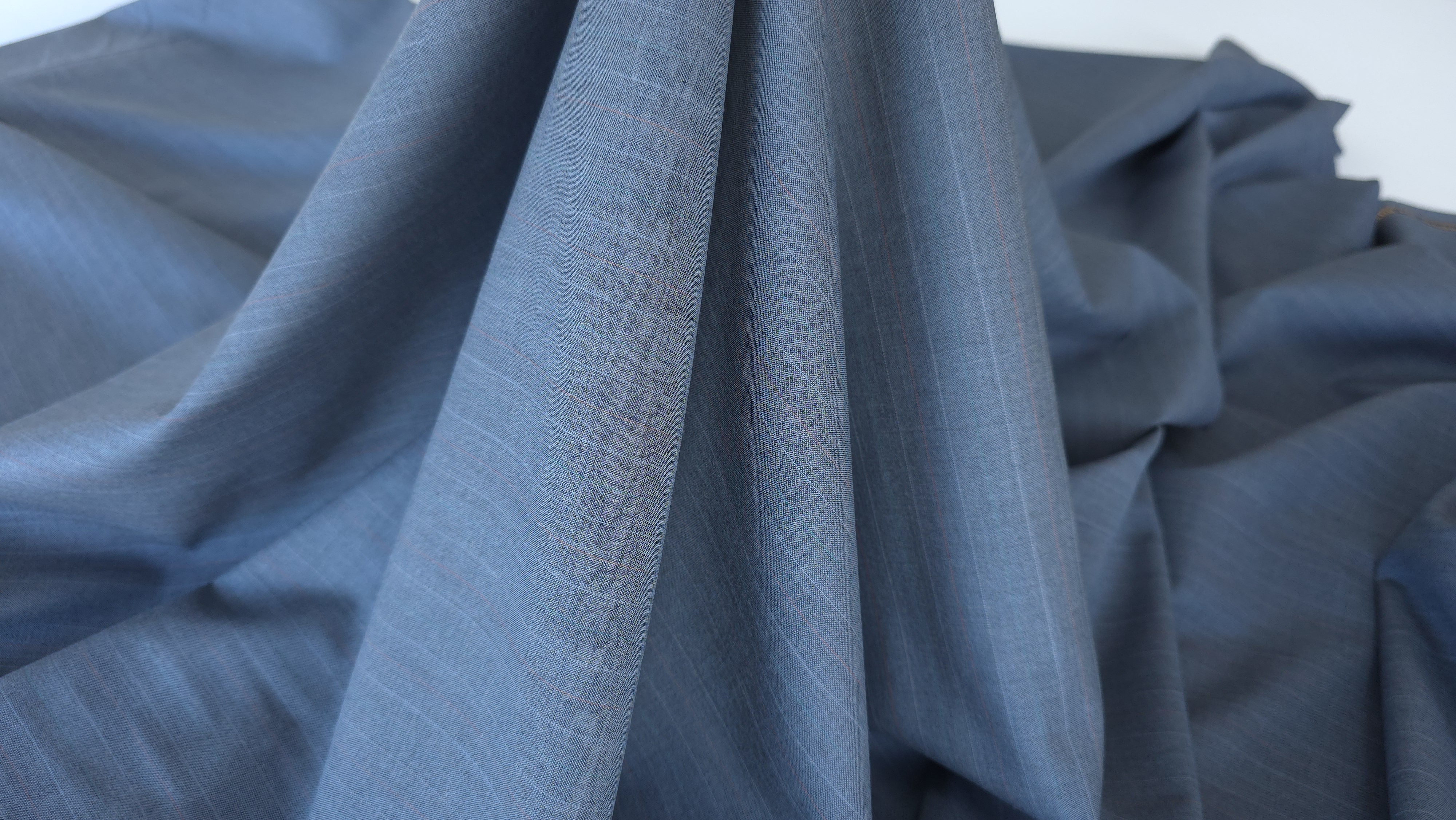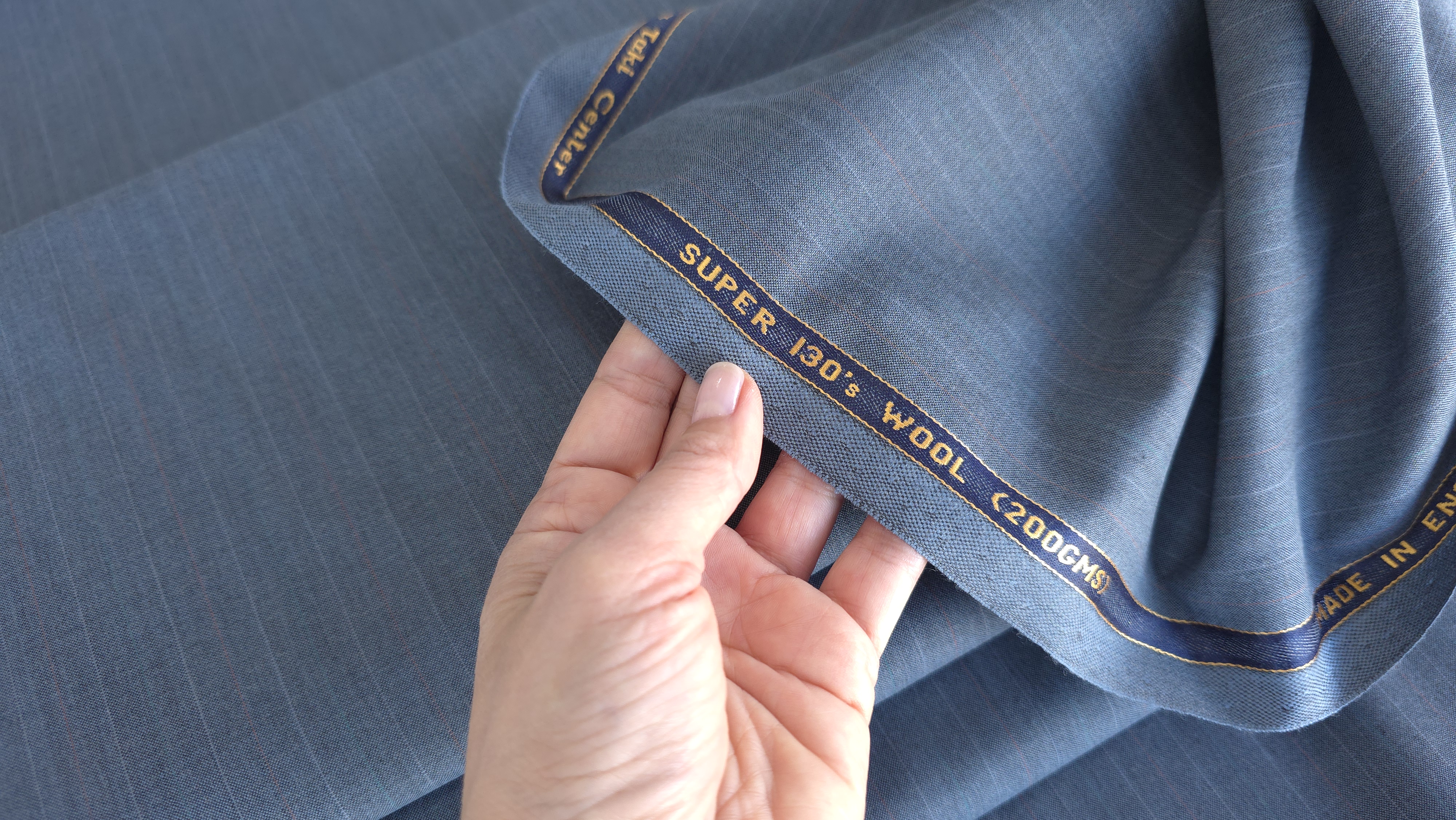 Stofă subțire gri Super 130s din lână 100%, țesută în Anglia, cu dungi foarte fine. Material premium, ușor și rafinat, ideal pentru costume, sacouri și pantaloni bespoke, cu echilibru între finețe și rezistență.